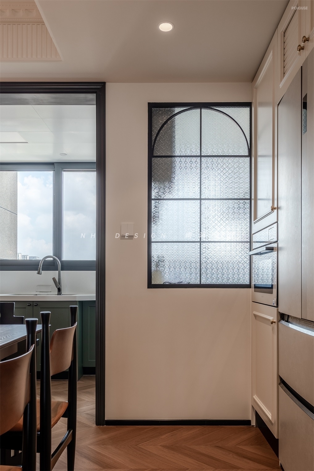 餐厨之间置入黑框压花玻璃窗,弱化墙体存在感,同时接引自然光,四季窗景变幻,自成一派诗意框景。