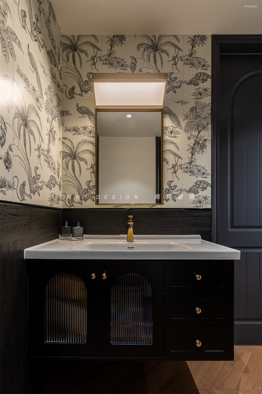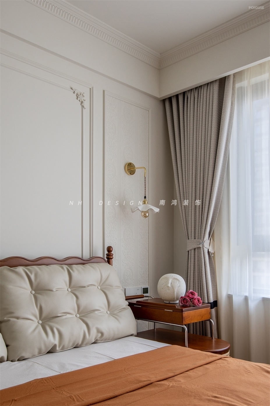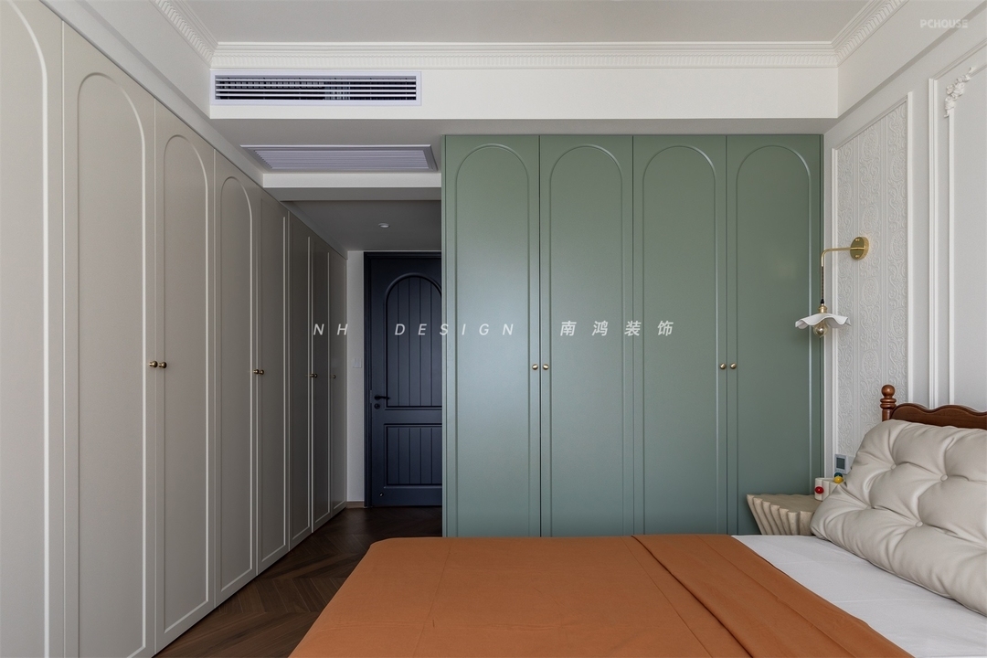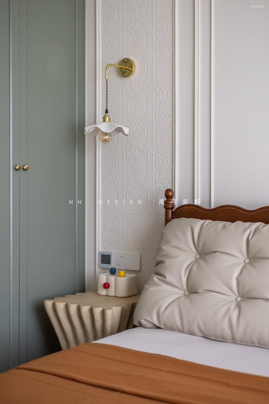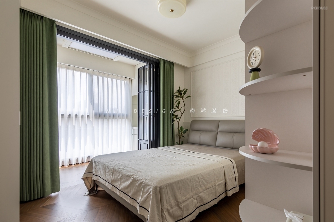 空间色系基础为奶fufu的杏仁色,质感的黑、稳敛的棕加持高级感,卧室区掺入清新的绿色,空间是复古的更是极为生动的。