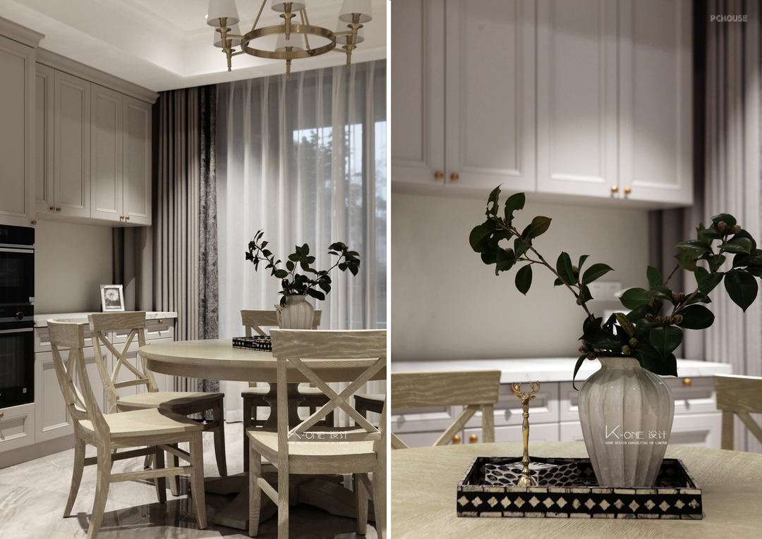餐厅想要兼顾实用性与颜值,餐桌挑选浅绿色的圆桌以柔软的弧度方式呈现,增加空间尺感的同时隐去空间的生硬,回归自然温暖的视野。同时能满足父母来访朋友聚餐时用餐。