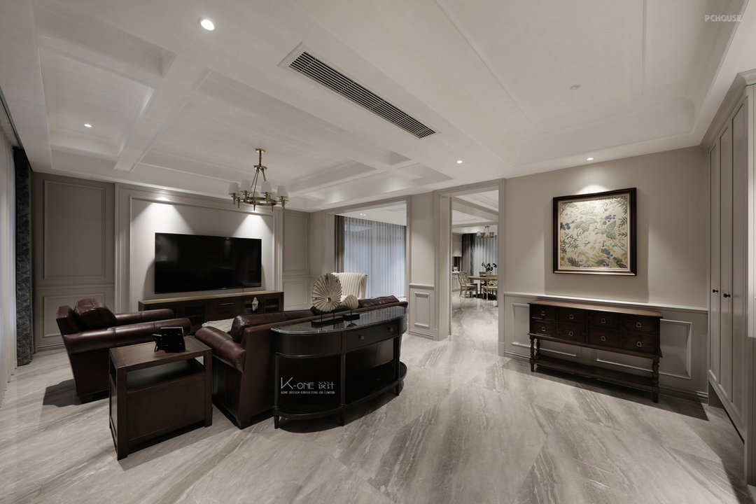 随风入客厅,生活空间徐徐展开。硬装大面积采用白色,软装配咖色的家具,挂画、摆件,作为软装点缀,凸显出一种更高级的精致。半围合式的沙发和低饱和色的地砖,在超大的公区里,形成了特有的“小气候”。
