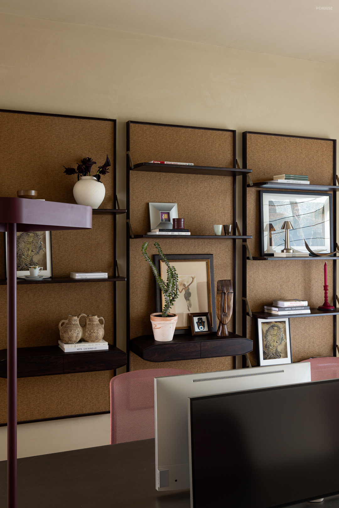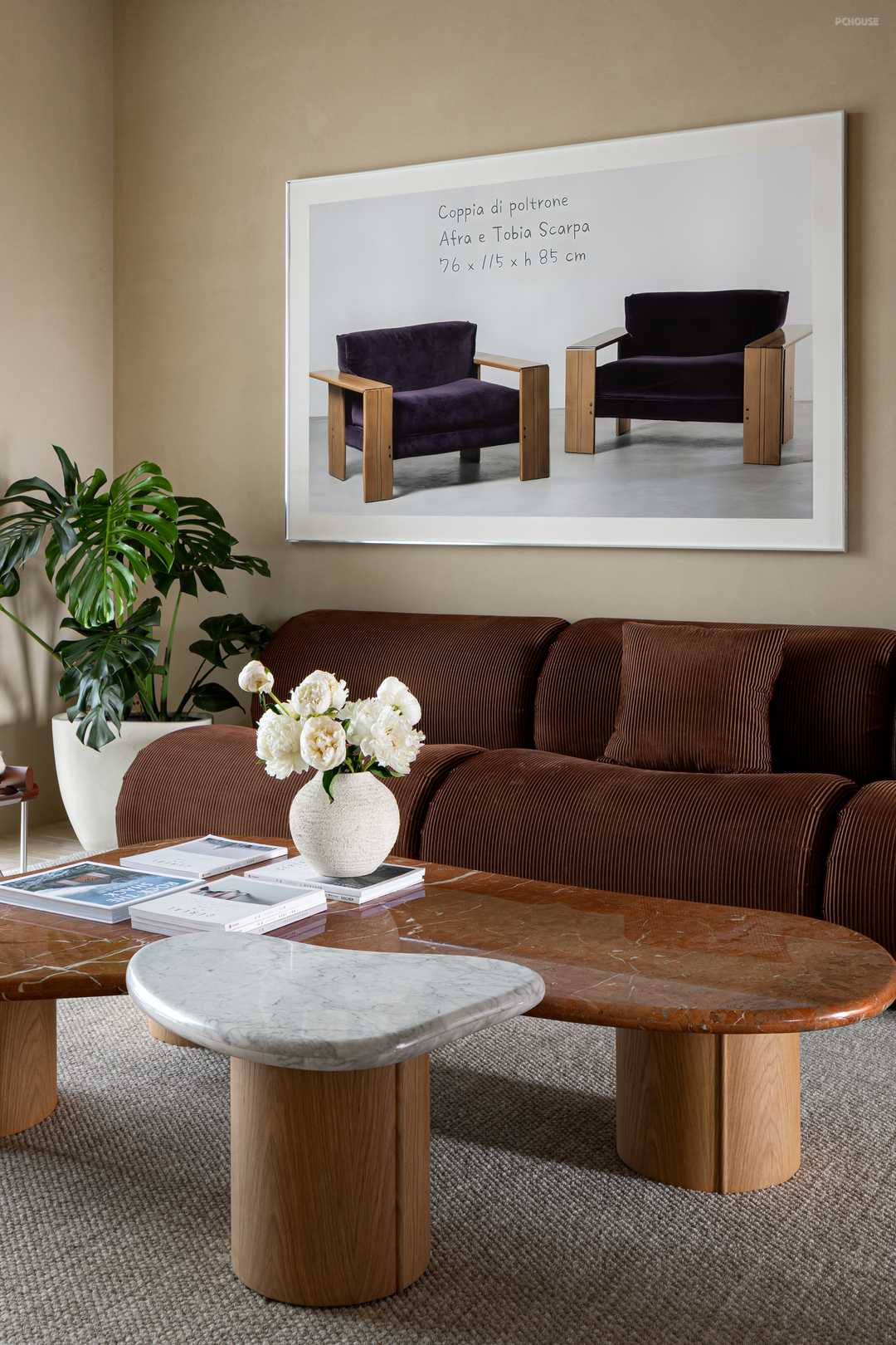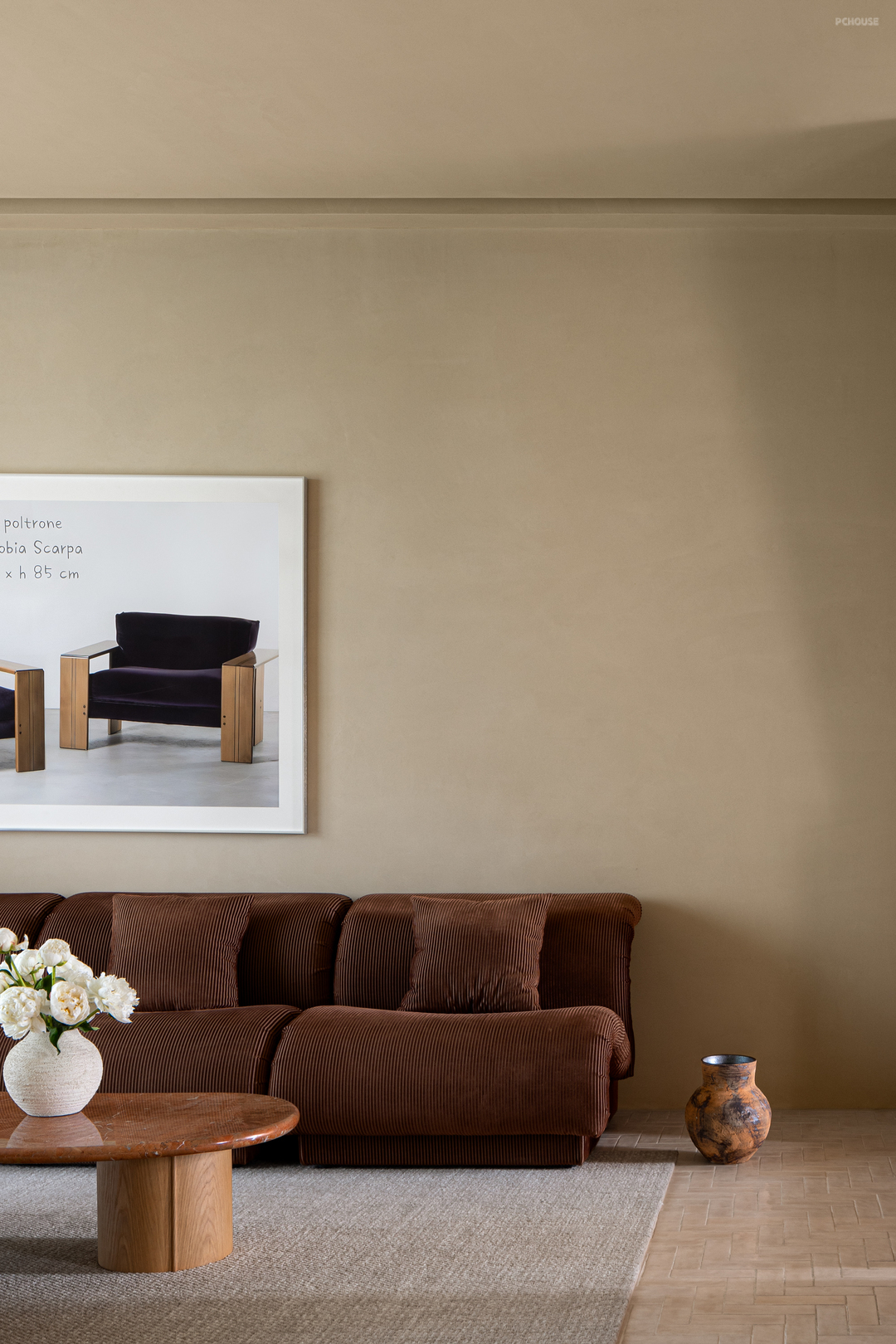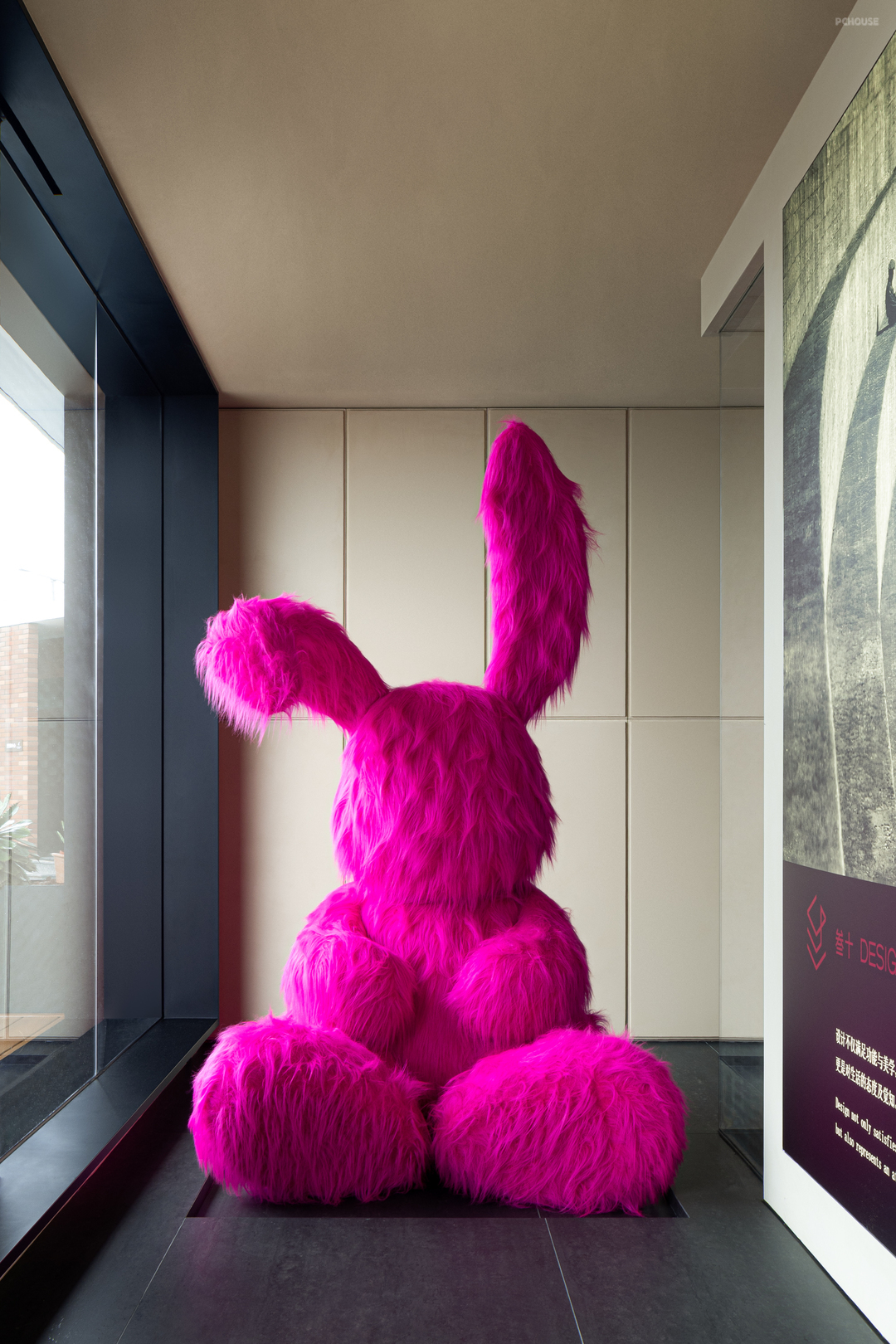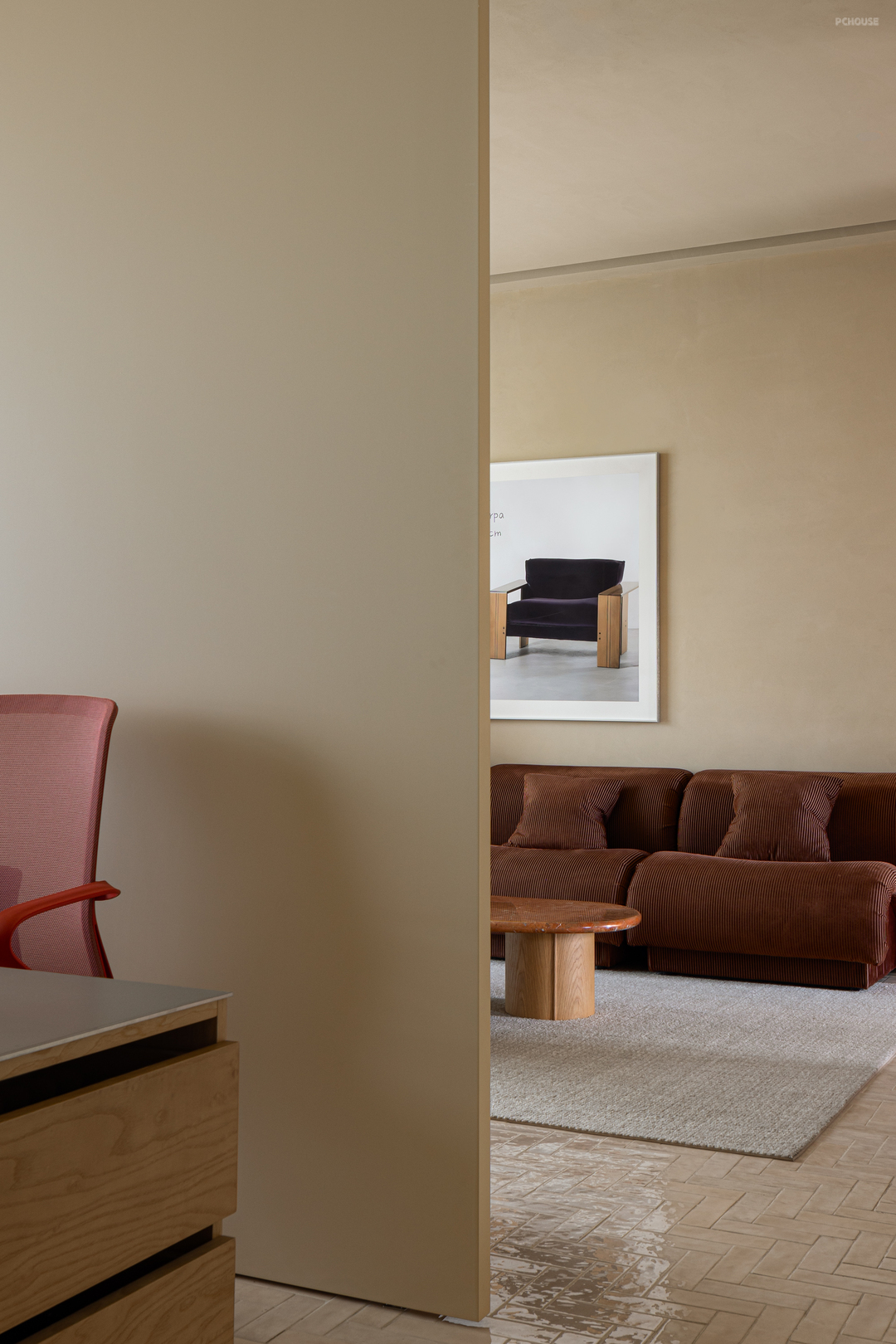 商业空间上的家具选择,我们考虑到了舒适度,且把控好美学上的尺度。我们定制了HUDDERSFIELD香槟色灯芯绒面料,将Doimo沙发包裹起来。柔软、富有弹性,可以充分环抱你的身体。空间中再点缀小体量的玫红色,激活空间色彩。充满活力又凸显公司文化。