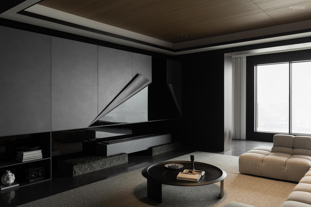 我们通过金属与天然石材的巧妙融合,传达了女主人为母则刚、坚韧不拔、独立自信的气质。钢板的柔性弧线与玻璃的光泽交相辉映,恰如女性温婉中蕴含坚韧,两片书页般翻角体现了女性独有的柔美气息。