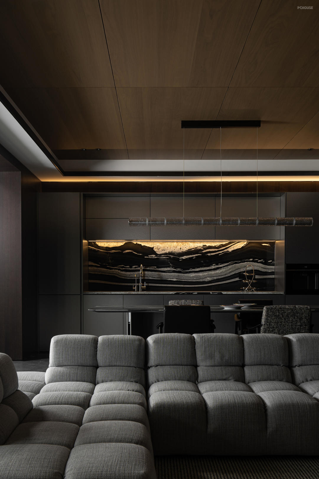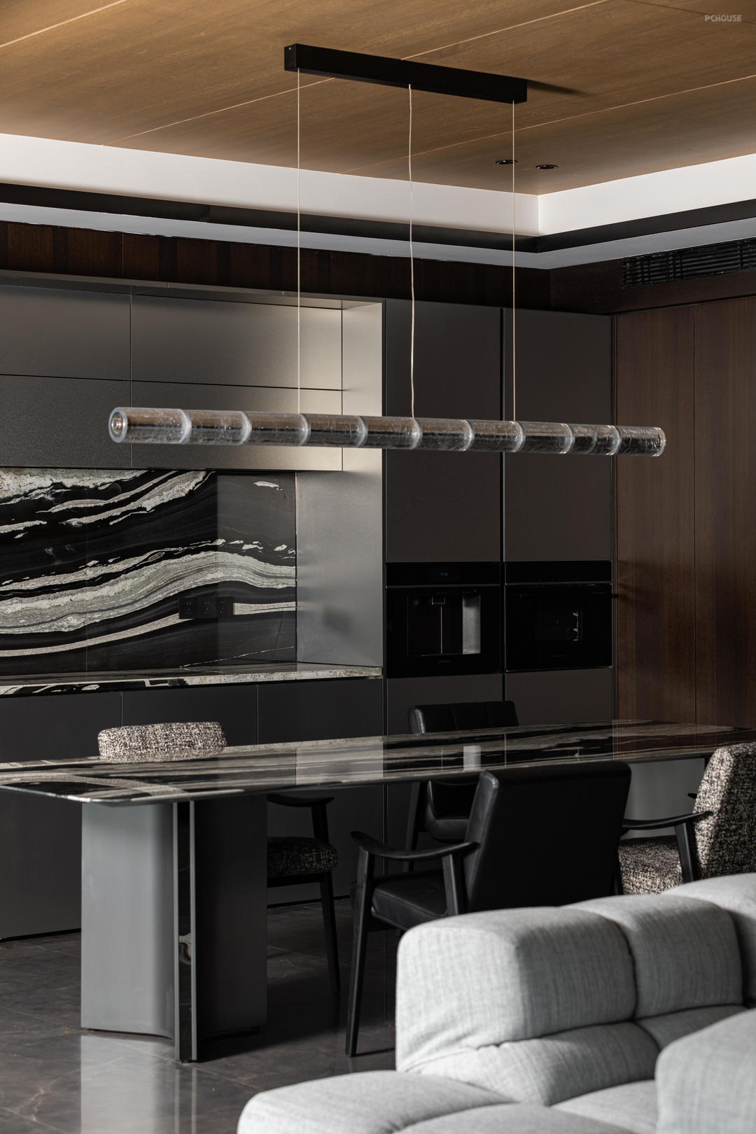 宽阔的就餐台及厨房墙面均以波浪般起伏的千里马石材铺陈,肆意展现大自然质朴淳美的神韵;而简洁利落的几何线条灯具与椅子,则彰显现代主义的精雕细琢,两者在视觉上形成有趣的张力与对比。