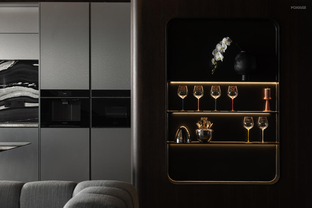 酒柜里的金属与玻璃光泽与木质朴素的视觉碰撞,是现代与传统的风格交融。玻璃与金属装饰物的有趣对比,体现了独具匠心的用材巧思,彰显出这件家饰的非凡品位与审美意蕴。
