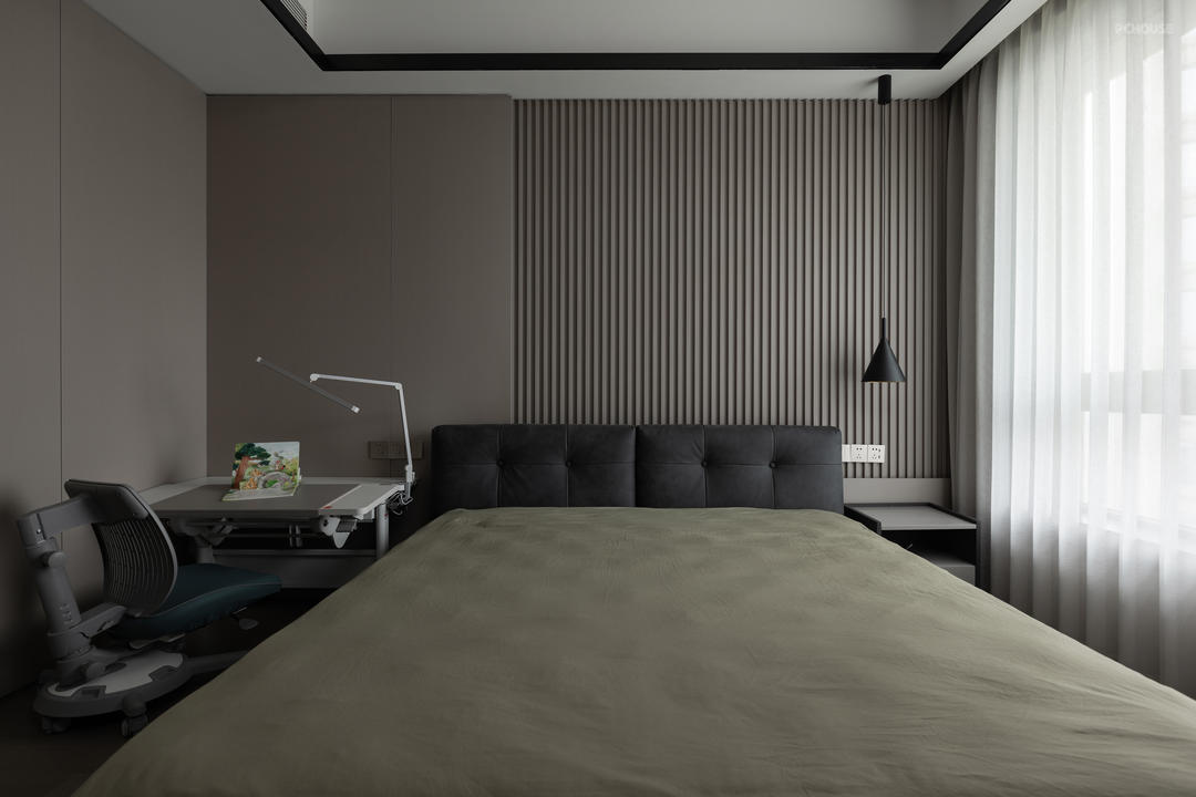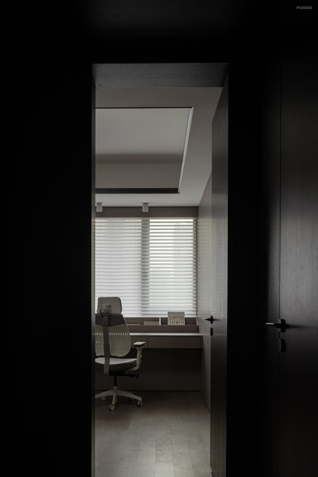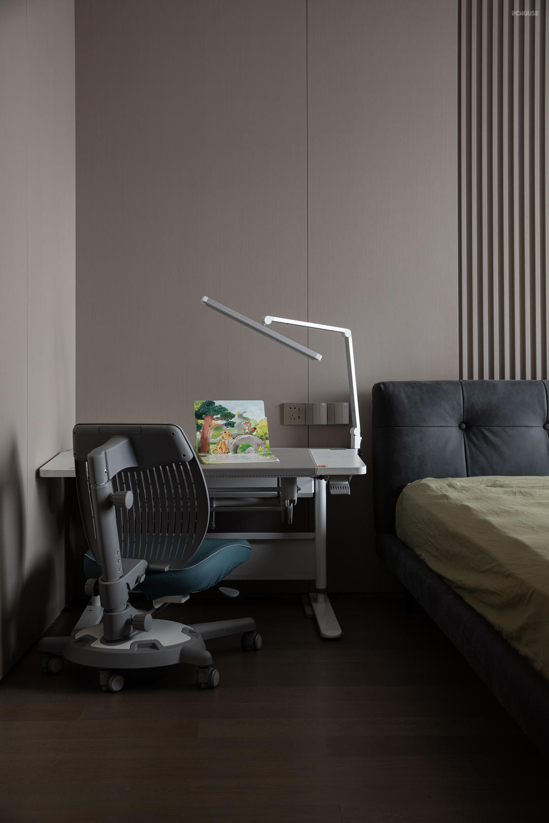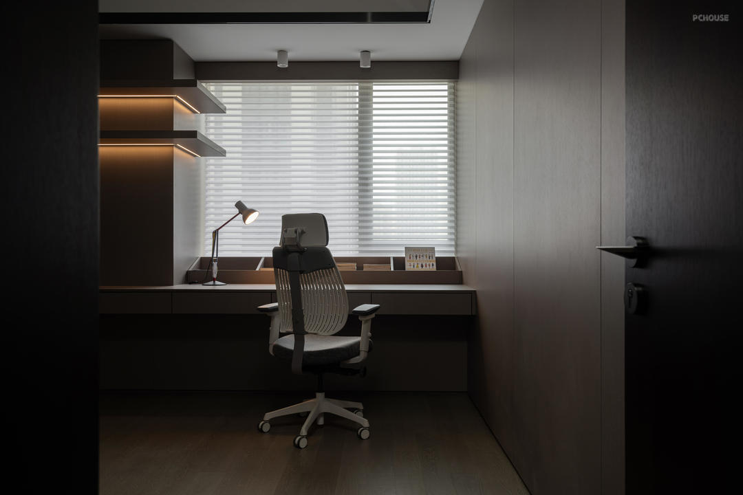 书房如一幅静谧的画卷,低调内敛的色调勾勒出内省的氛围。整个空间布局精心巧构,现代简约与传统文化在其间流淌交错,缓缓展开一幅诗意画卷。实木书桌如一潭沉淀的墨痕,寓意着主人对知识的渴求;舒适的人体工学座椅则像是引领智慧之航的穆舟。窗外淡淡光线透过百叶窗的缝隙,在室内投射出朦胧暧昧的光影,宛如一场雅致的文人对酌。