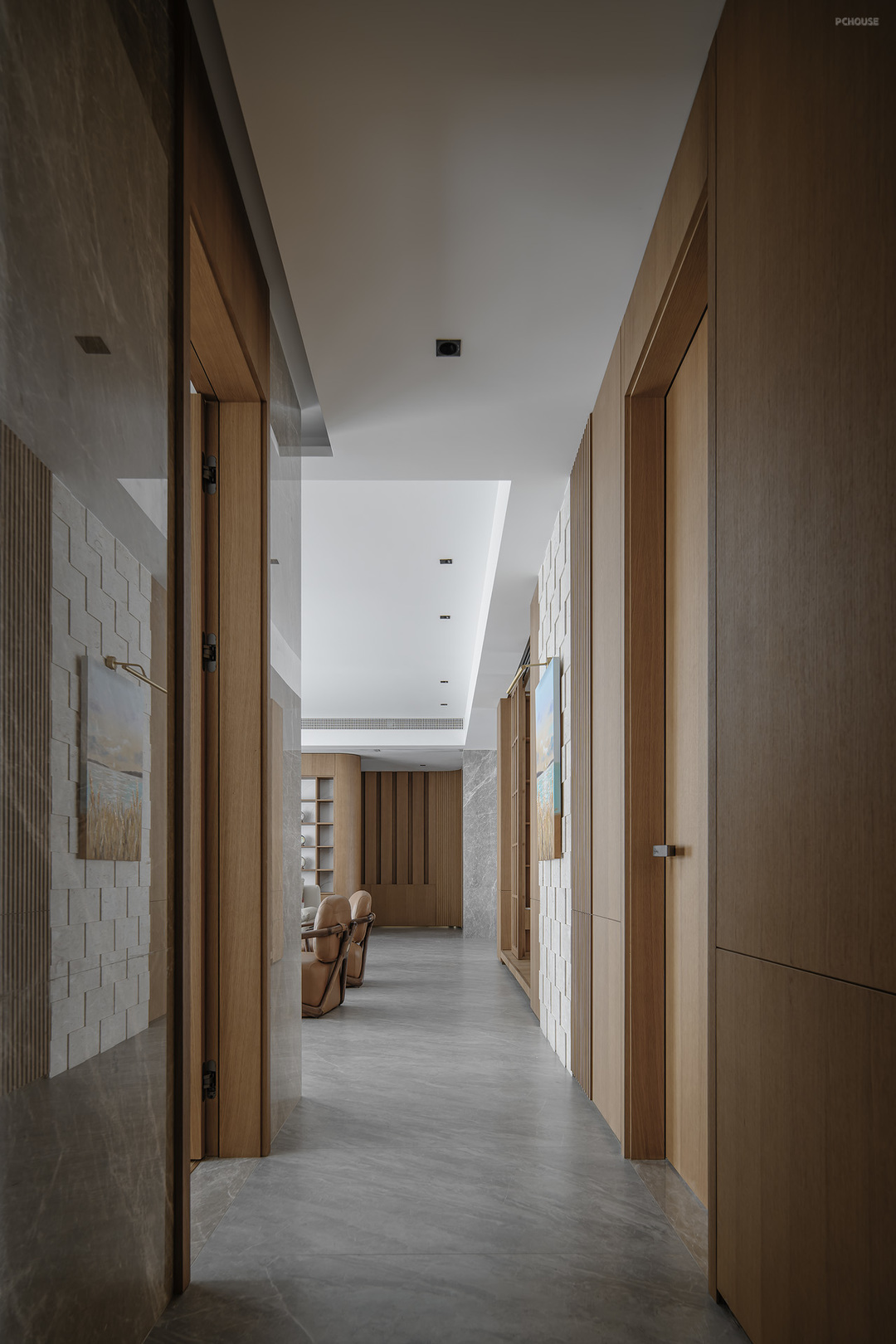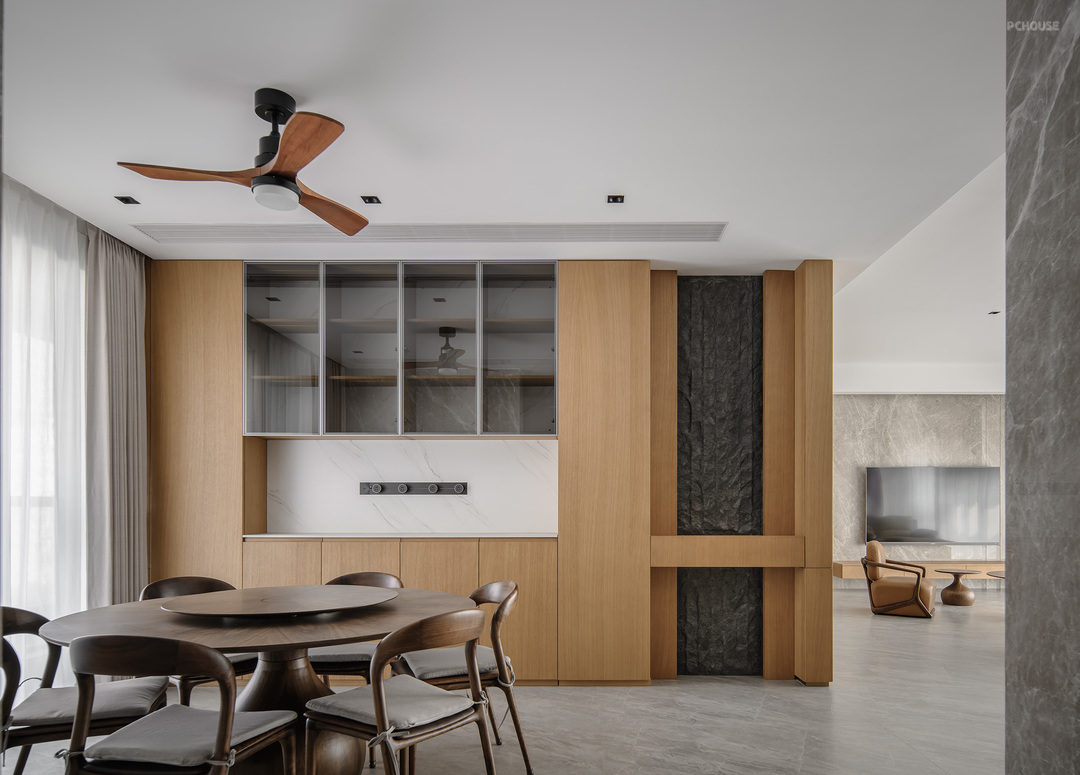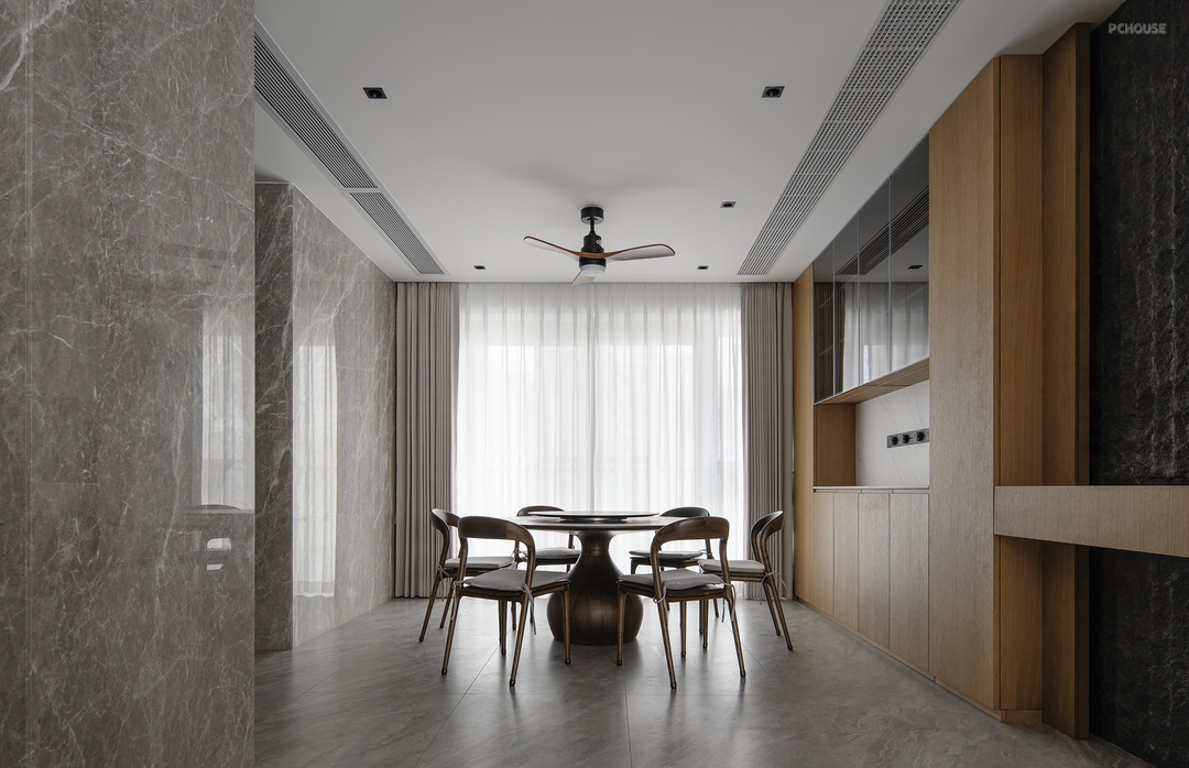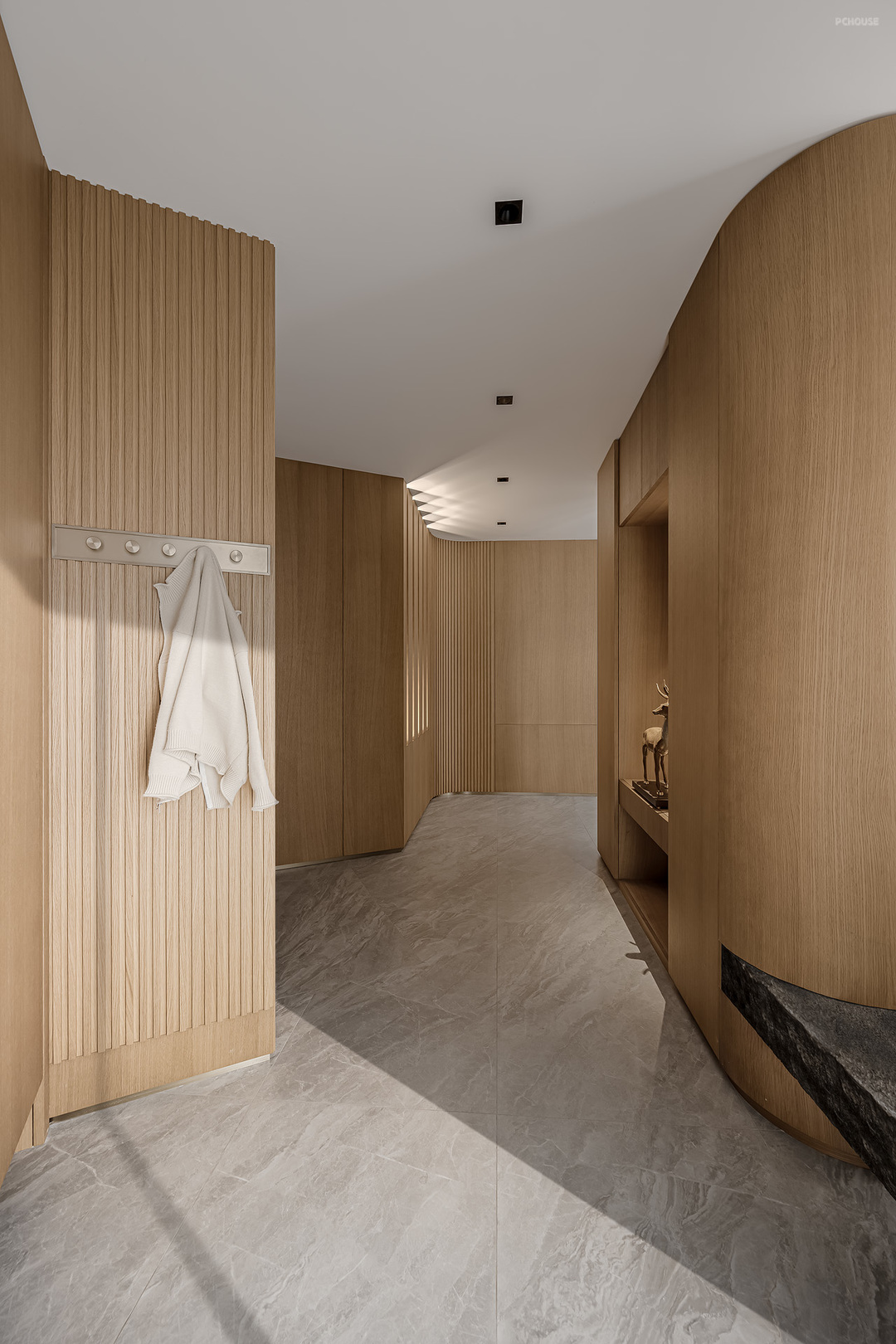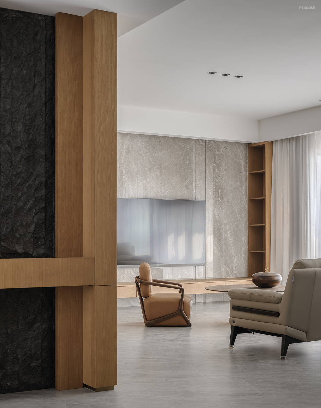 灰色系天然大理石与拿铁色实木皮交织成自然沉稳的底色,宛如一幅静谧的山水画。餐厅与玄关的斧劈石墙面增添了粗犷的质感,肌理漆的柔和触感使空间如同轻柔的海浪,带来宁静的心境。通过对景手法,强化了空间的层次感,仿佛置身于大自然的怀抱。