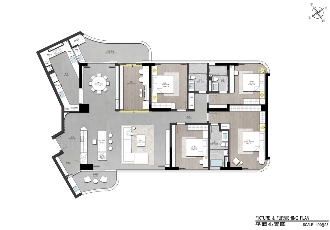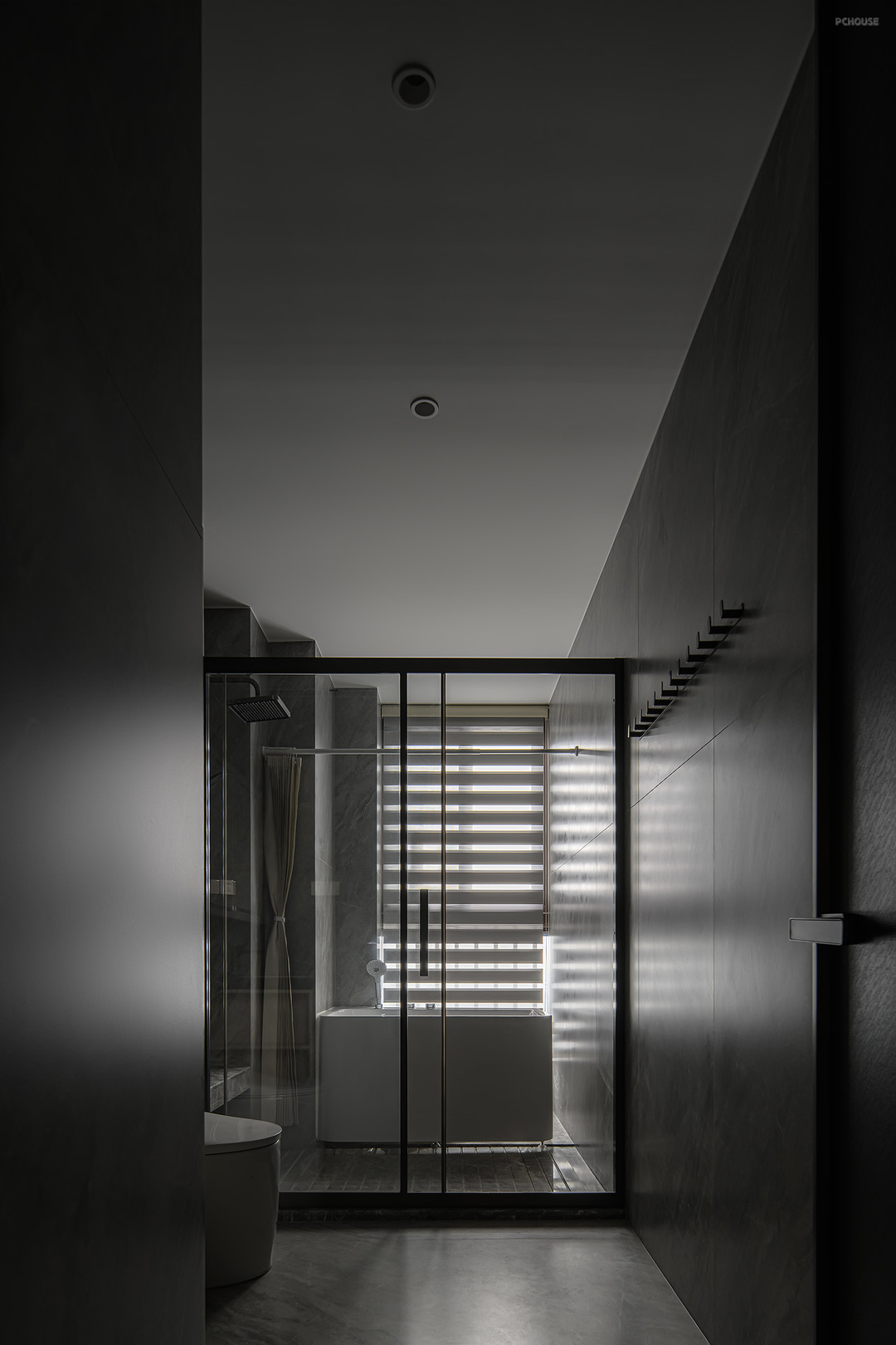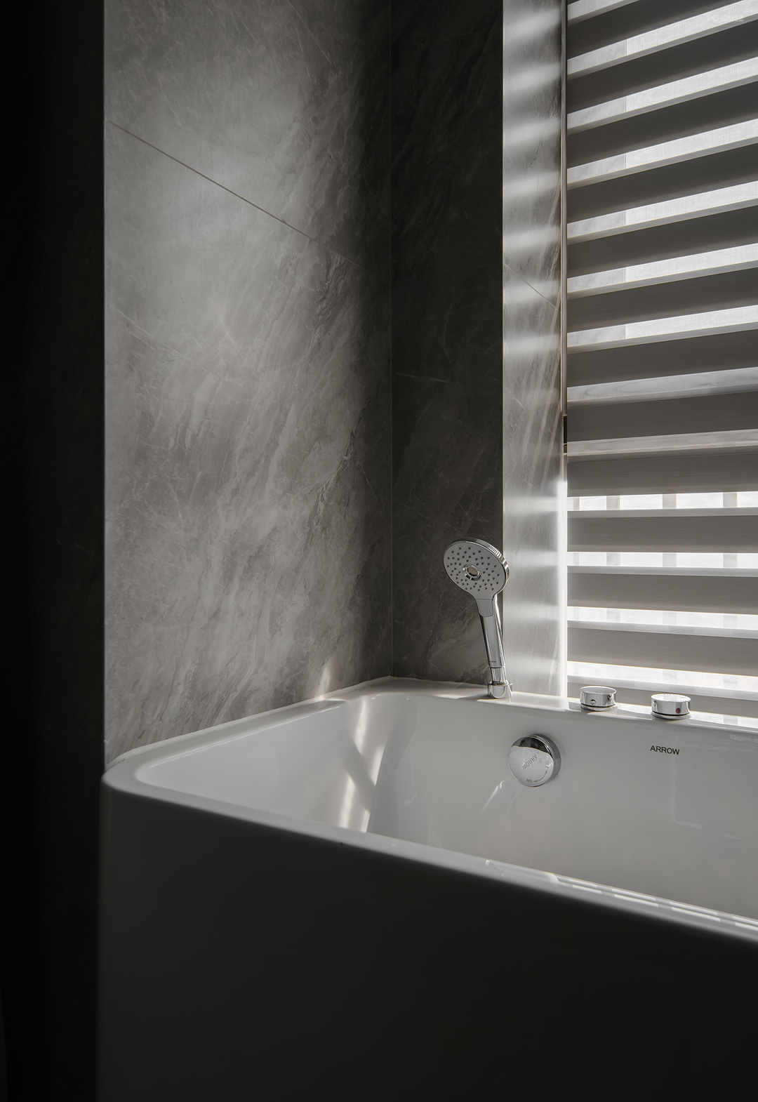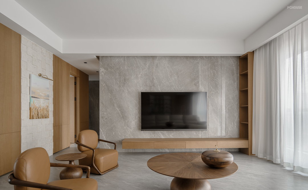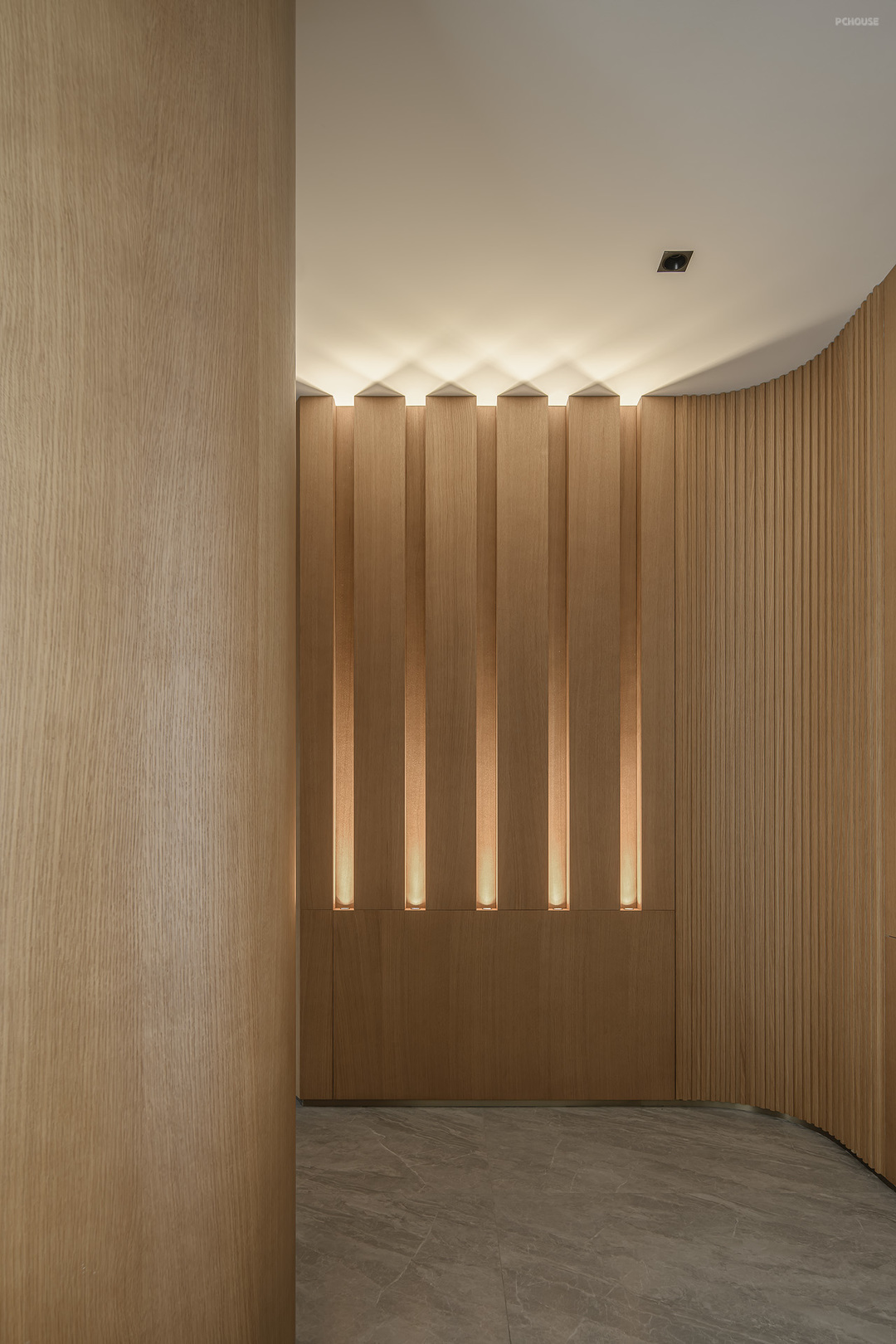 灰色系天然大理石与拿铁色实木皮交织成自然沉稳的底色,宛如一幅静谧的山水画。餐厅与玄关的斧劈石墙面增添了粗犷的质感,肌理漆的柔和触感使空间如同轻柔的海浪,带来宁静的心境。通过对景手法,强化了空间的层次感,仿佛置身于大自然的怀抱。