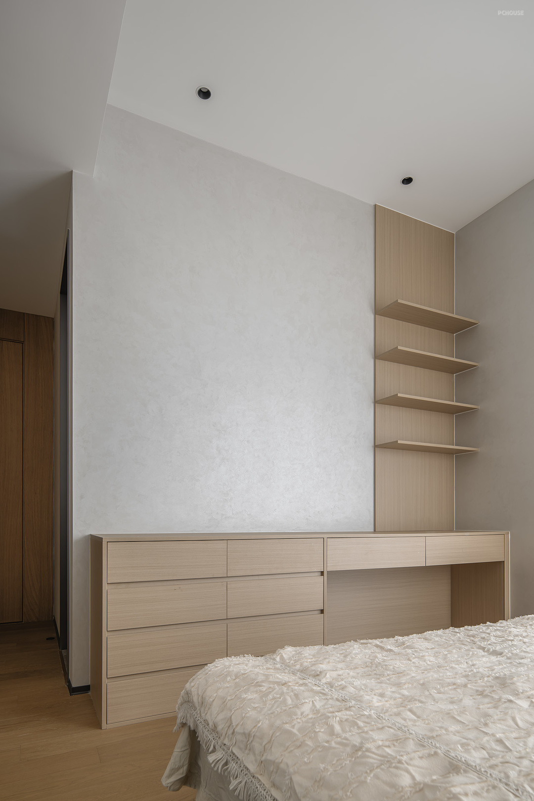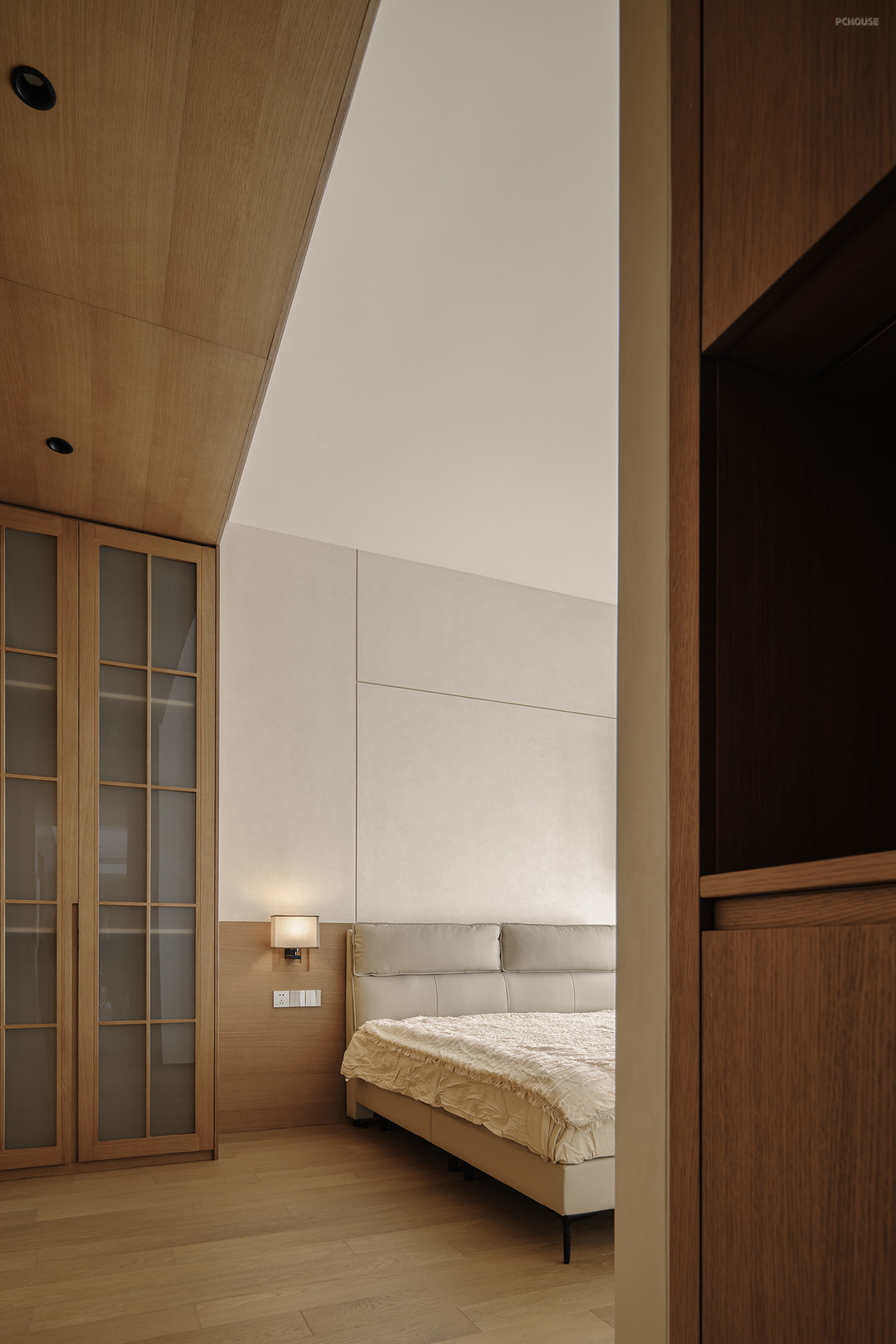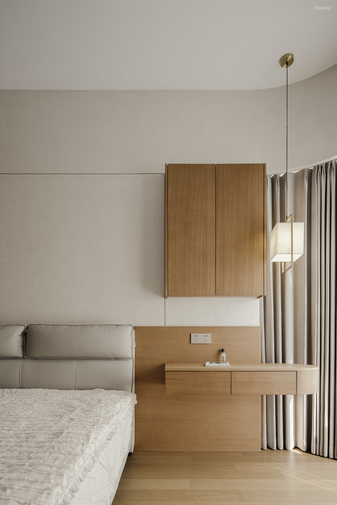 原主卧的空间配比较小,将之前走道空间并入主卧,拓宽主卧面积,同时增大衣帽间,满足日常衣物的收纳。并在入口处做迷你吧方便卧室饮水及随手放置小物件。沿用全屋整体色调,木饰面增加质感,床头的壁灯与吊灯形成上下呼应关系,营造温馨舒适的休憩氛围