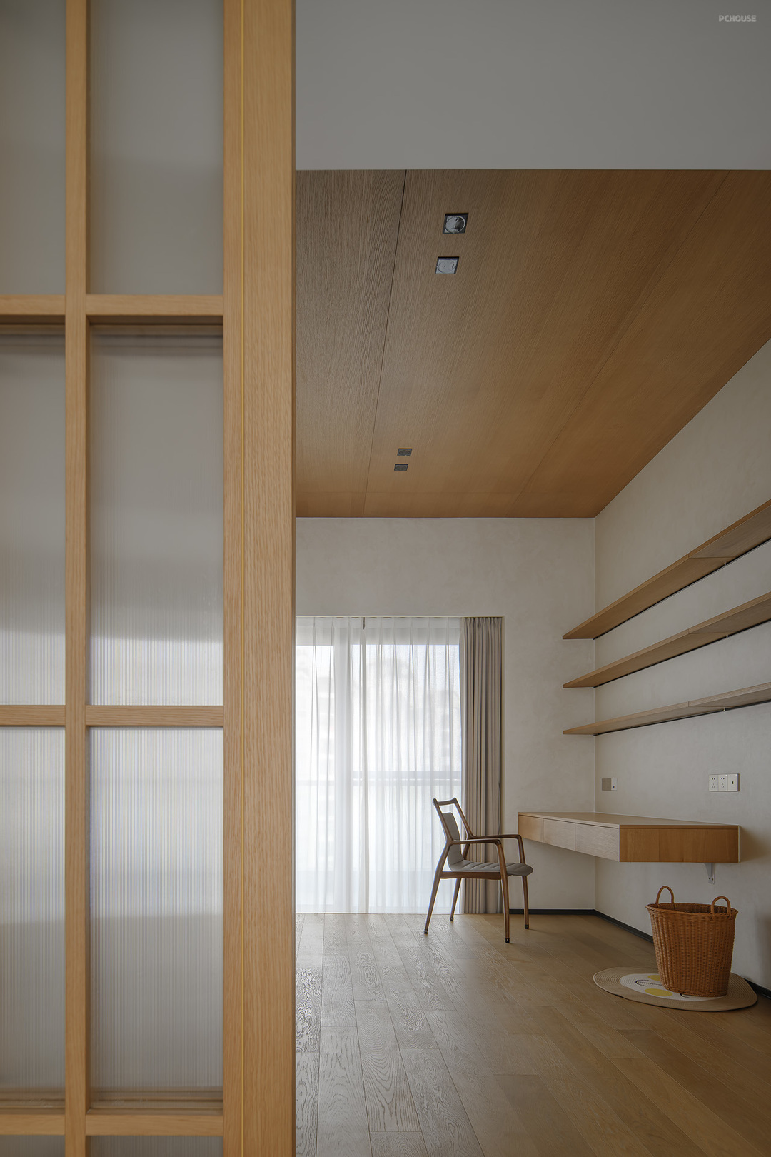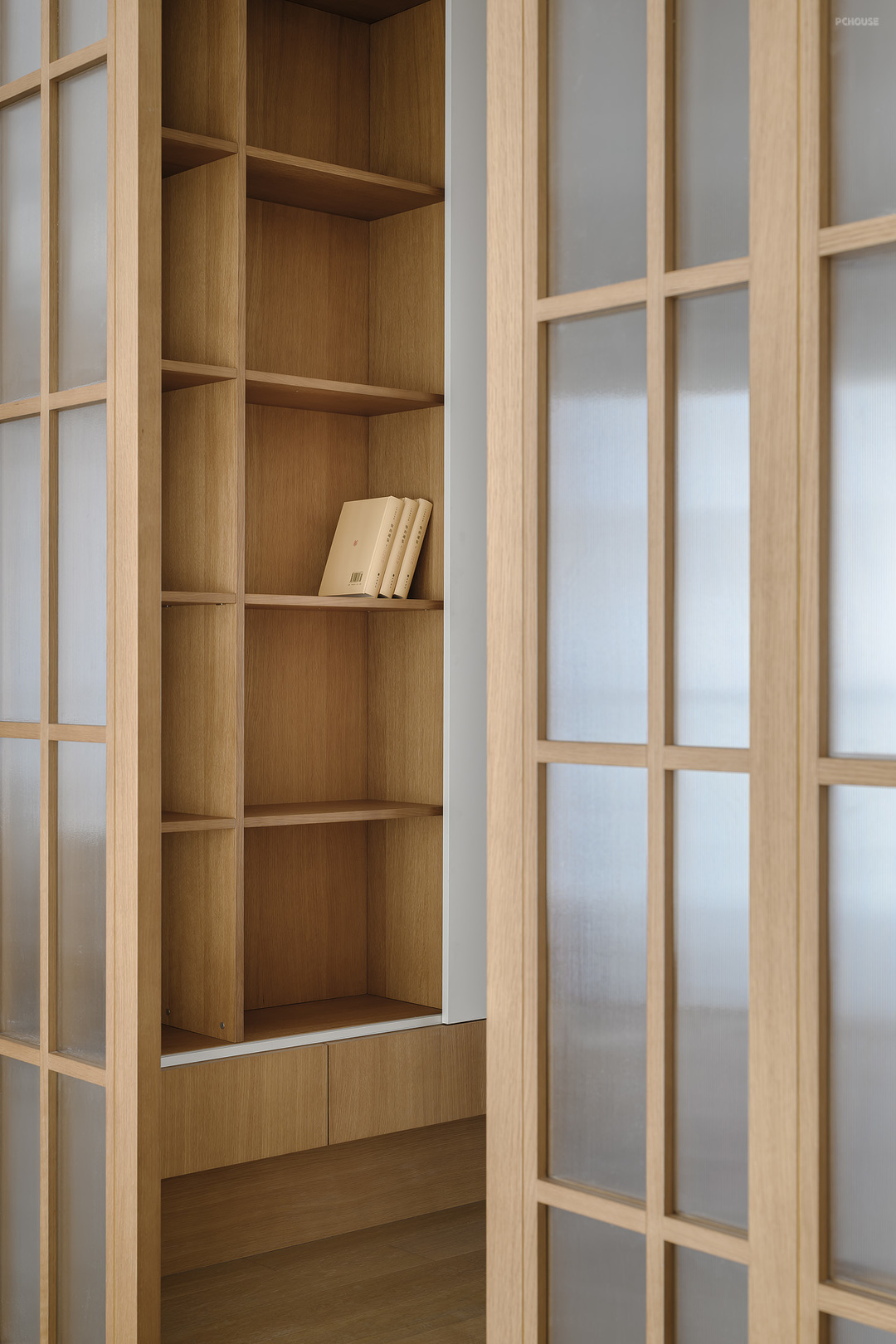 做成抬高”和室“书房,四扇推门增加”和室“韵味,增加南北对流,日常作为书房和琴房使用,整面书墙,为爱看书的业主一家提供惬意的阅读空间,书柜移门可自由选择开合部位;偶尔有亲朋留宿时,也可以直接铺上床垫当临时卧室。角落预留有备用衣柜,可以储存临时用的床品及客用衣物