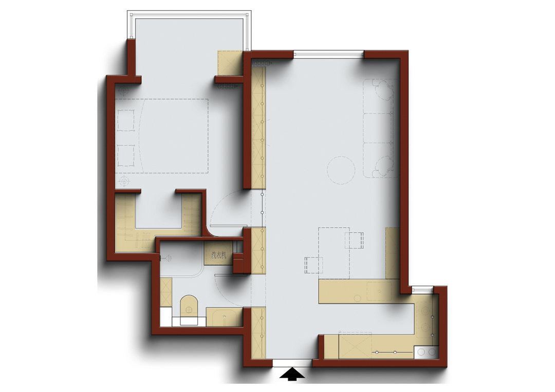 卧室入门,也是入寝放松的前奏,不宜直白尖锐。因此入门角落处特意设置了一定的弧形,进行舒缓过渡。