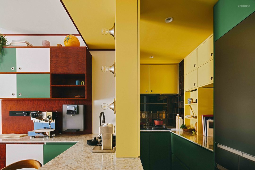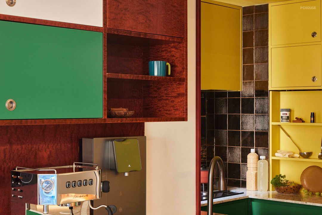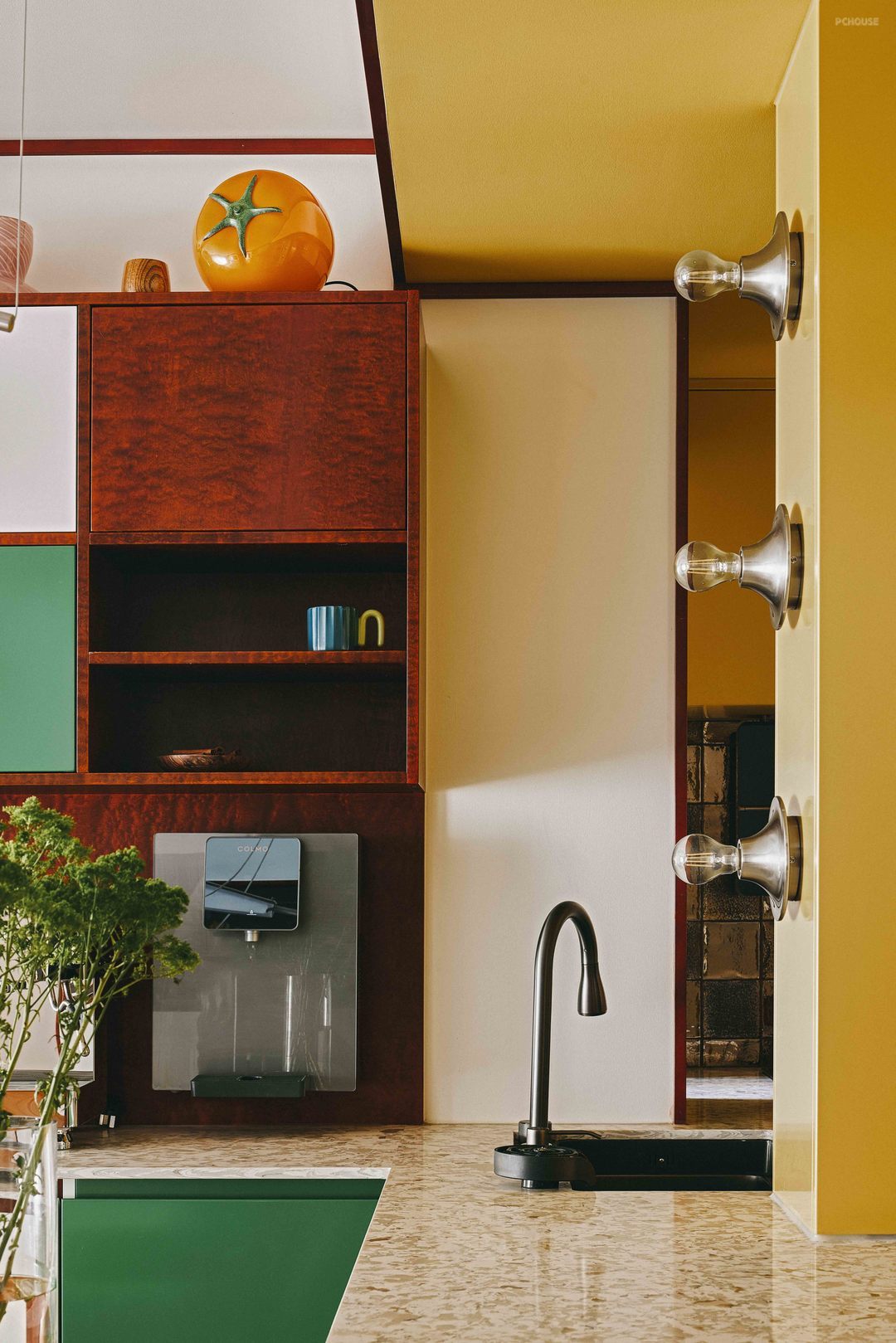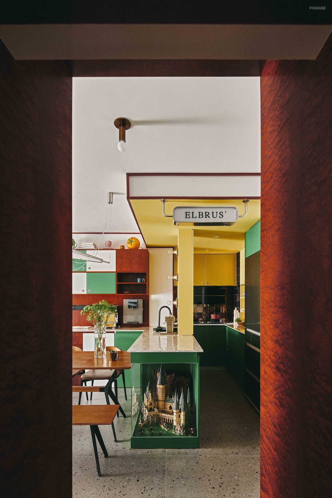 餐厨采用黄、绿、白、红木色拼接组合成“棋盘式”结构,色彩布局依循场景秩序,繁而不乱。