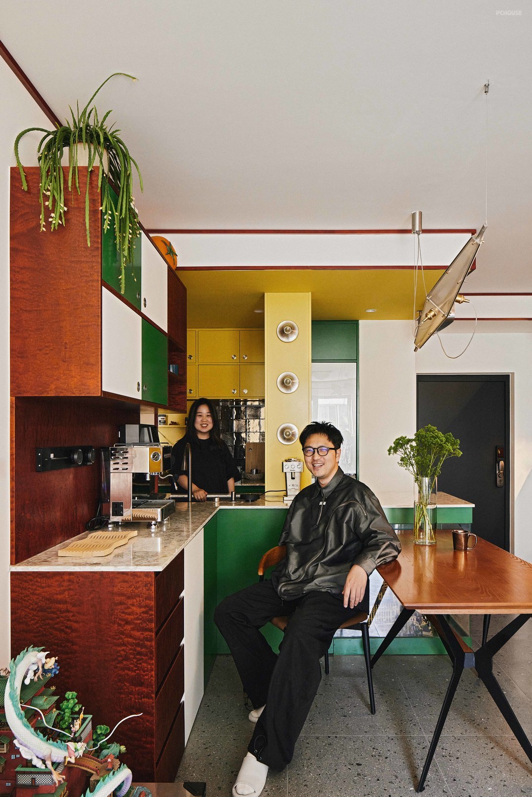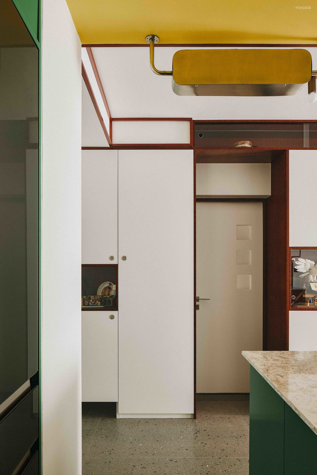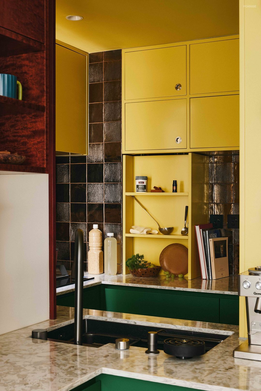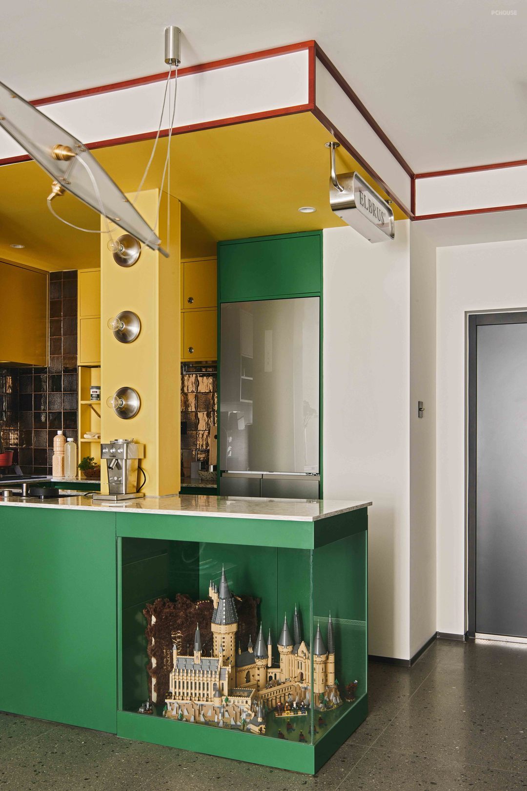 餐厨采用黄、绿、白、红木色拼接组合成“棋盘式”结构,色彩布局依循场景秩序,繁而不乱。