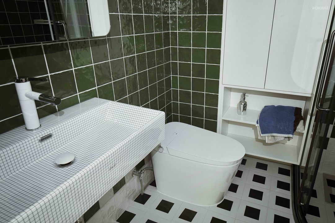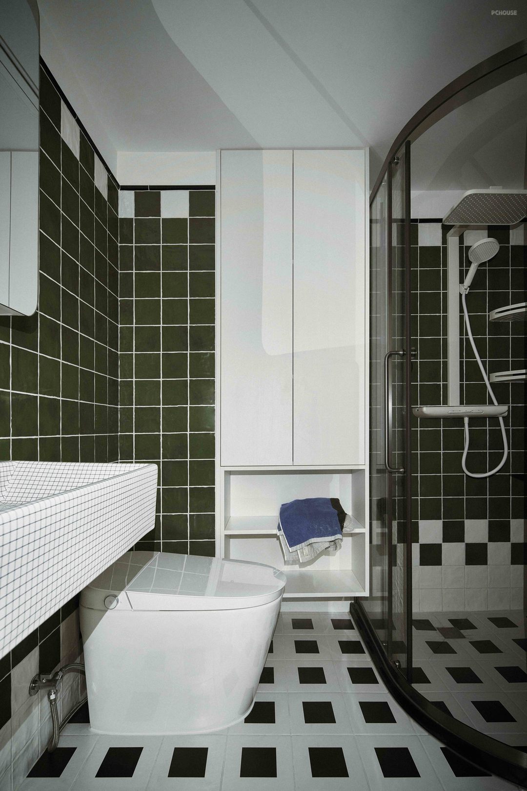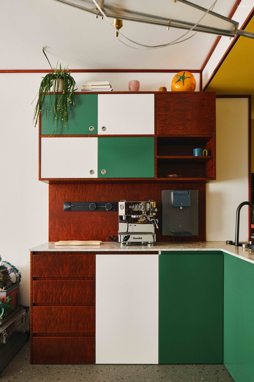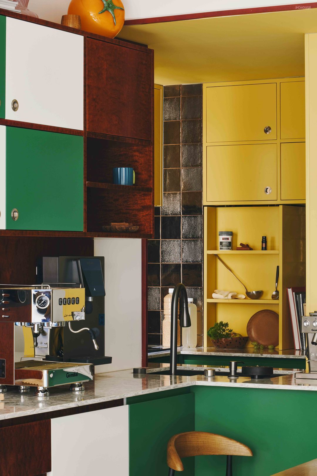餐厨采用黄、绿、白、红木色拼接组合成“棋盘式”结构,色彩布局依循场景秩序,繁而不乱。