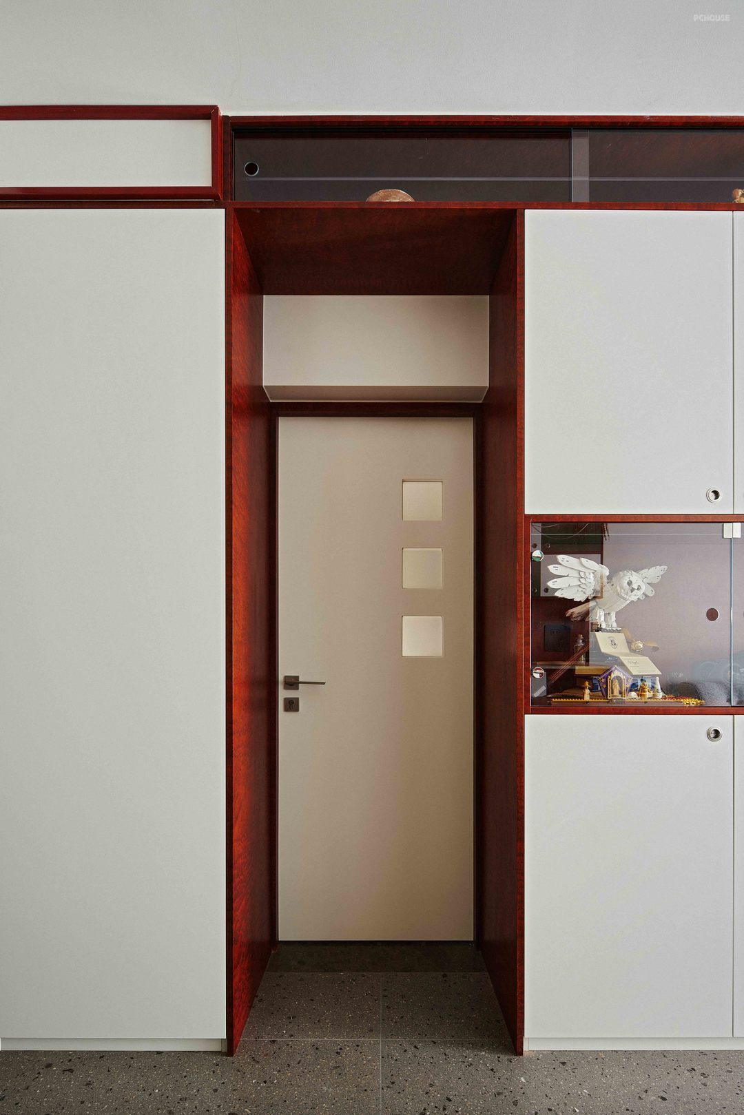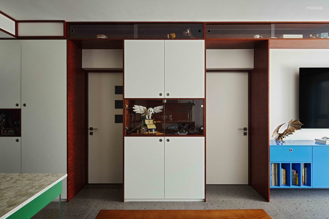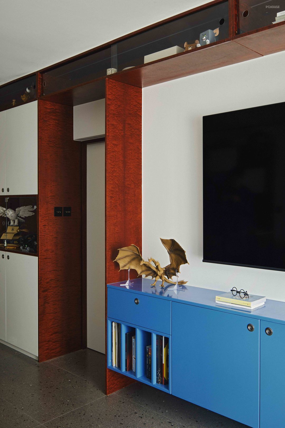 门与天花板之间的吊顶处,围合了一圈狭窄的收纳空间。部分采用亚克力柜门,可作为小型手办陈列展示,视觉上延伸并轻盈了空间感官。