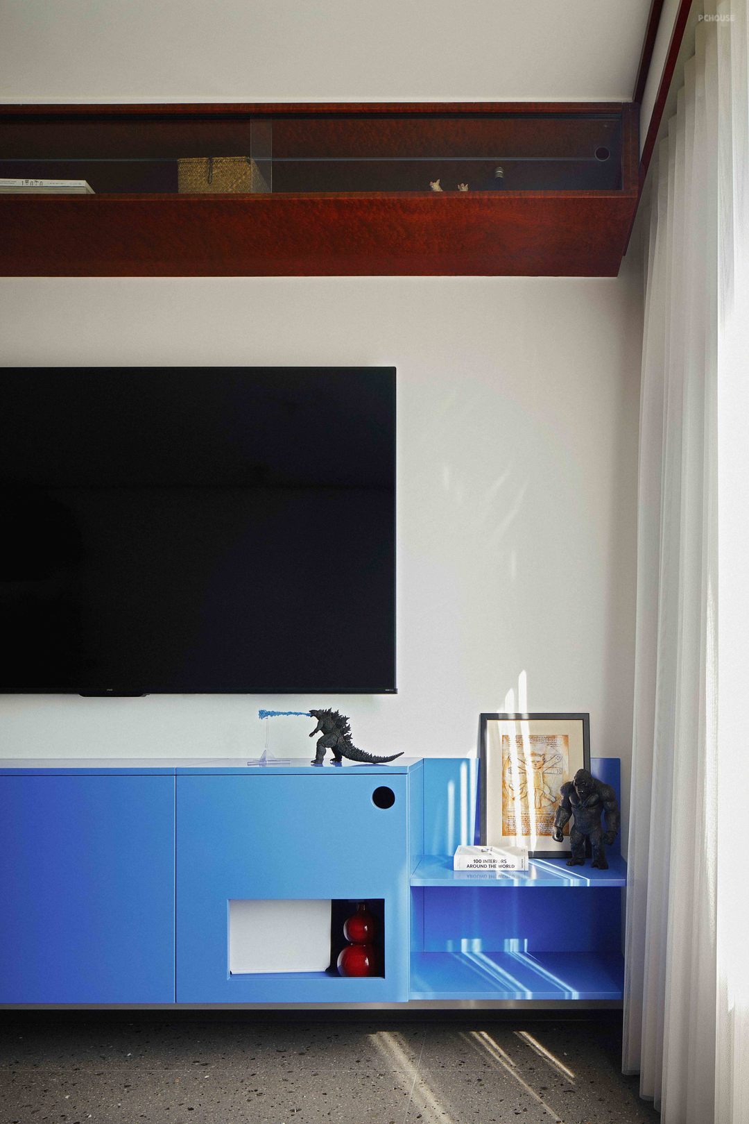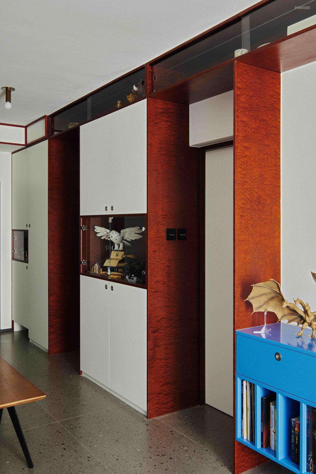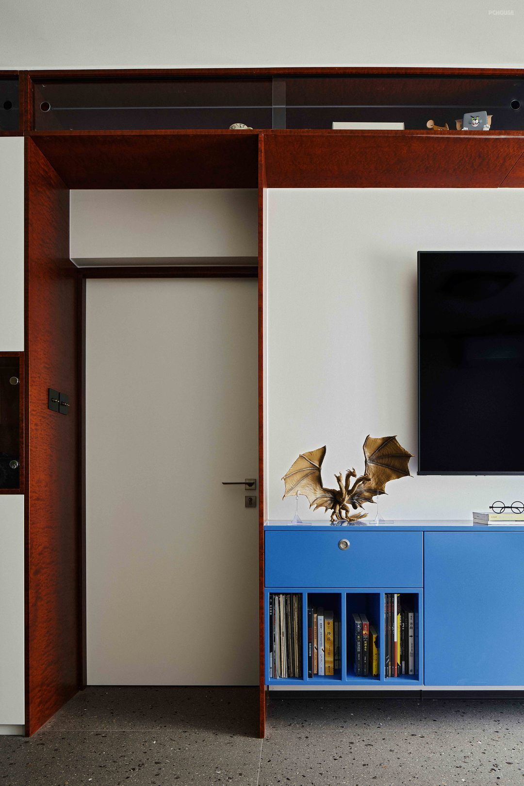 门与天花板之间的吊顶处,围合了一圈狭窄的收纳空间。部分采用亚克力柜门,可作为小型手办陈列展示,视觉上延伸并轻盈了空间感官。