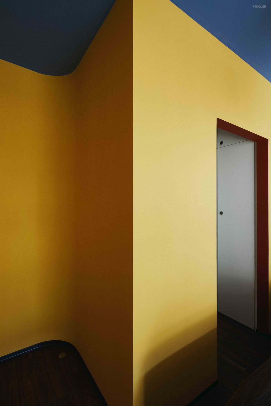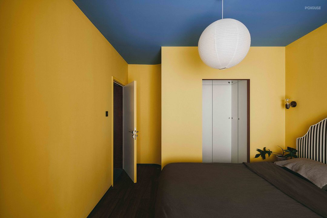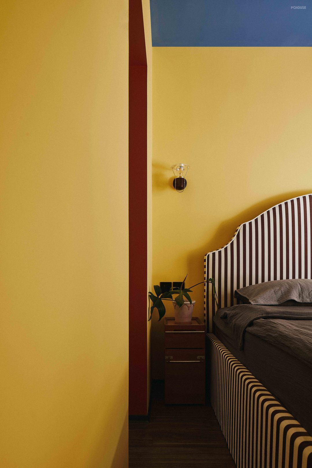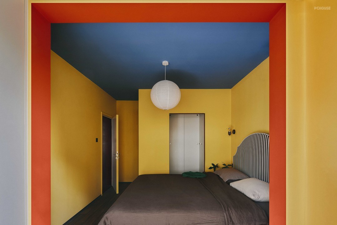 主卧铺展了大面积的黄蓝配色,与客厅呼应。门框用红色勾勒,加深了内建筑的立体感,就像一个“礼品盒”,每天都能打开奇妙惊喜。