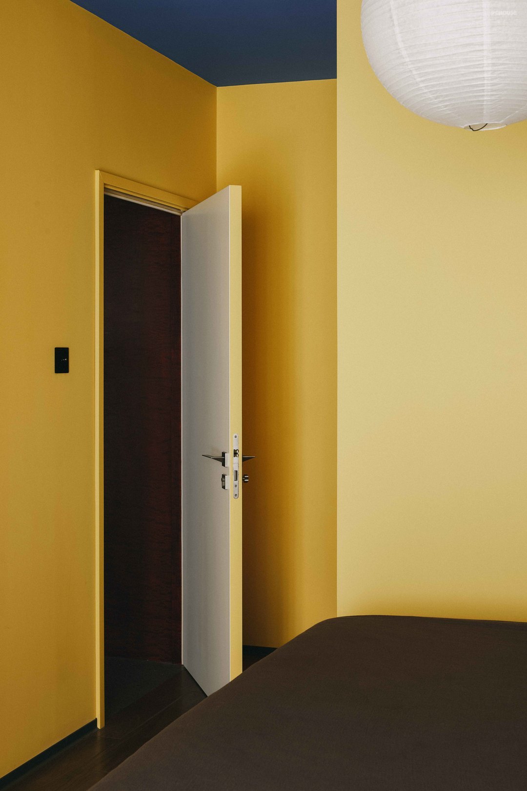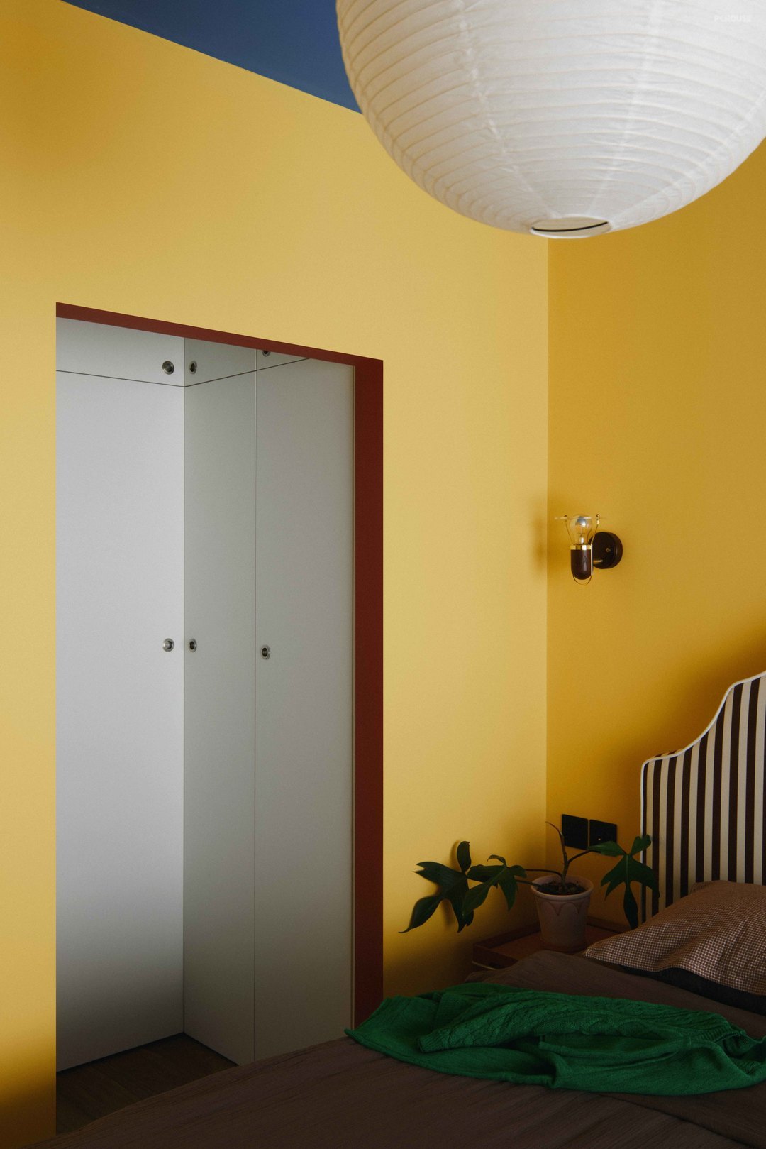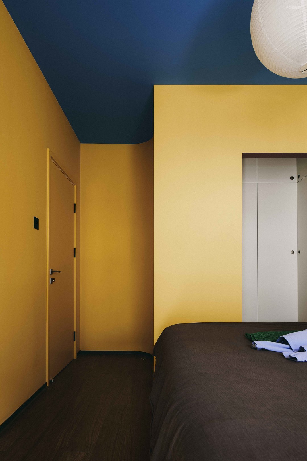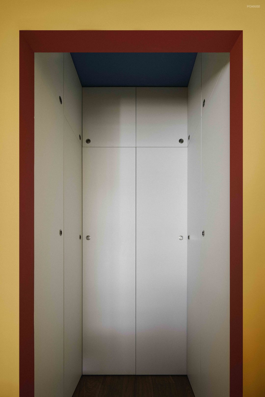 主卧铺展了大面积的黄蓝配色,与客厅呼应。门框用红色勾勒,加深了内建筑的立体感,就像一个“礼品盒”,每天都能打开奇妙惊喜。