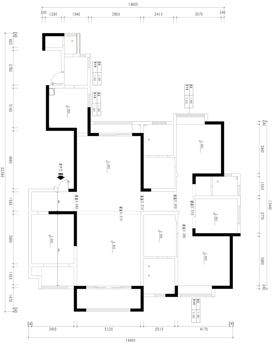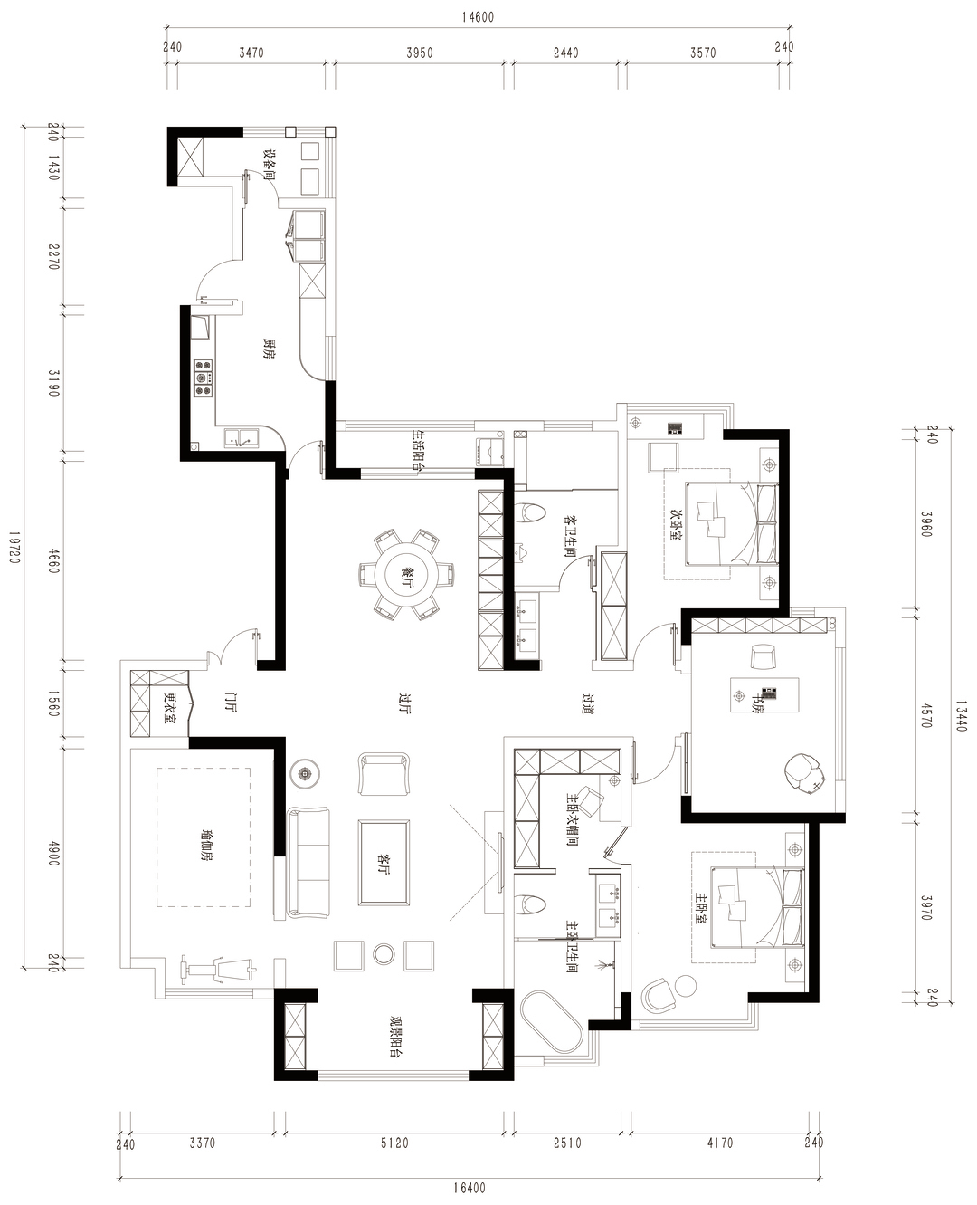 本案居住人口不多,1、原始户型进门缺少储物空间,改变南次卧进门位置,在入户右手增设进门储物室。2、此户型东边朝向蚌埠市龙子湖,景观条件非常好,因此把原始户型东向的卫生间和书房打通,做成大的景观书房。3、原始餐厅开间很大,在餐厅东墙增加装饰储物性餐边柜。4、原始厨房空间过小。