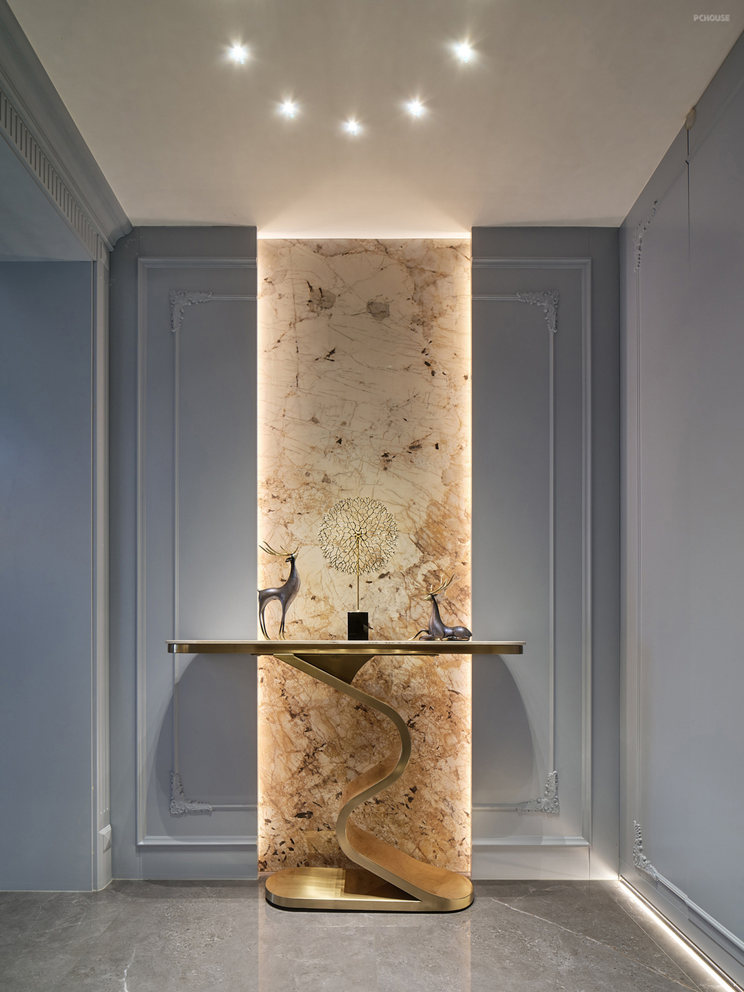 过道与电视墙墙面本身是两个垂直面,线条转角设计,让空间更具延伸性,也使得墙面过渡更加自然,酒柜和过道通过嵌入式踢脚线灯带,增加空间视觉张力与视觉延展性。