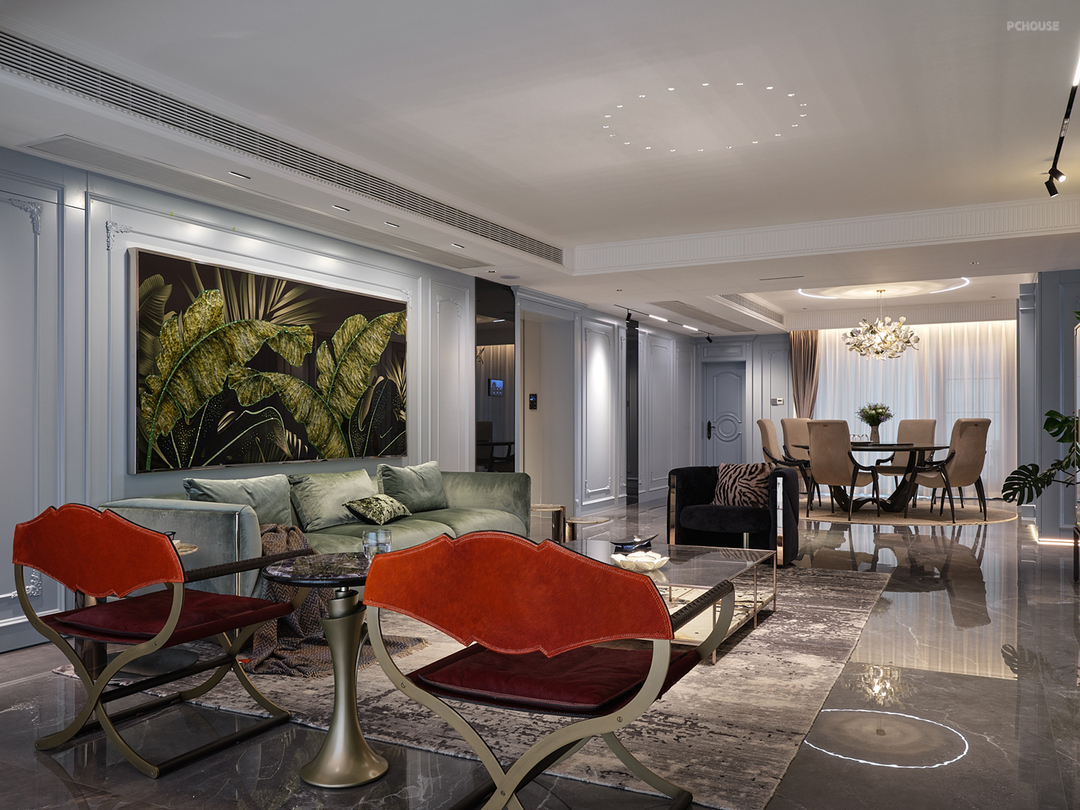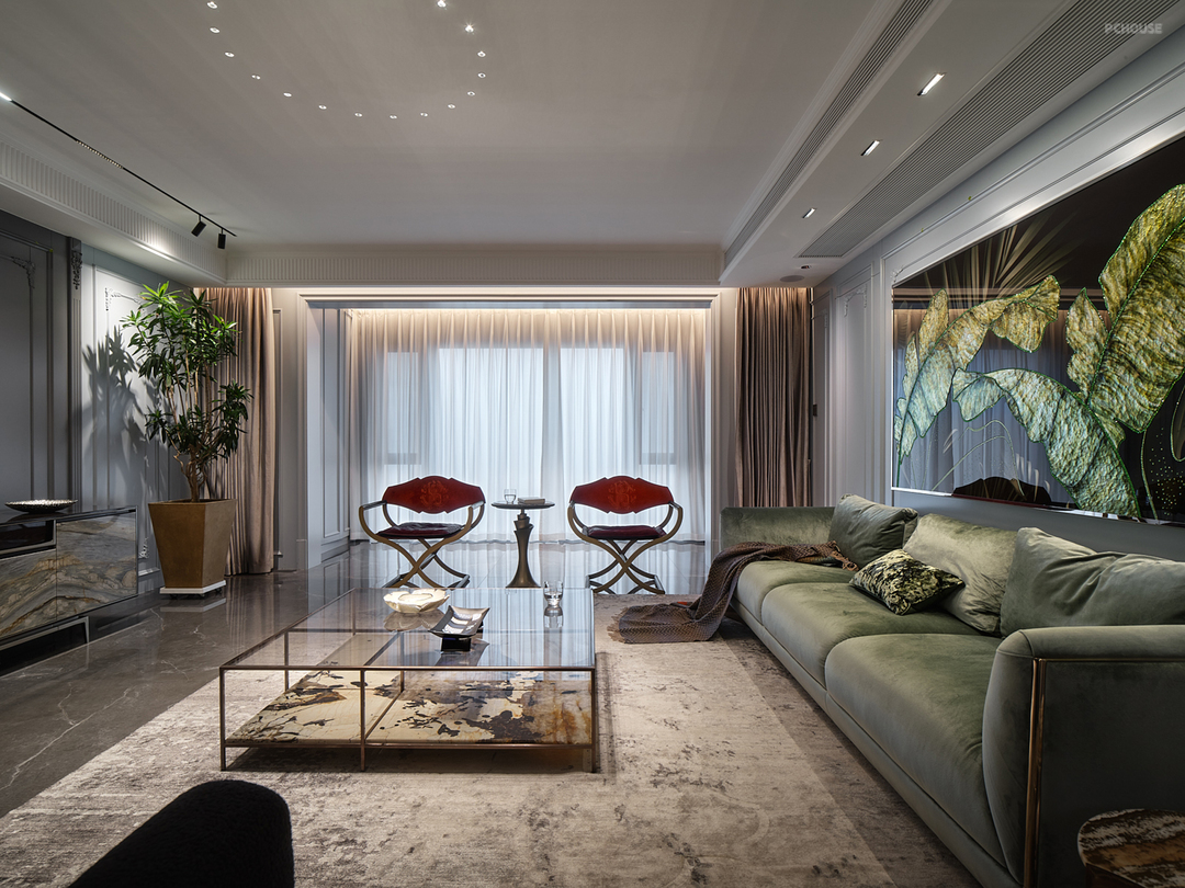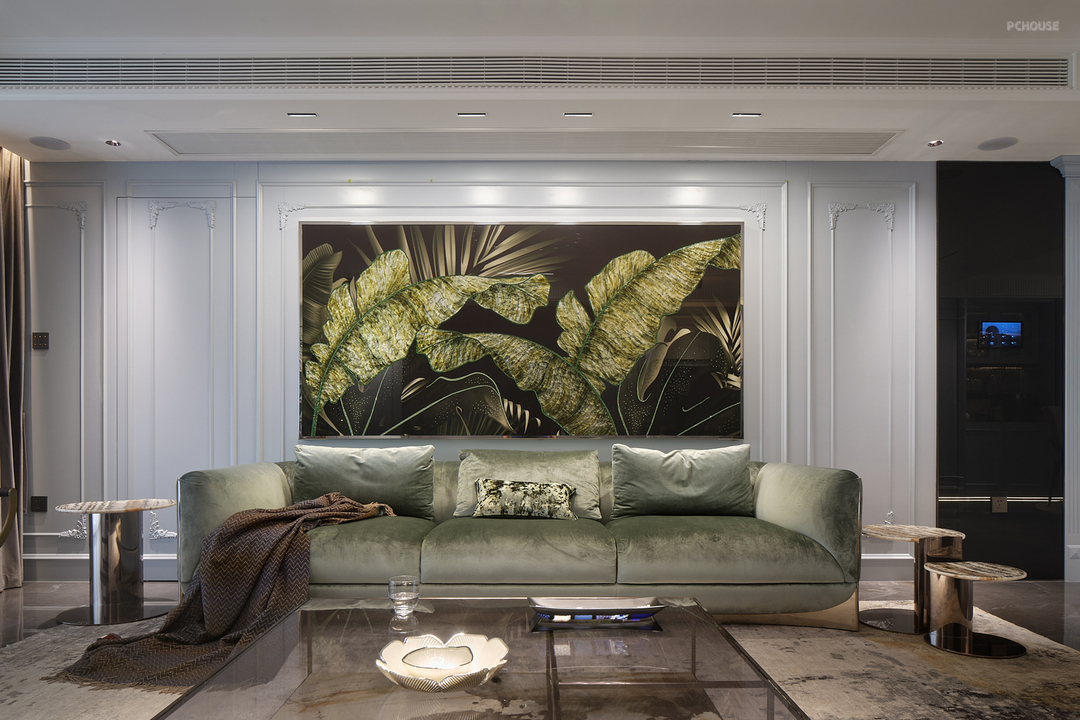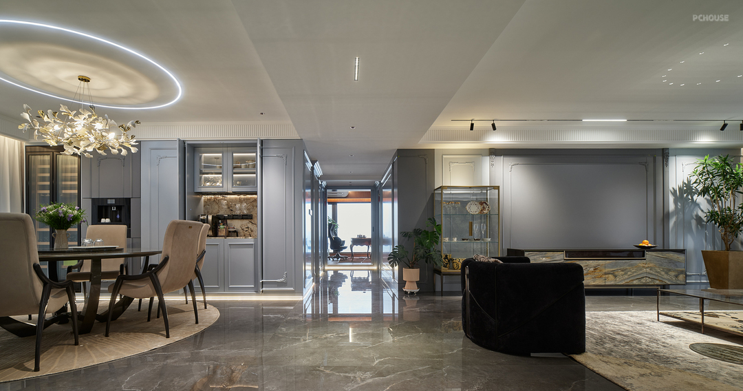 客厅布局开阔,空间顶部无主灯别致造型,并布置精致的雕花石膏线围边。色彩上,用不同明度的灰作为主色调,奠定了空间沉稳内敛的底色。