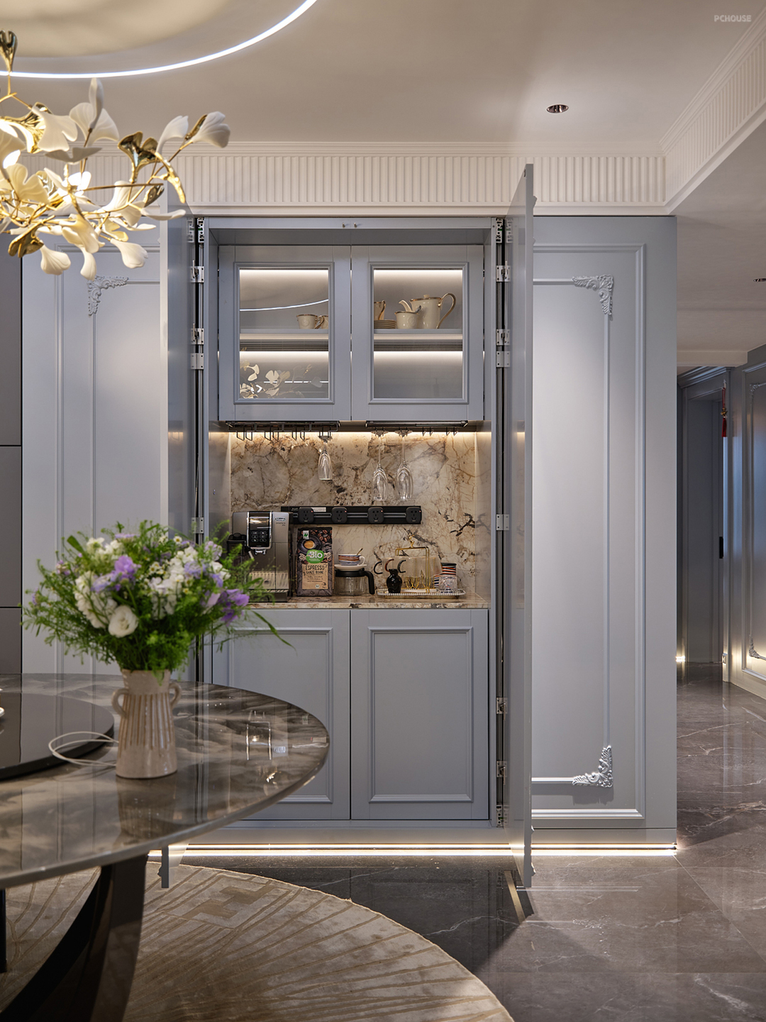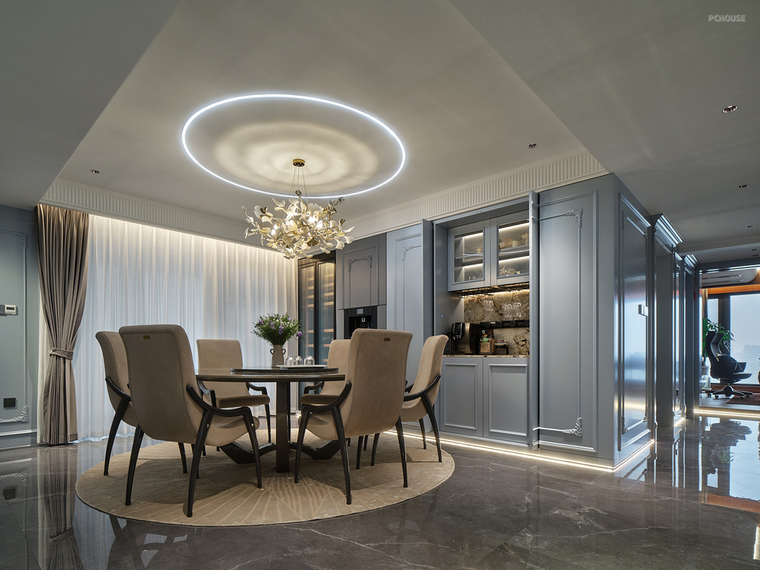 餐厅吊顶采用圆形水波纹造型,在整个四方的空间里显得圆滑流畅,给人一种舒适的包容感。法式浪漫感中加上时尚现代感。灯具与家具都以此概念搭配。这样的设计不仅不会显得杂乱拥挤,更致力于表达出空间的延伸感。