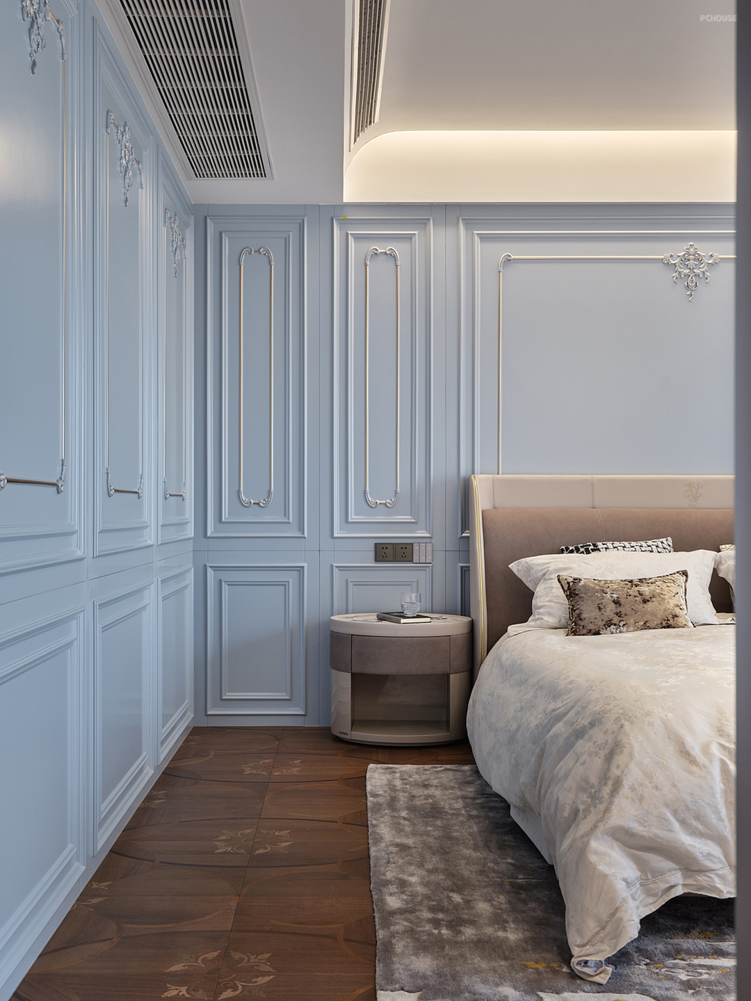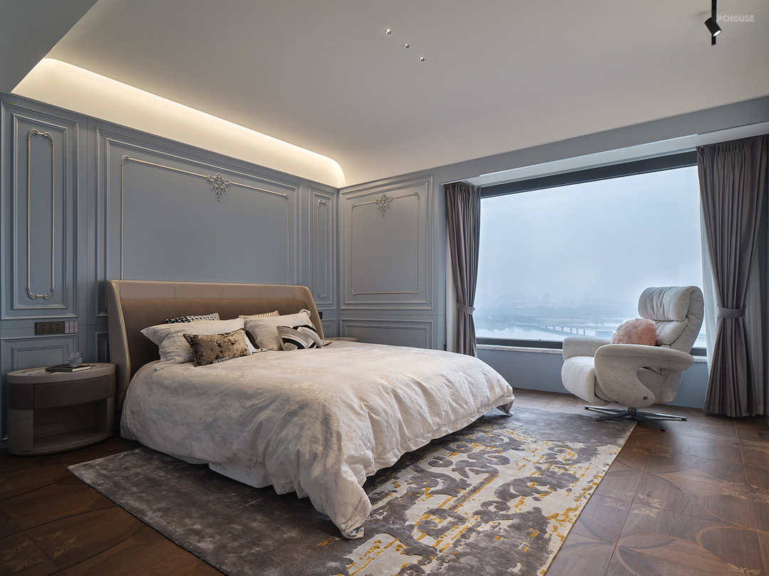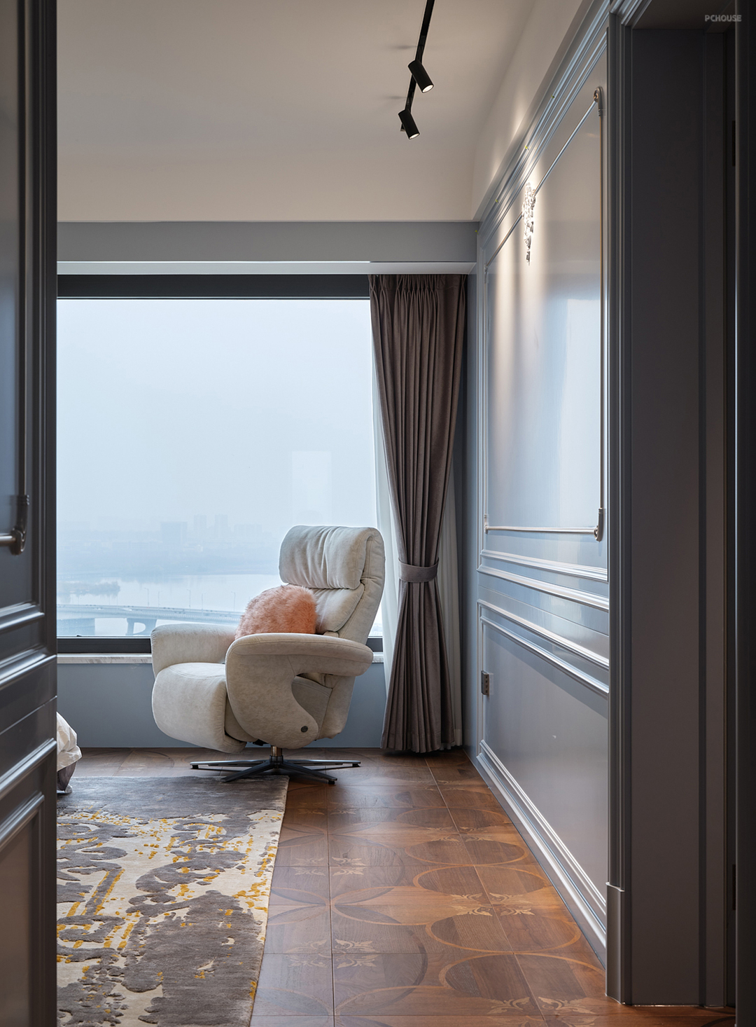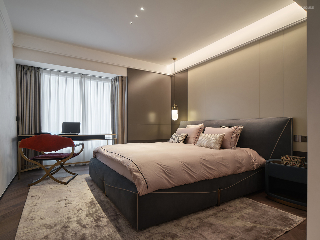 不同于公共空间的精致干练,进入主卧,将优雅格调以温润的主色诉诸于人的知觉,以暖灰色系为基础,以原木拼花地板作为跳色体现优雅的气质。