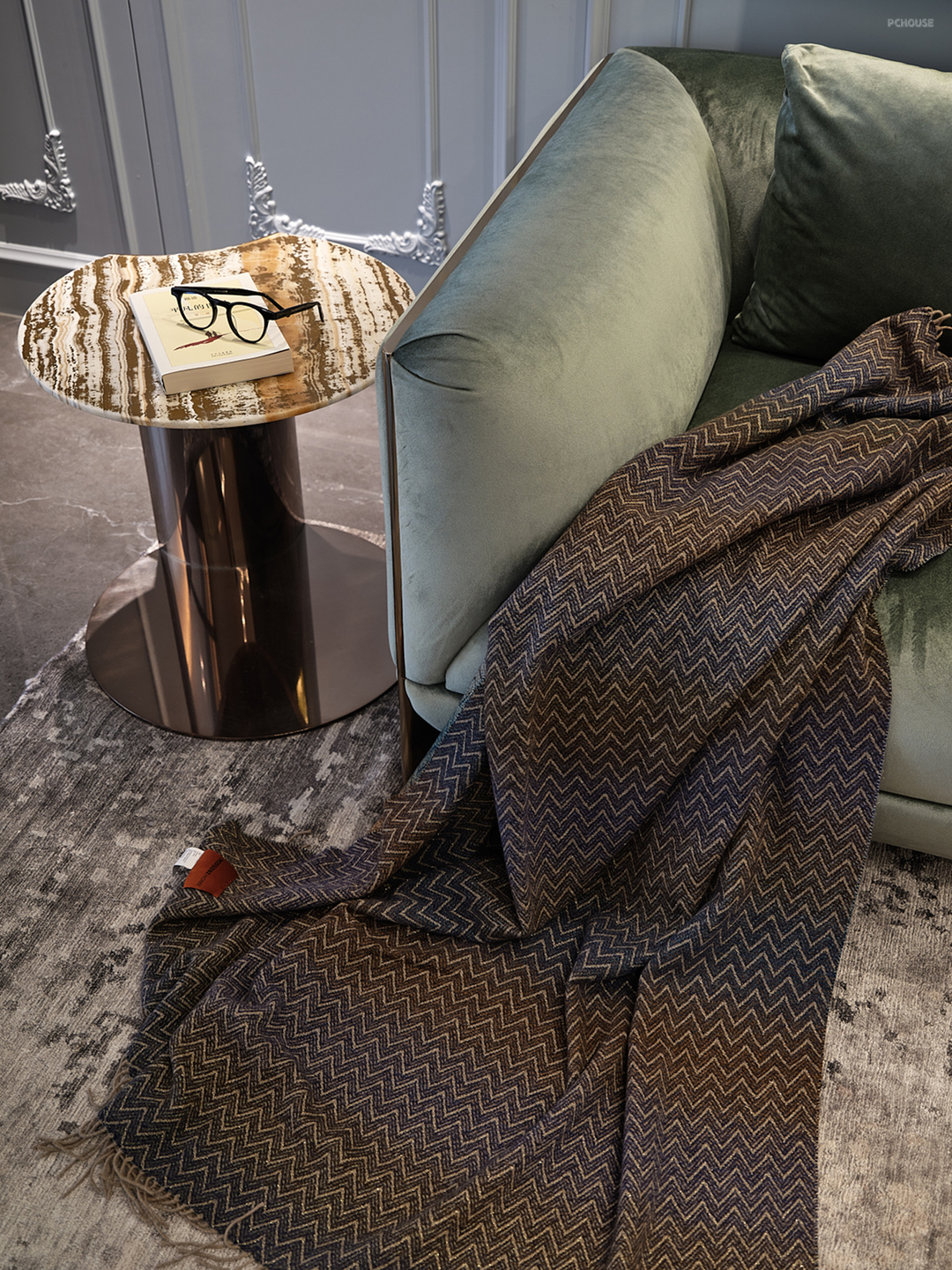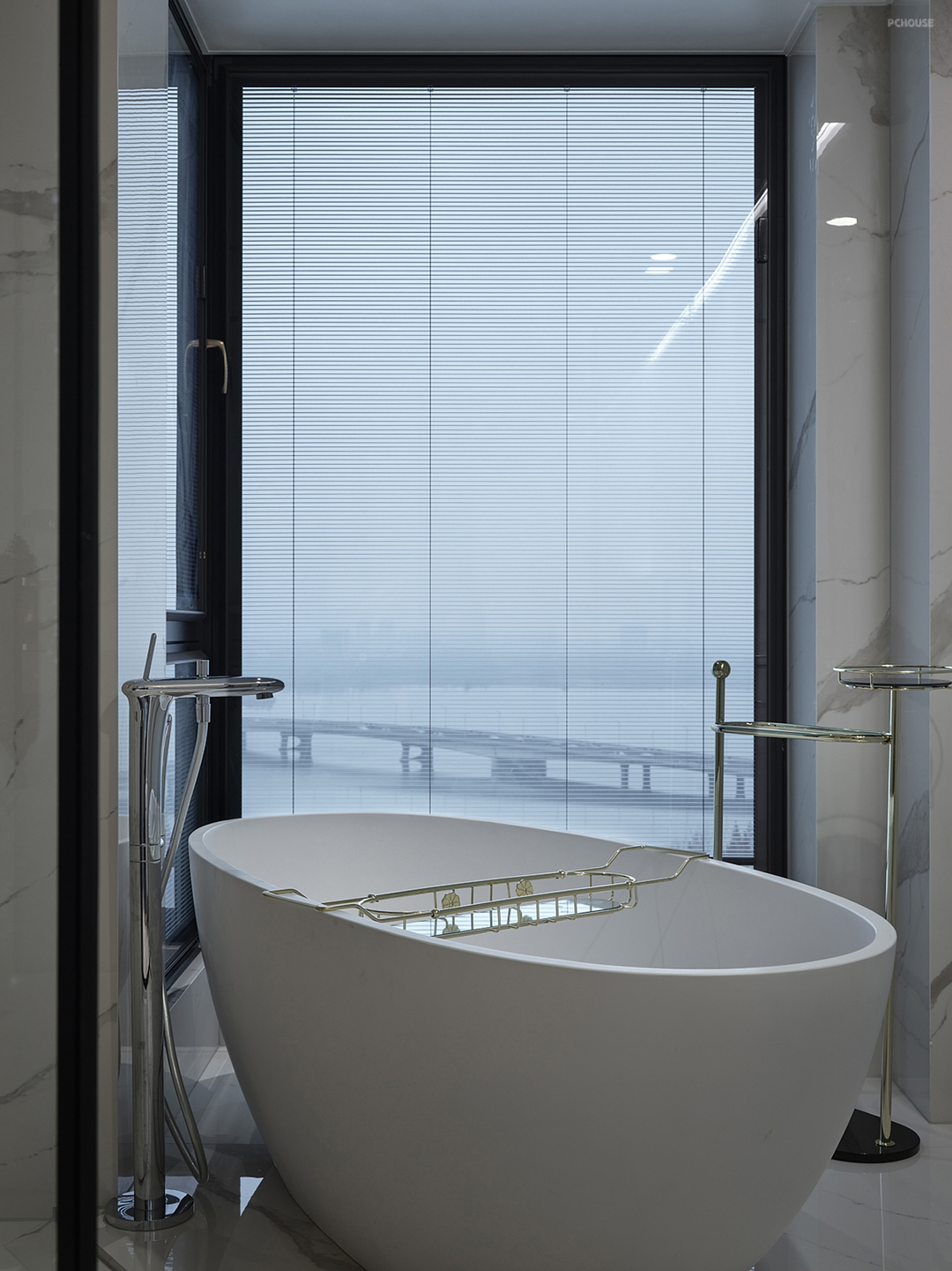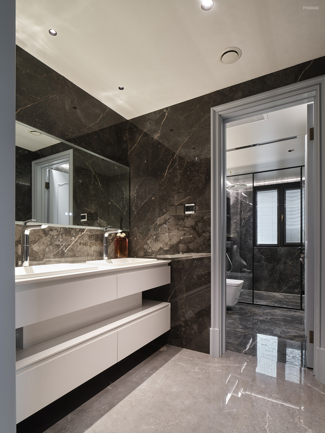 不同于公共空间的精致干练,进入主卧,将优雅格调以温润的主色诉诸于人的知觉,以暖灰色系为基础,以原木拼花地板作为跳色体现优雅的气质。