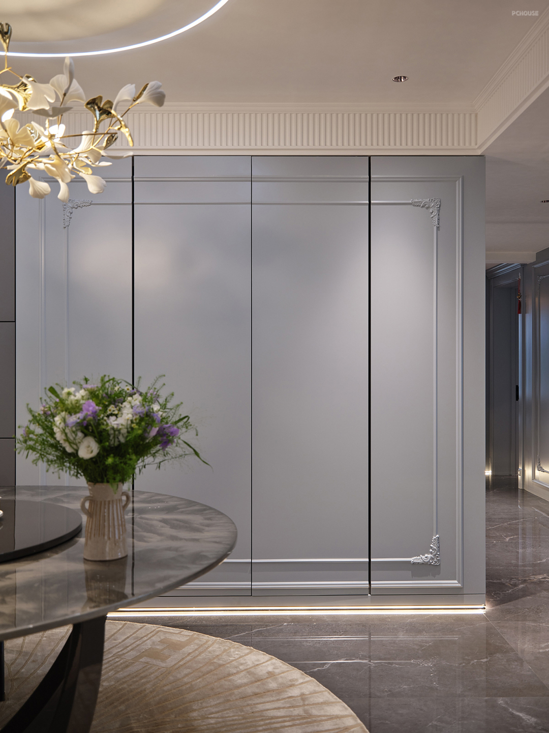 门厅--门厅设置更衣室,方便使用和打理,充分展现“形式服务于功能”的设计主旨。同时也缩小过道浪费的空间,横向纵向线型灯,辅助照明的同时增强视觉张力。“初其狭,才通人,复行数十步,豁然开朗”