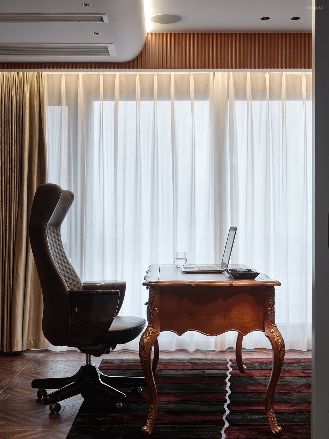 两个空间合并成的书房,由于梁体和中央空调的两重因素,增加了弧形柔美的造型吊顶,提升层高的同时,保证设备的正常运行。