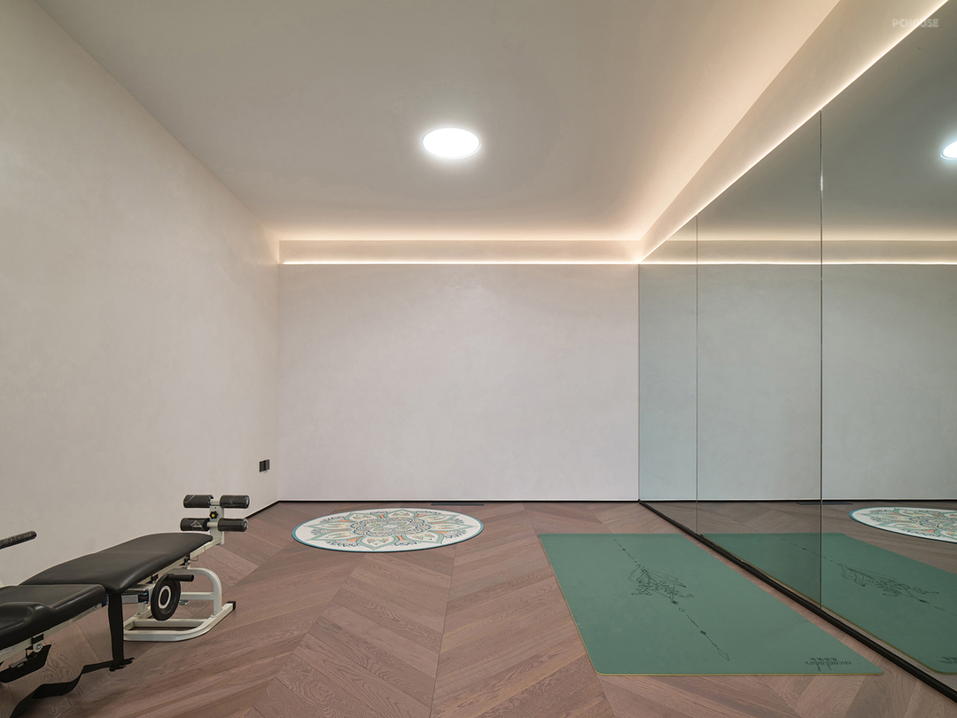 沙发背景墙,左侧隐形门是瑜伽房的进门。