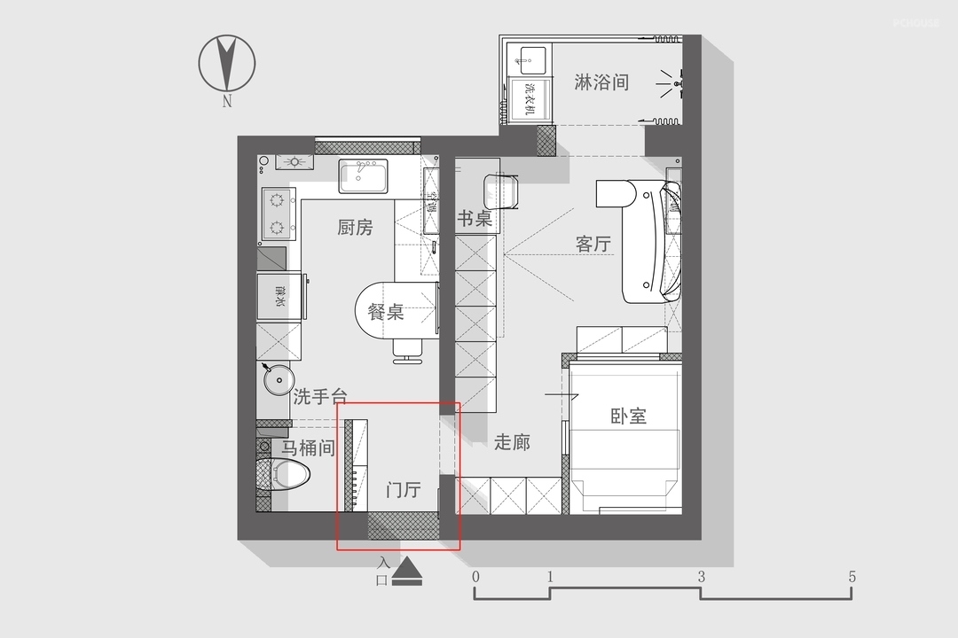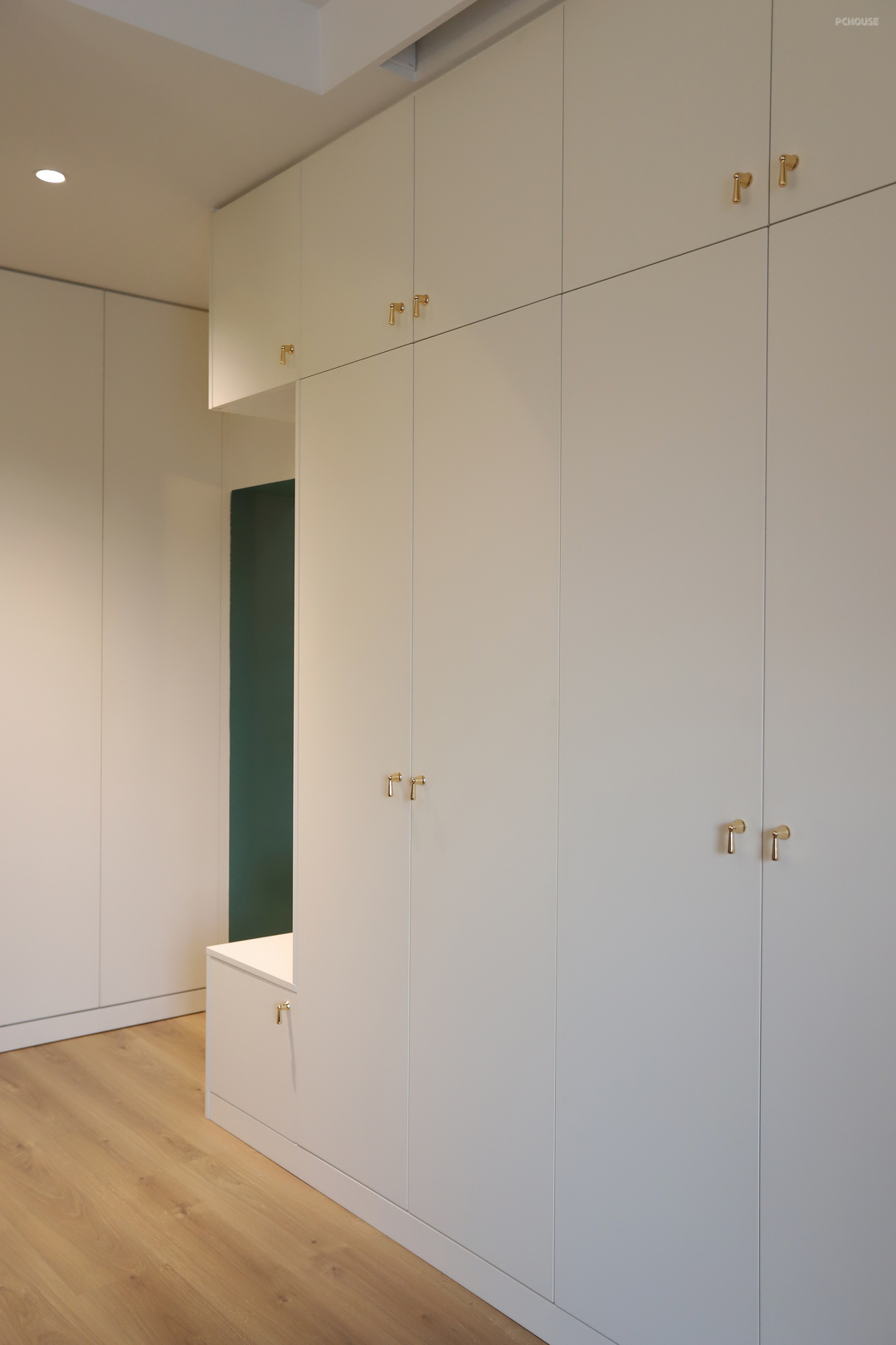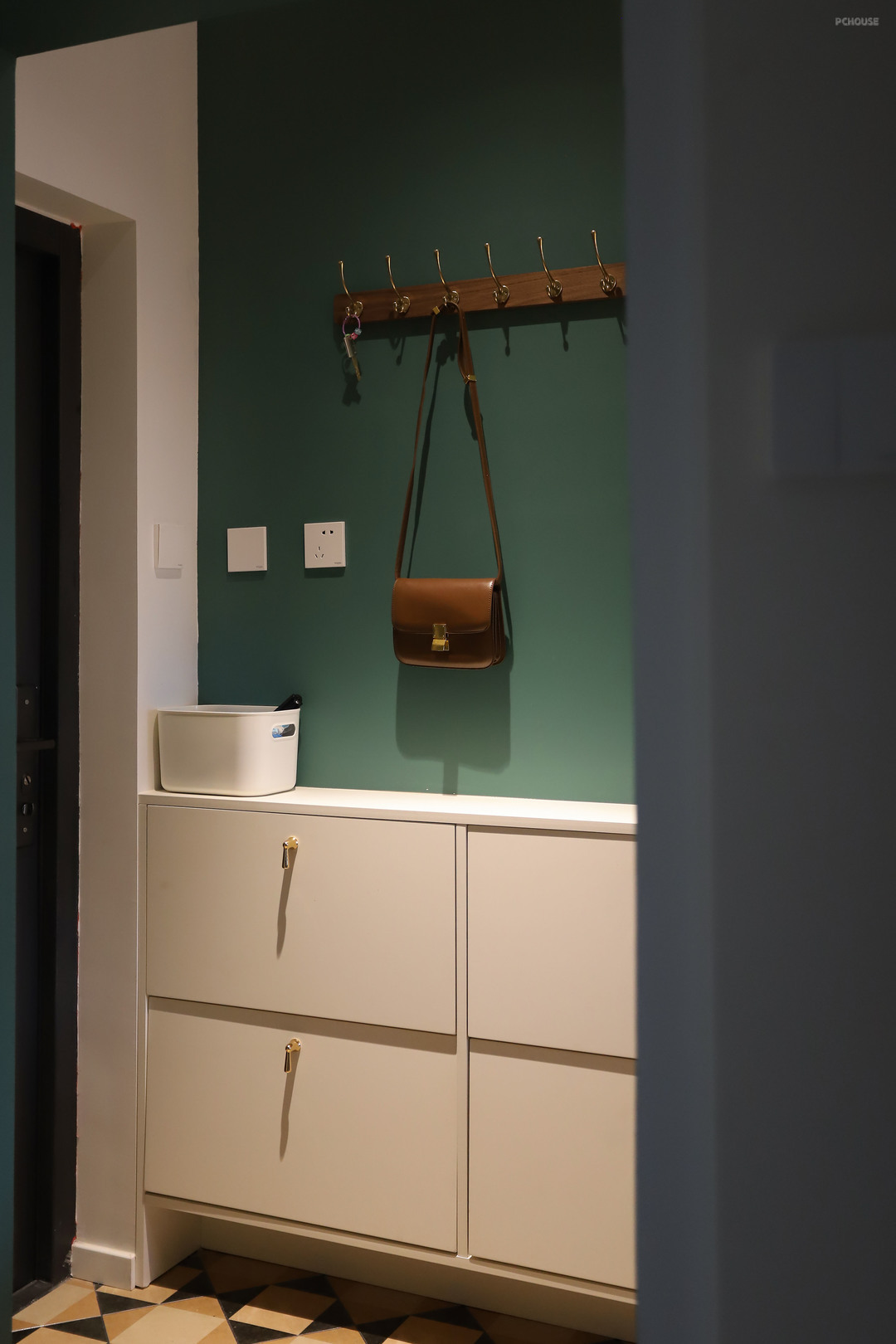 为了保证门厅的储物,我们拆掉了原来卫生间的墙,墙体往里推了200mm,挤出了一组长1200mm高900mm的斜插式鞋柜。