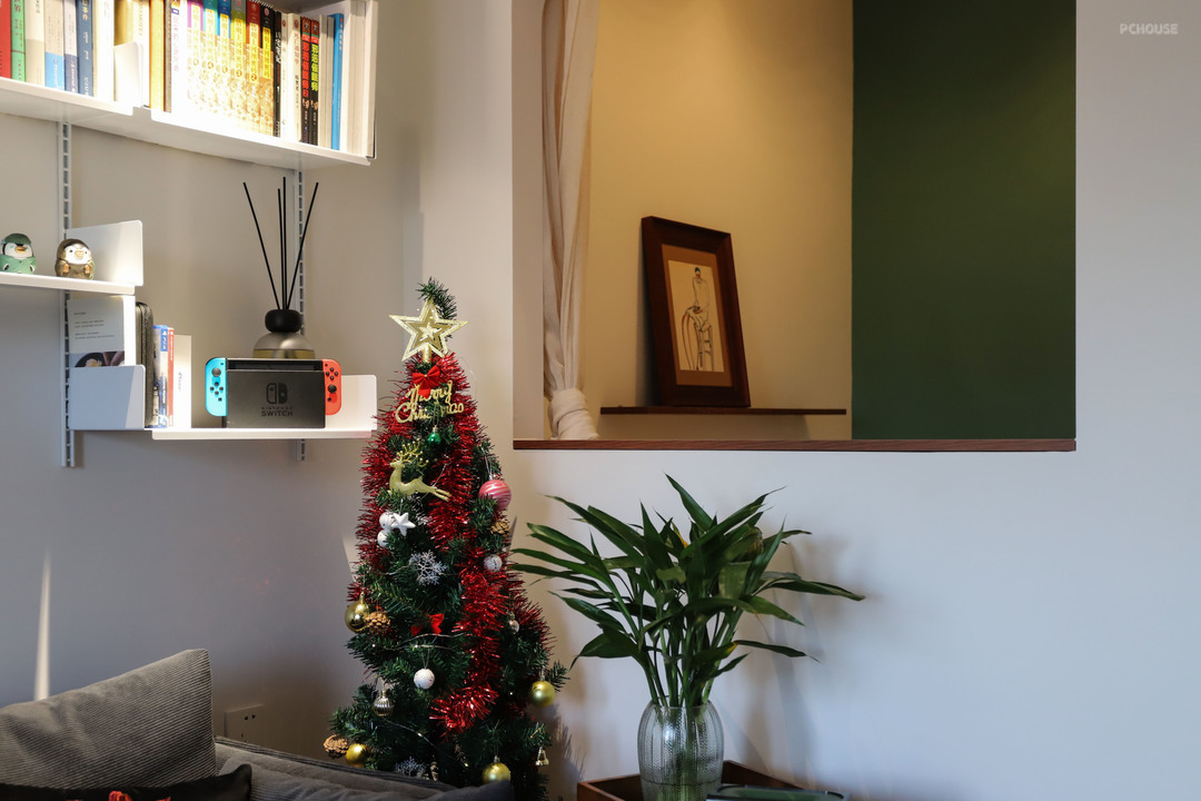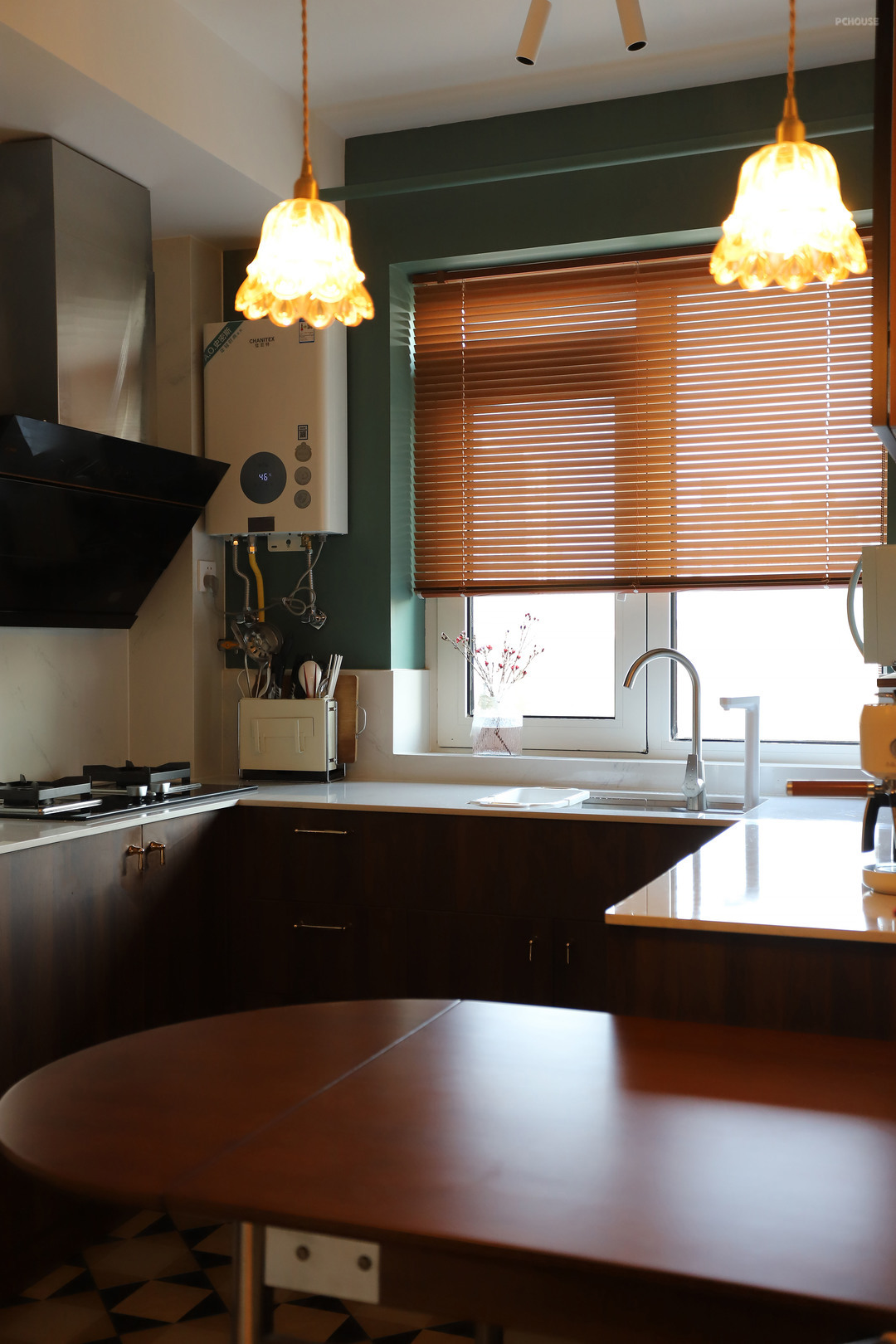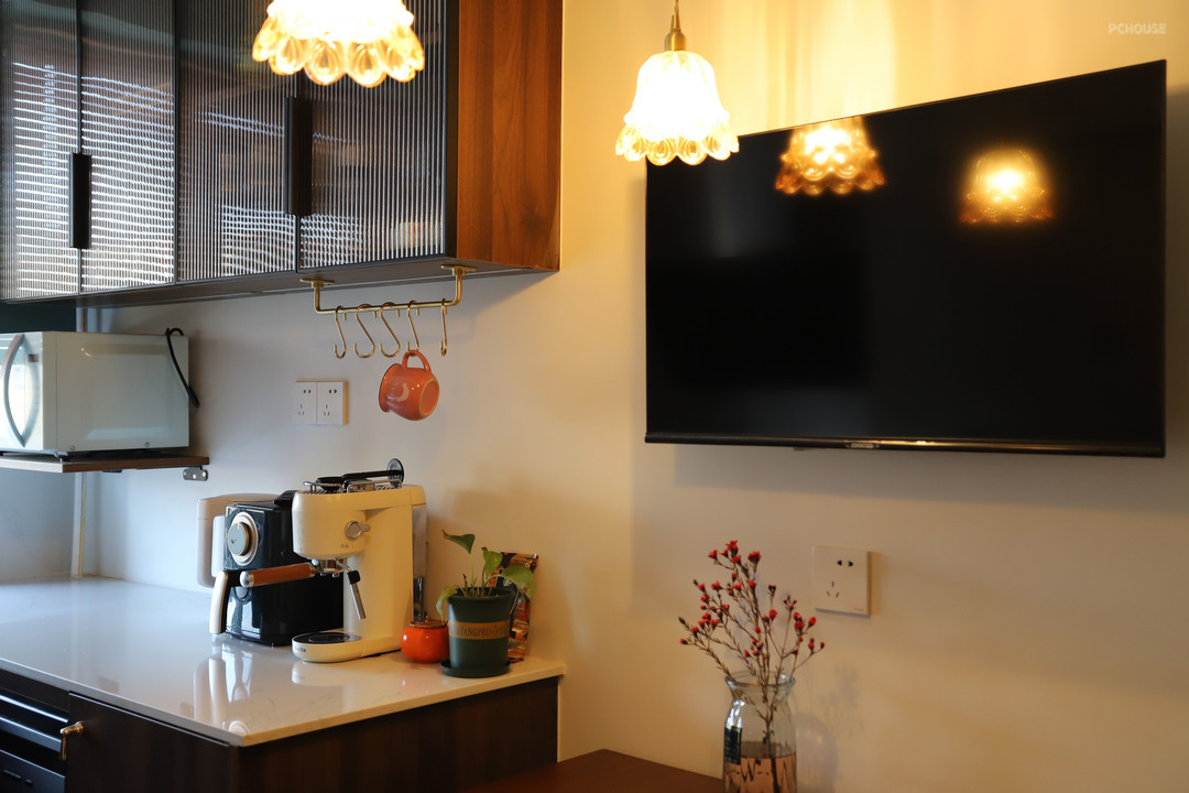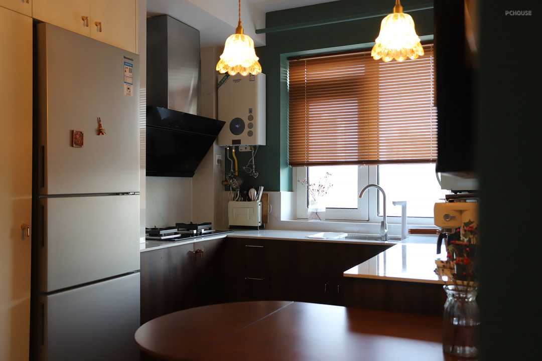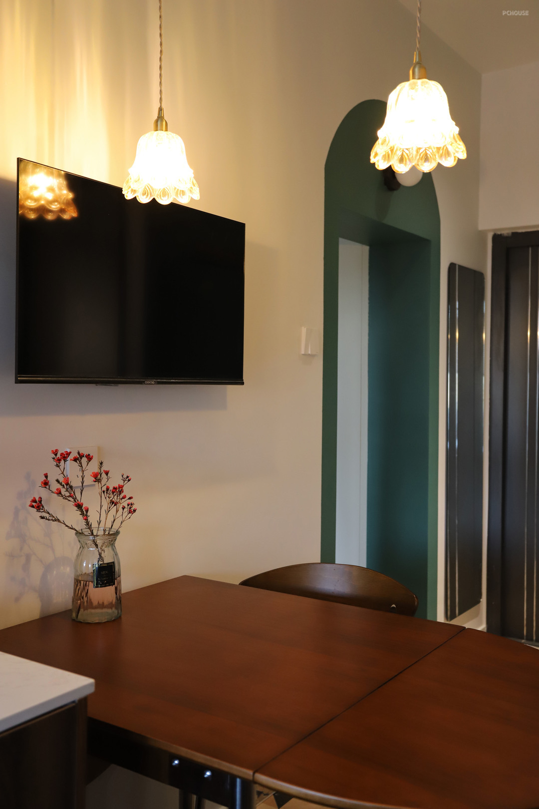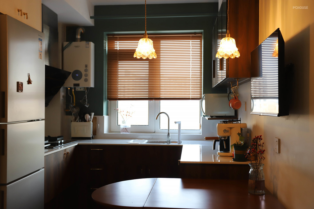 餐桌用的是两端折叠的,展开后总长1.5米,餐桌放在一进门正对的位置,一回家打开吊灯,想不开心都难。如果餐桌安排在别的地方,可能没多久桌子上就会堆满东西,现在一进门就能看到,为了这个“小酒馆”也得让餐厅厨房台面干干净净的。