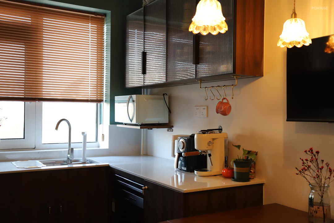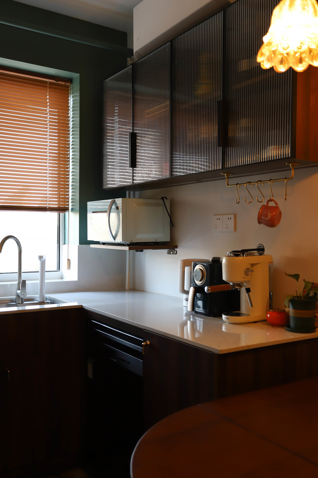 微波炉直接上墙,既不占用寸土寸金的台面空间又好打扫。厨房用的是金属木纹色百叶帘,不怕油污还能调节光线照进来的角度。