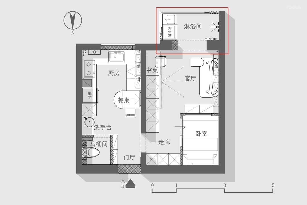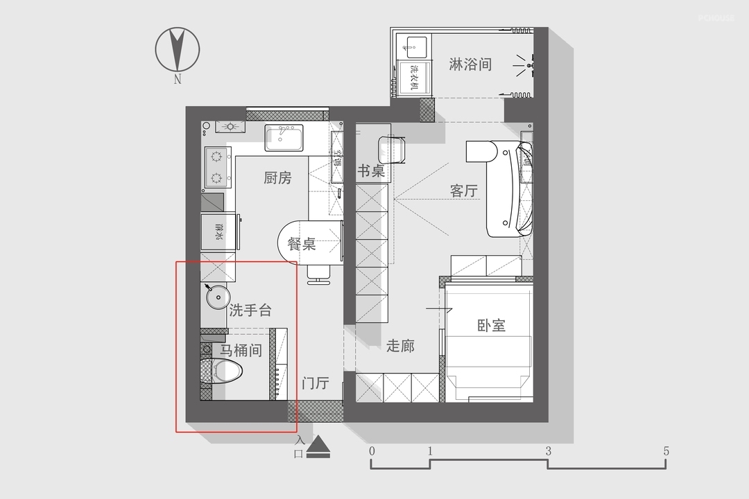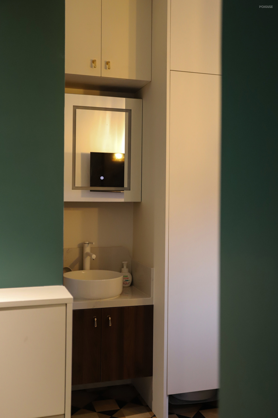 水盆单独拿出来,和家政柜连在一起,洗手台进深450mm,家政柜进深600mm,这样家政柜能起到遮挡作用。家政柜里还有一个自动上下水的机器人,底部预留了机器进出的空间。