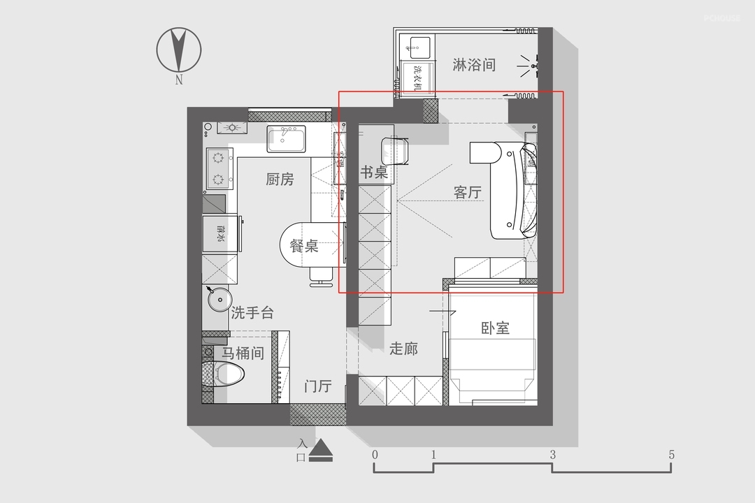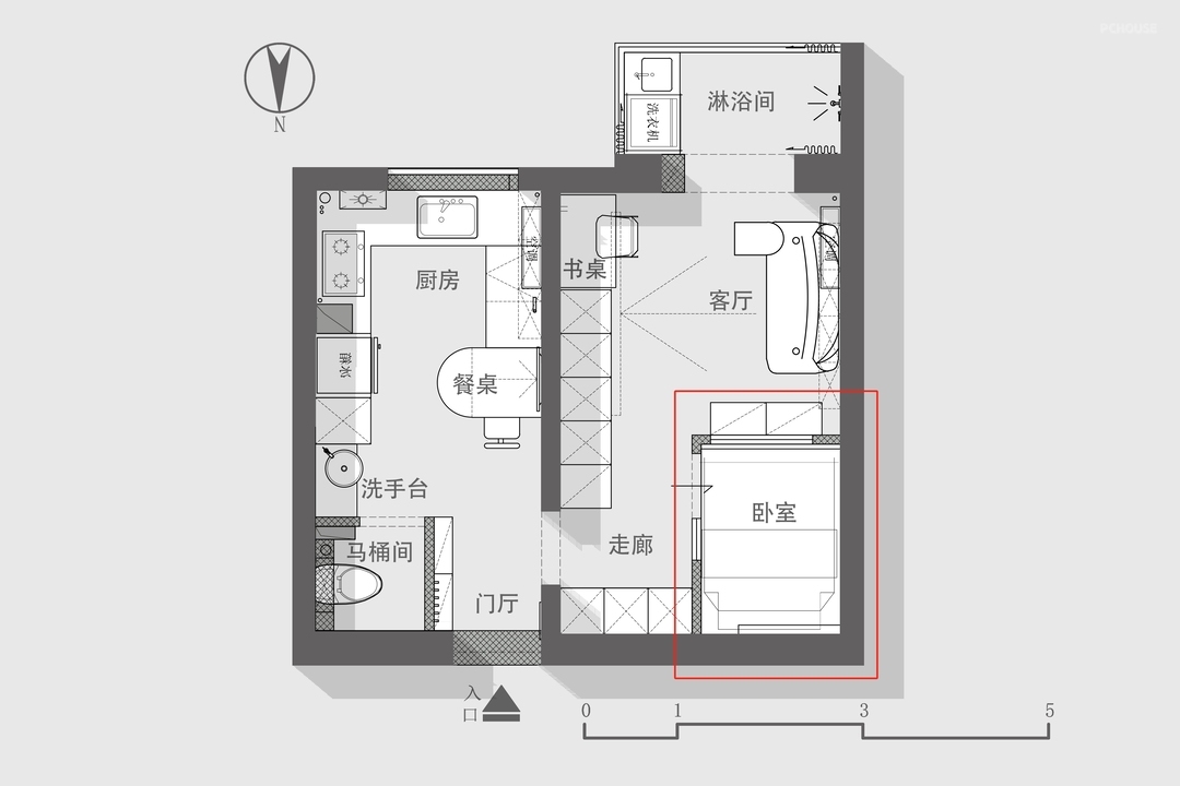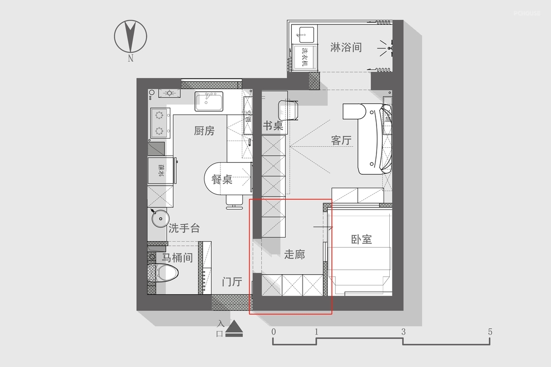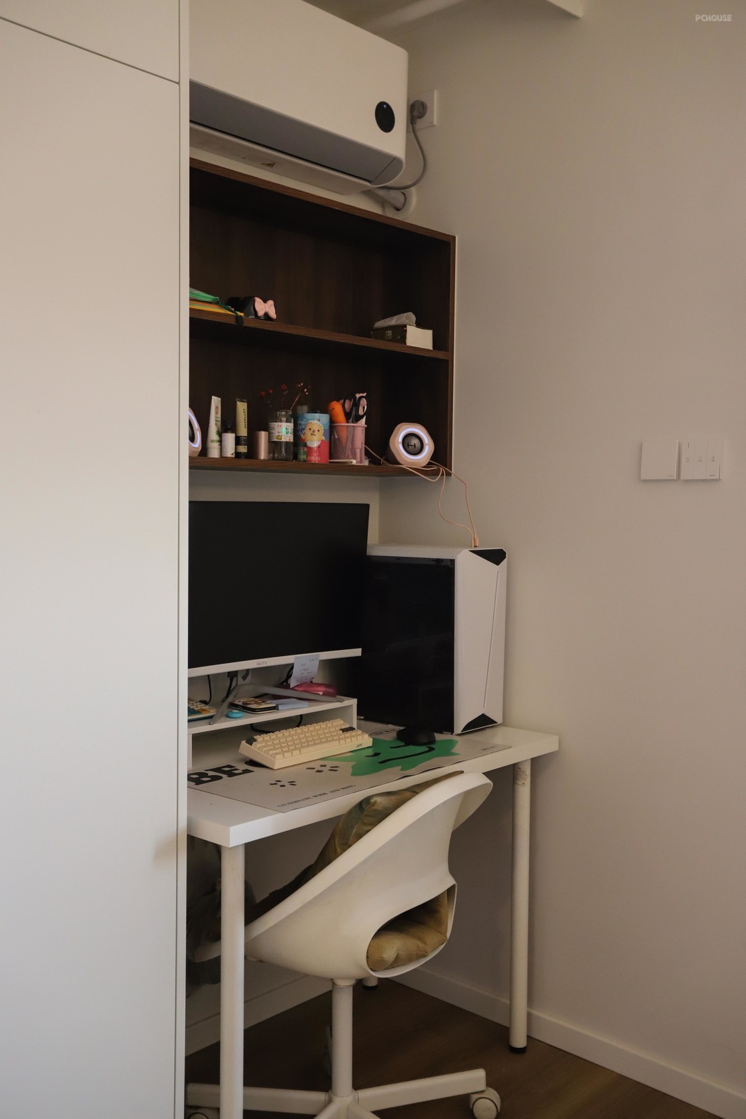 办公区和衣柜结合,书桌靠墙,推拉椅子不用担心后边空间不够,保证活动区最大程度的宽敞无遮挡。