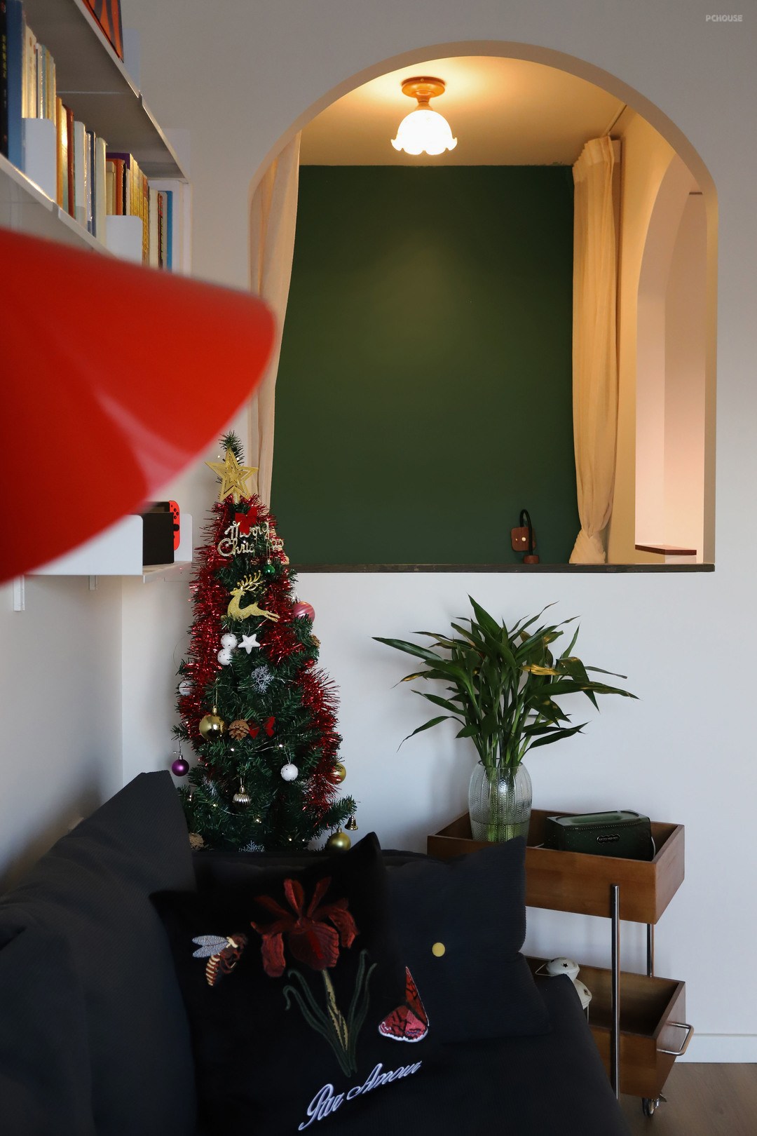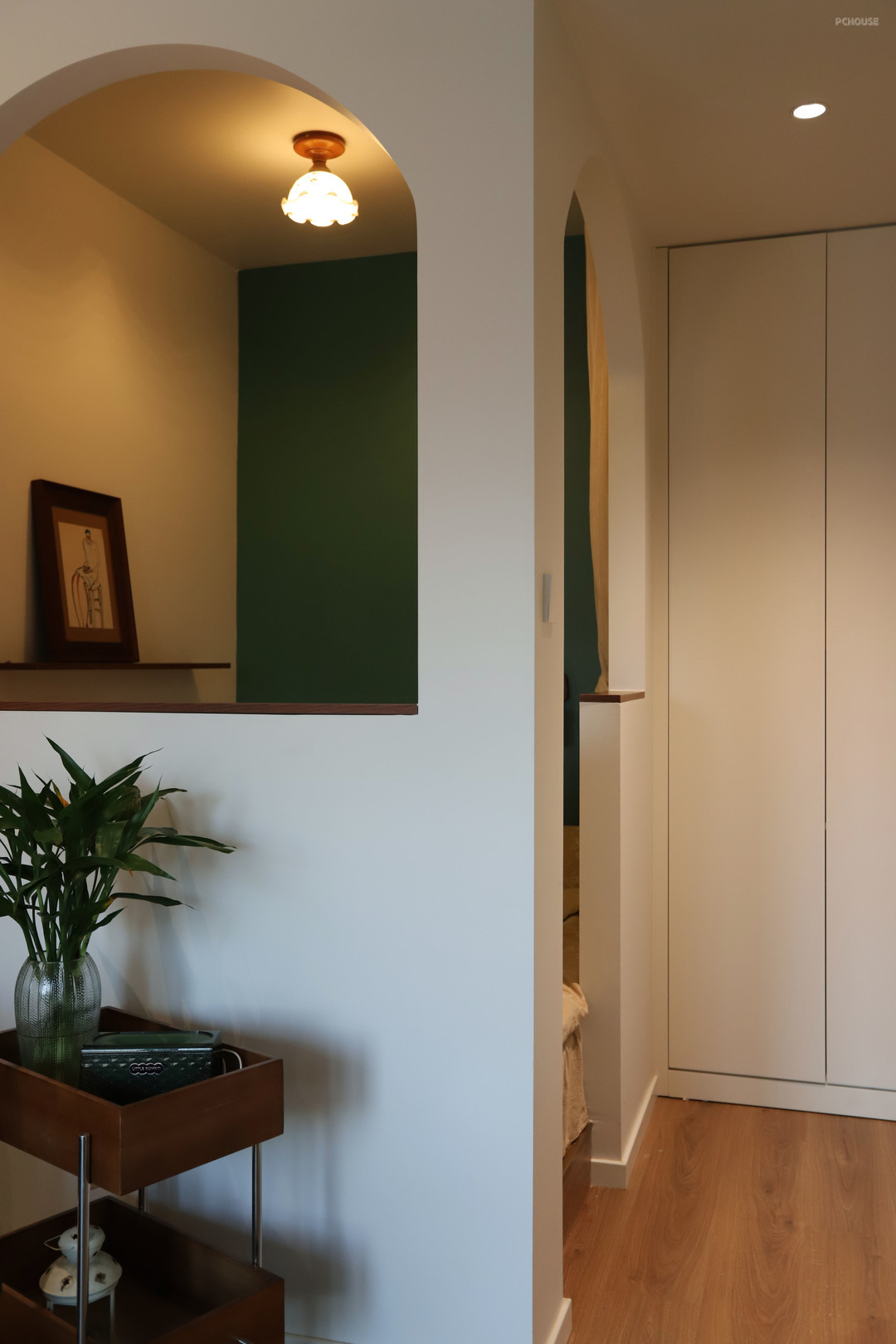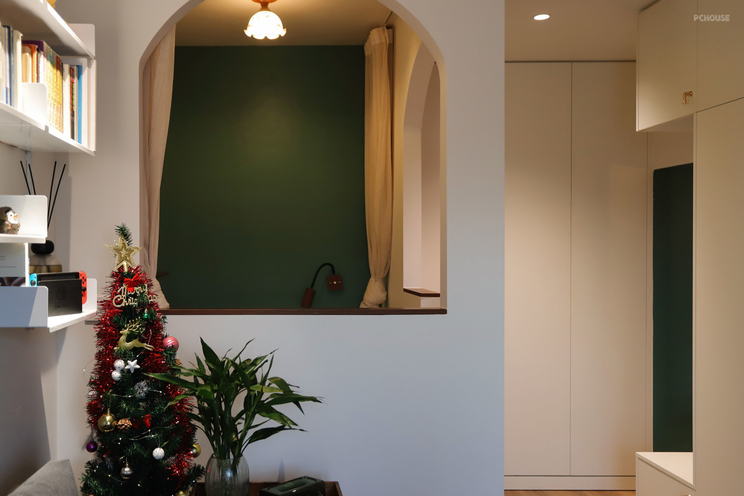 我们在卧室和客厅的隔墙做了造型窗洞,坐在沙发上刚好看到卧室的装饰吊灯,这样隔出卧室也不会显得客厅空间小,还能让空间相互联系。