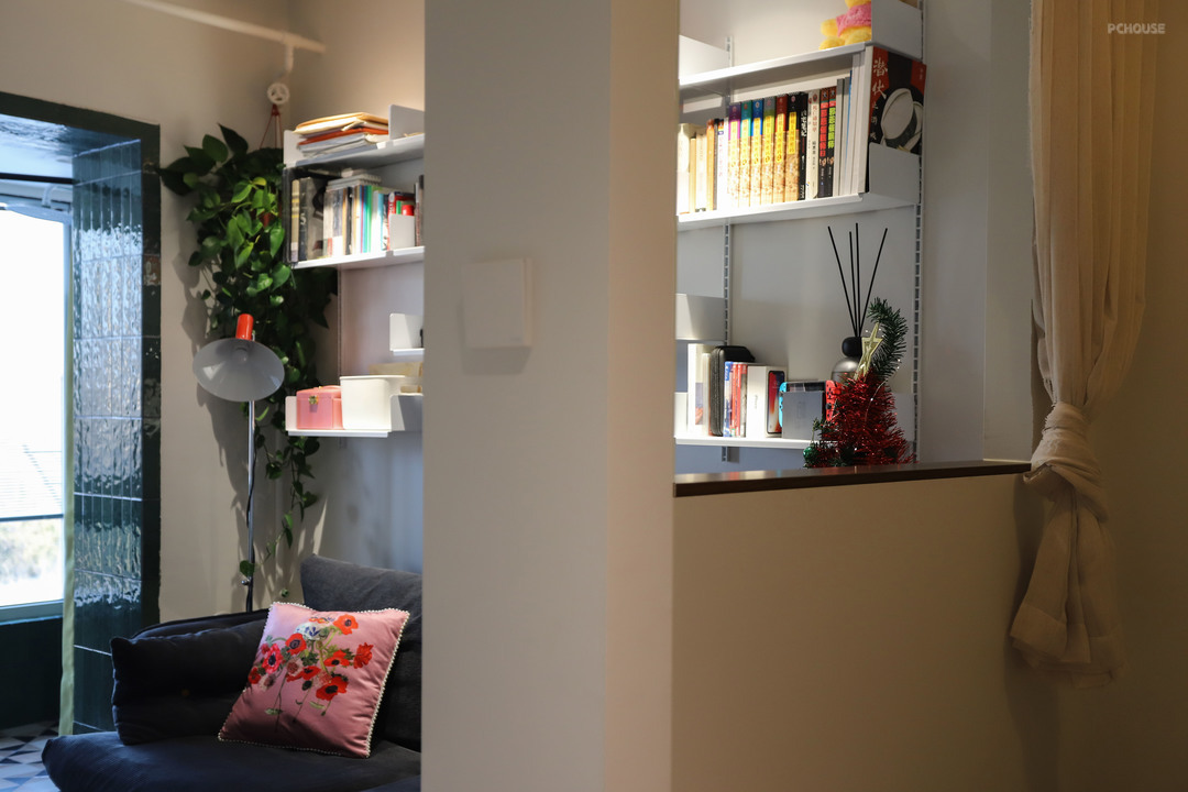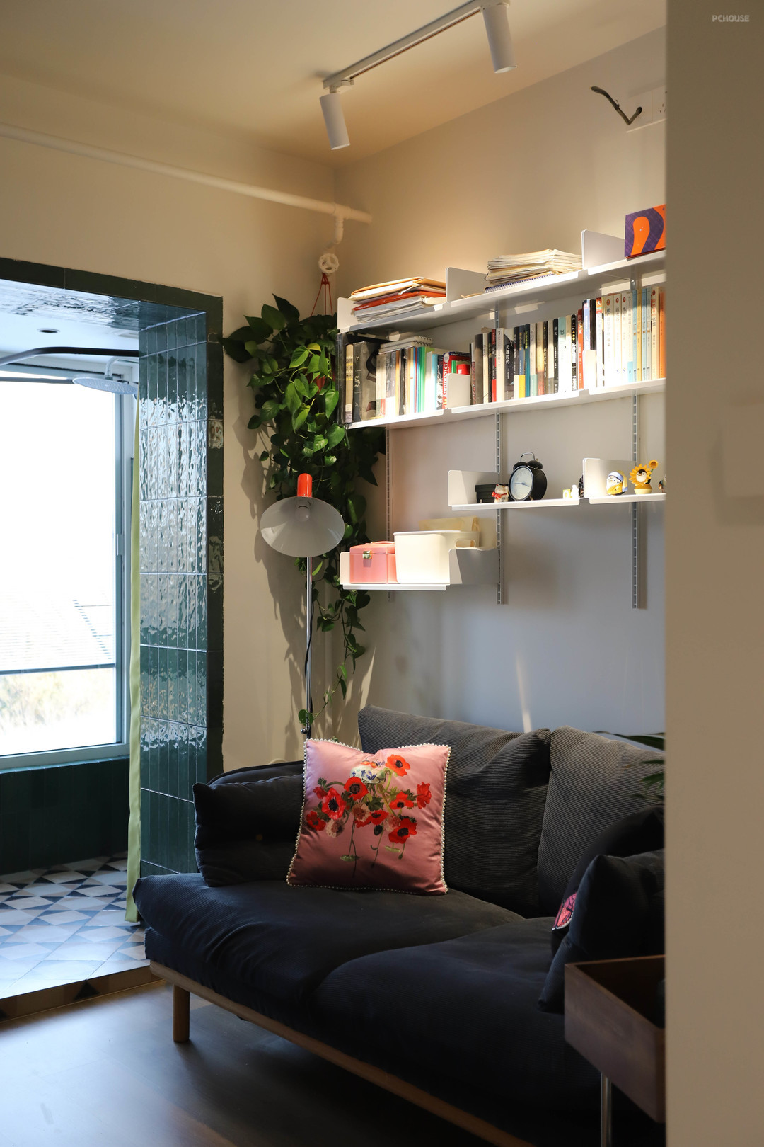 原来整个的客厅空间我们规划出客厅、卧室、走廊三个大空间,客厅安排在靠窗的位置。沙发背后我们用了金属轨道置物架,节省成本还能随意调节层板间隔。客厅用的是轨道射灯,沙发对面吊顶我们做了隐藏的幕布盒,看电影的时候可以只开旁边的落地灯,小家也有私人影院哦。