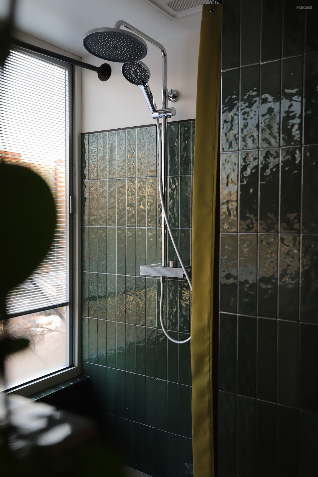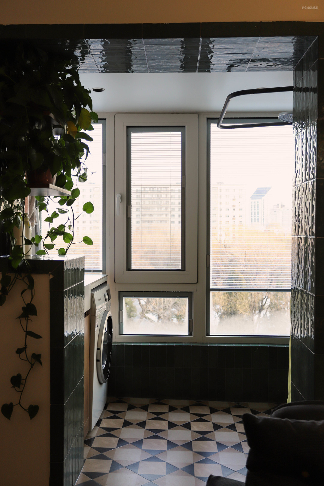 阳台地面和墙面都做了防水,整个阳台的垭口贴了瓷砖做保护,阳台地面整体抬高做了坡度,淋浴还用了U型的浴帘,完全不用担心水会溅出来。阳台的窗帘用的是内置百叶,保护隐私的同时不用担心溅水不好打理。