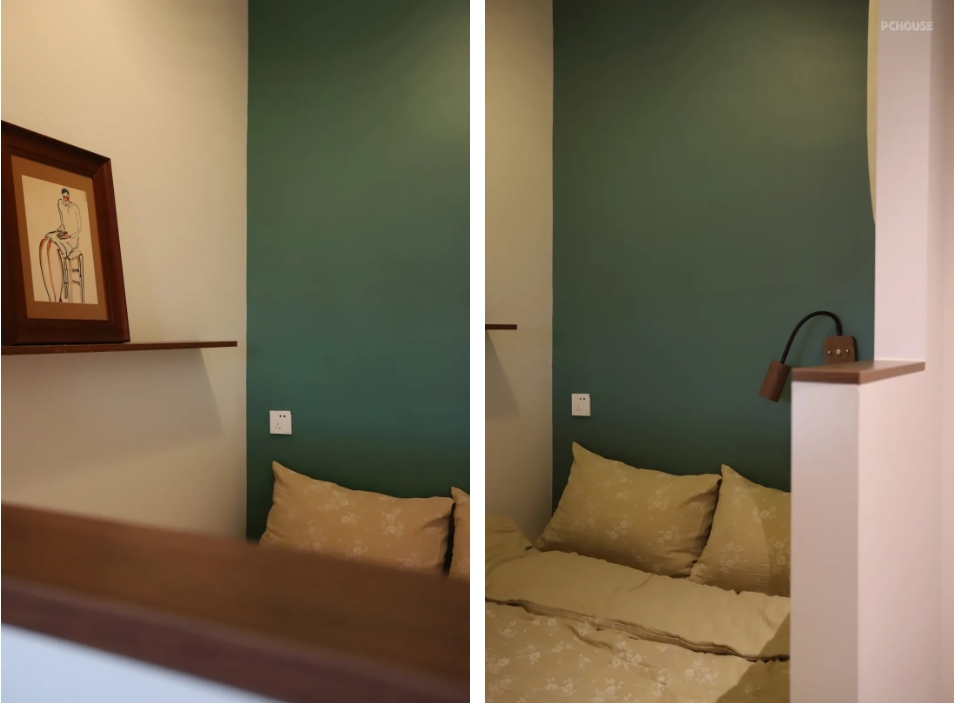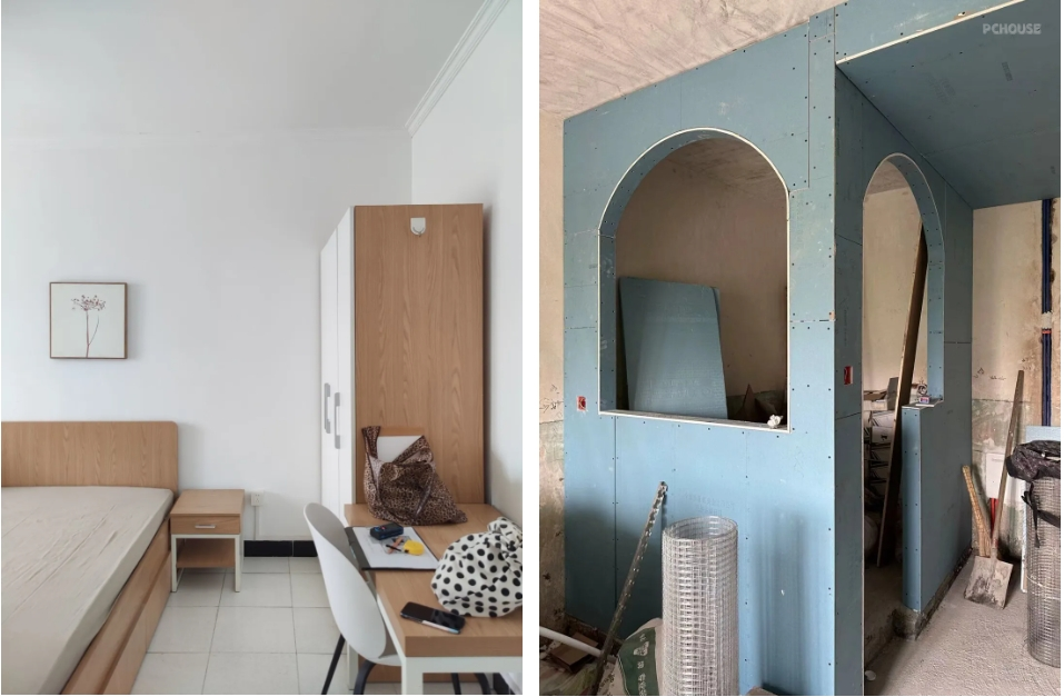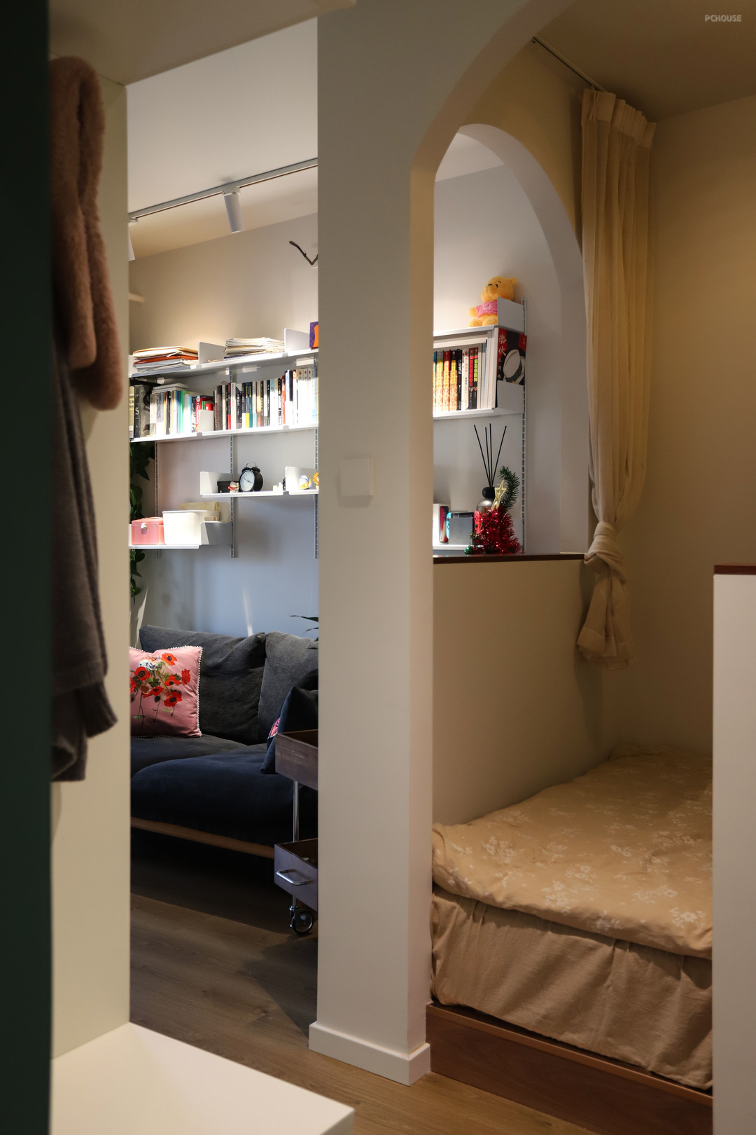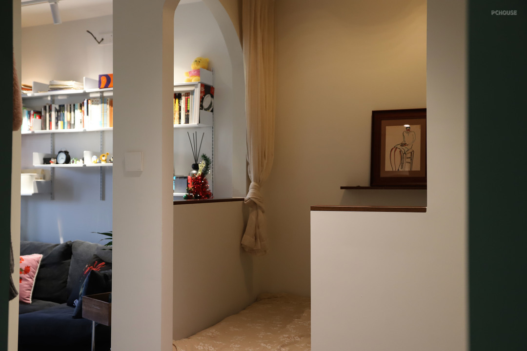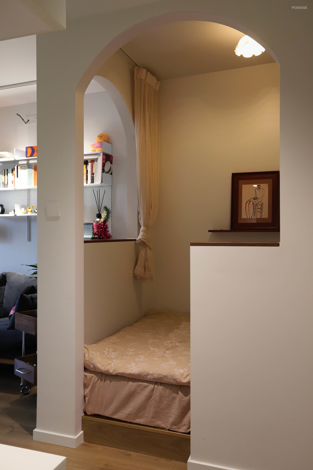 卧室做了半包围的隔墙,门窗洞口做了弧形造型,美观还有利于通风。卧室直接砌筑了高150mm的地台没有用成品床,卧室宽1550mm,长2050mm,俩人睡也没问题。