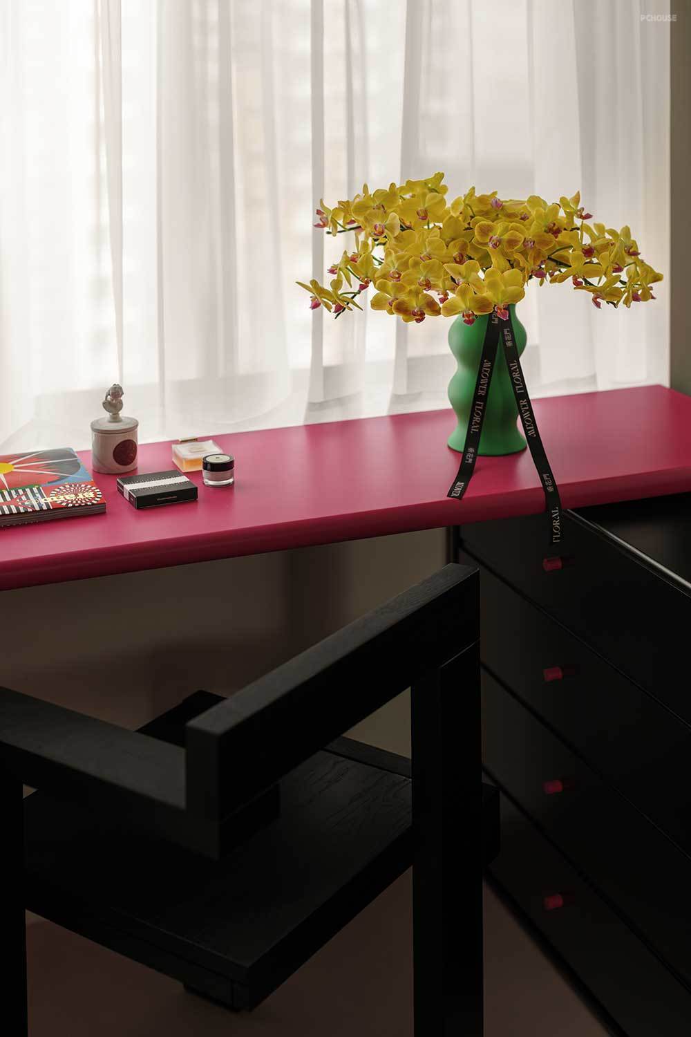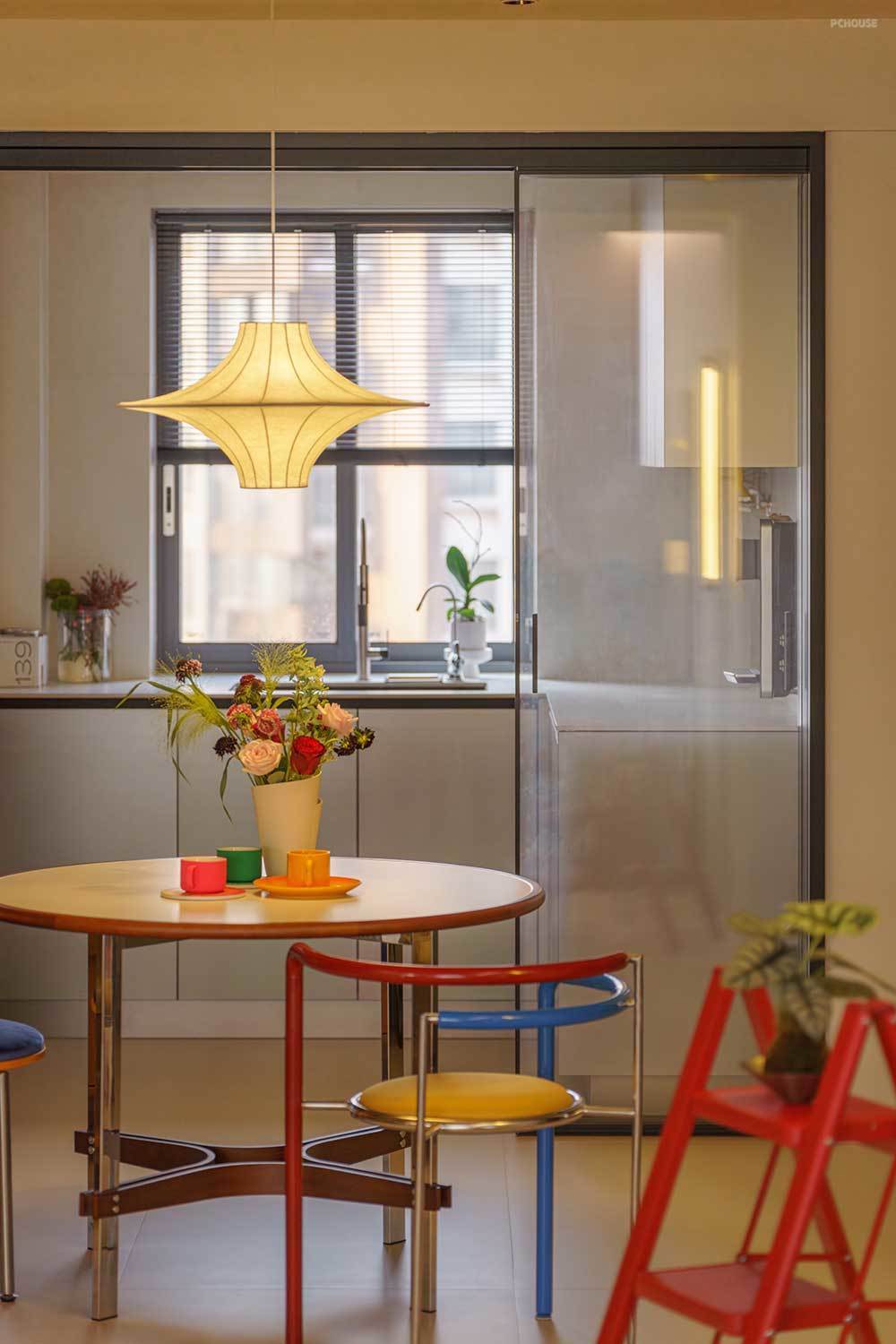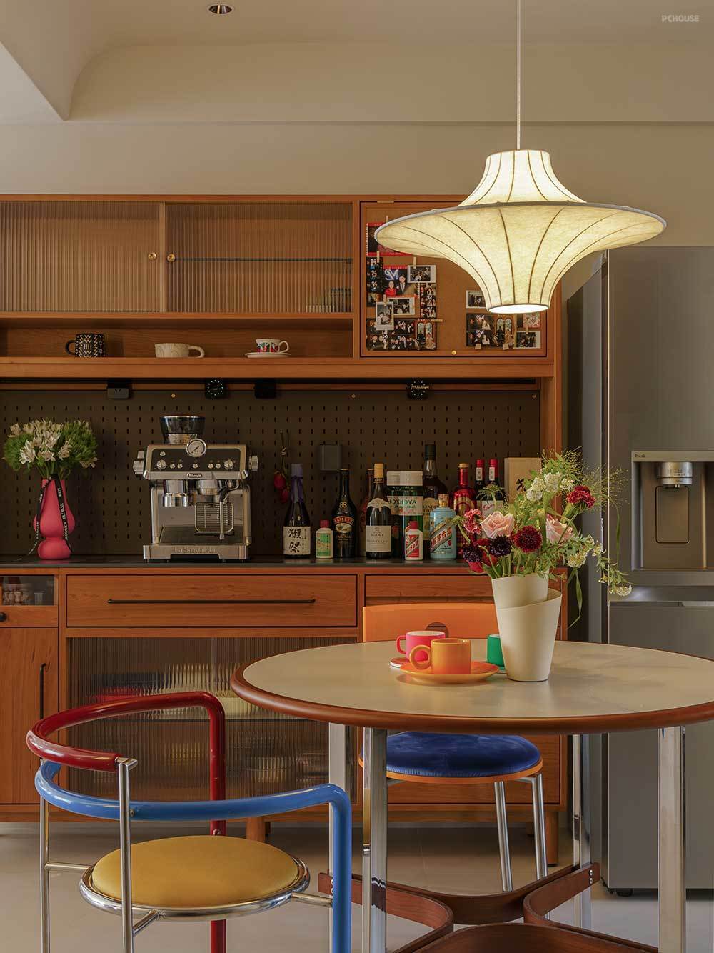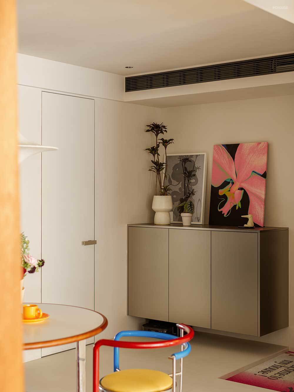 餐厅的配色设计师来回选了很多次,孟菲斯的运用,在整个空间发挥地非常巧妙和谐;餐边柜是在设计之前业主选购好了的产品,所以设计师会利用业主的一些喜好,做一个整体的搭配;
