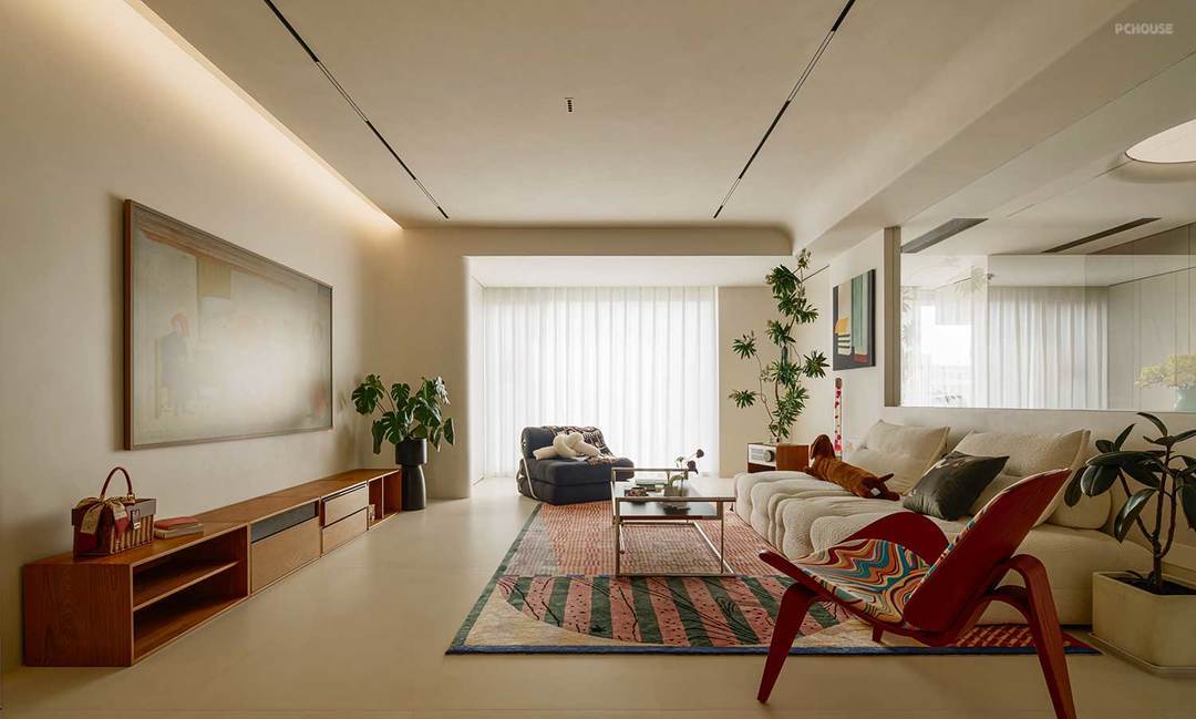 暖色调的整屋,加上一些复古且色调俏皮的软装,客厅的感受就是开阔,小资,艺术;全屋包括顶面/墙面/地面统一一种色调,放眼望去是整体且风格大气的感受;