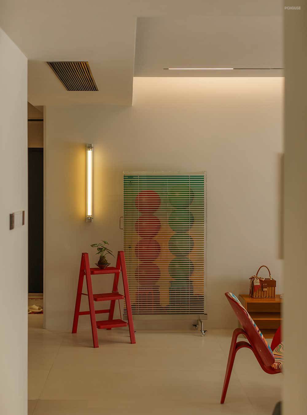 业主是前卫的年轻夫妻,女业主有收藏一些复古相机,画报,杂志等。对混搭的折衷主义情有独钟,其中运用了部分孟菲斯风格的元素,它充满活力,色彩大胆,常常运用鲜艳的红,蓝,黄等色彩,营造活力四射的氛围。