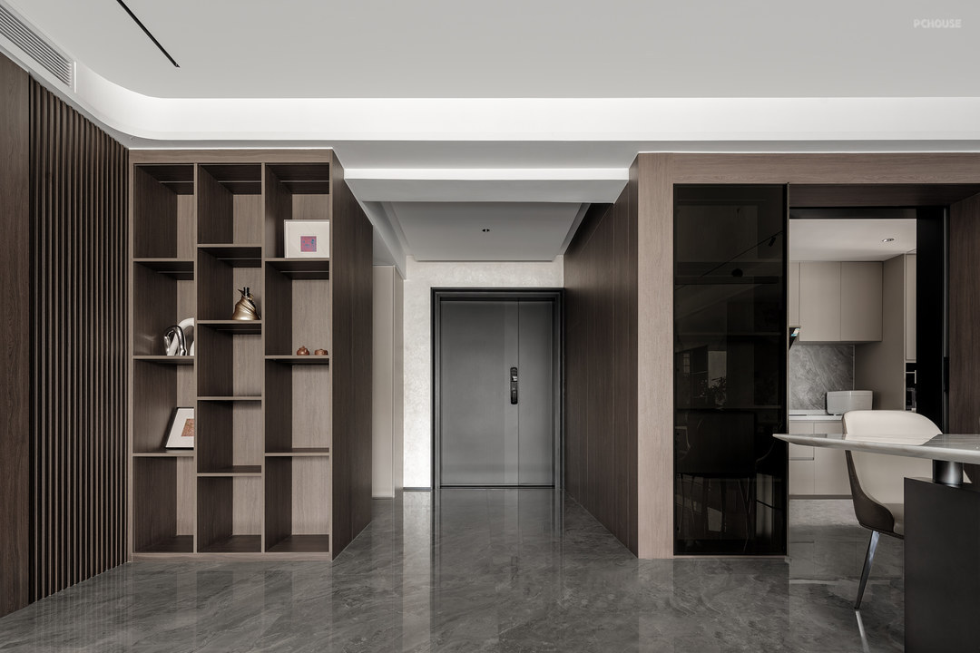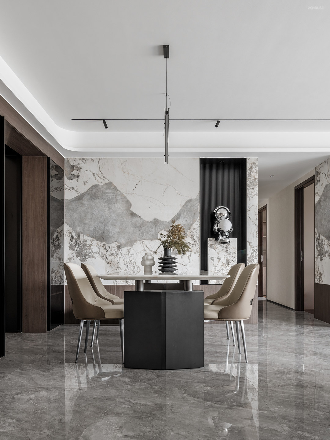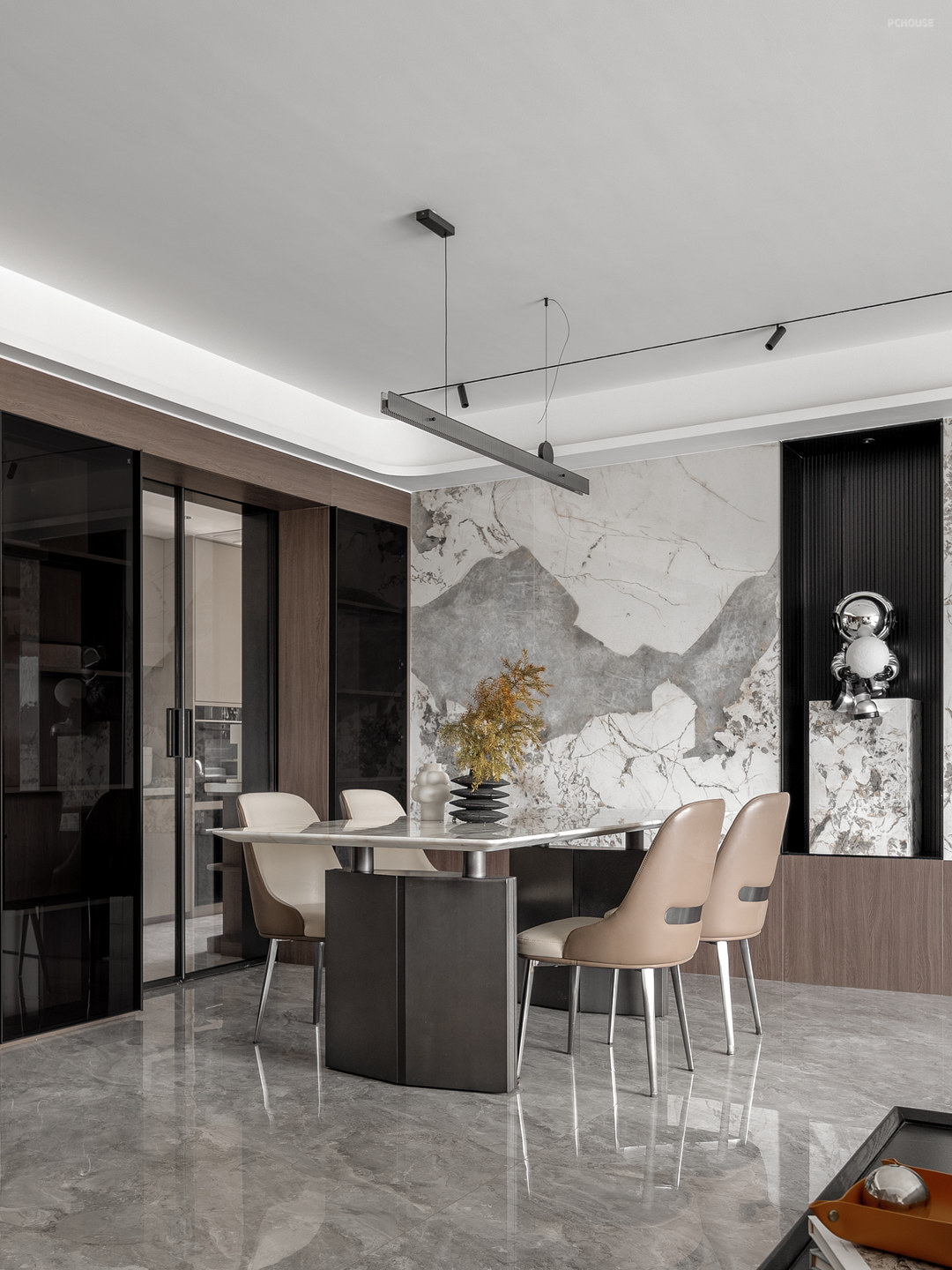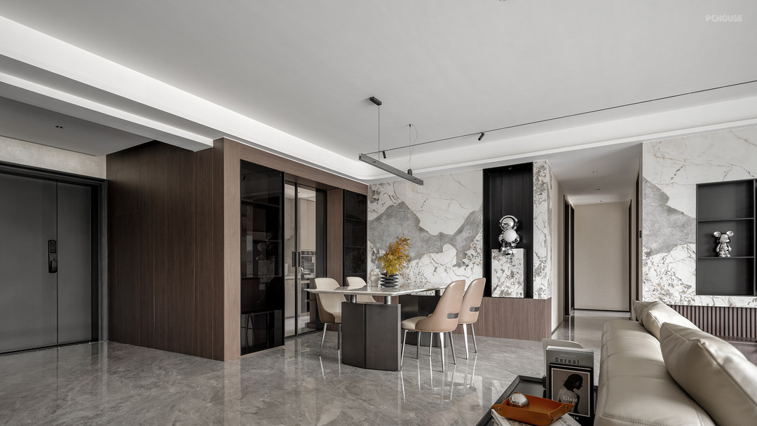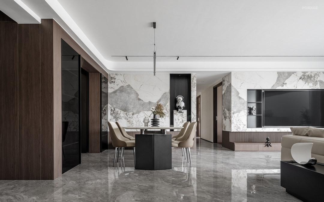 横向大开间的客餐空间,被中间的过道隔开,通过不同的材质进行比例分割使得背景统一规整,整体视觉延伸感强。感官上低调奢华,更符合业主现代都市生活格调。