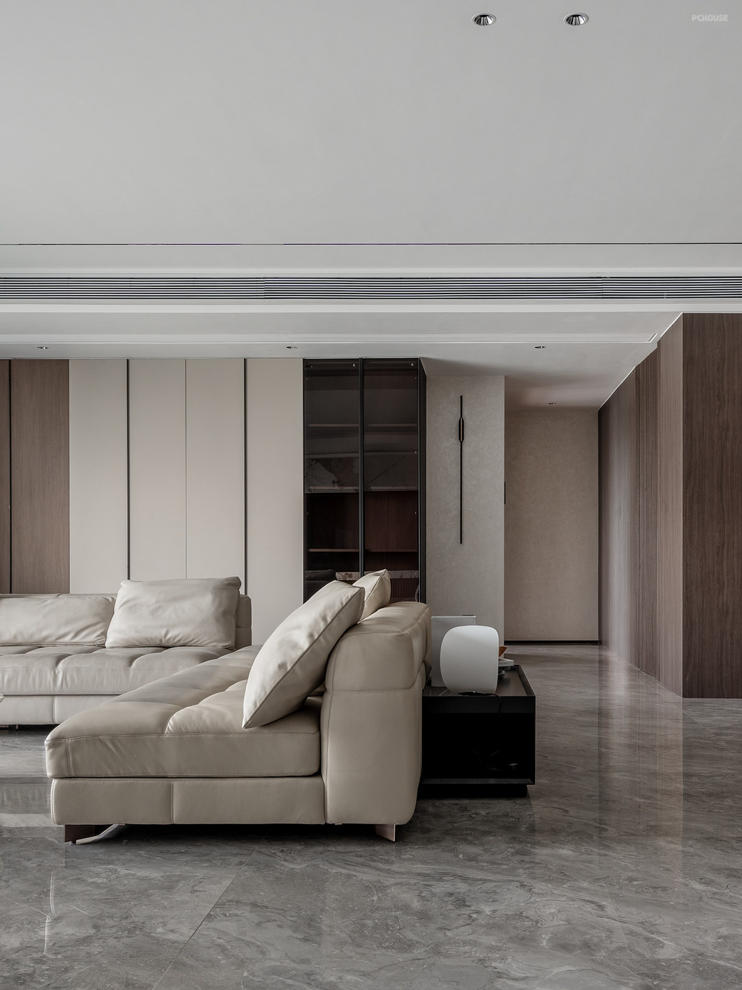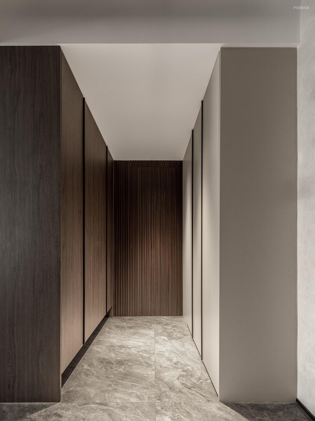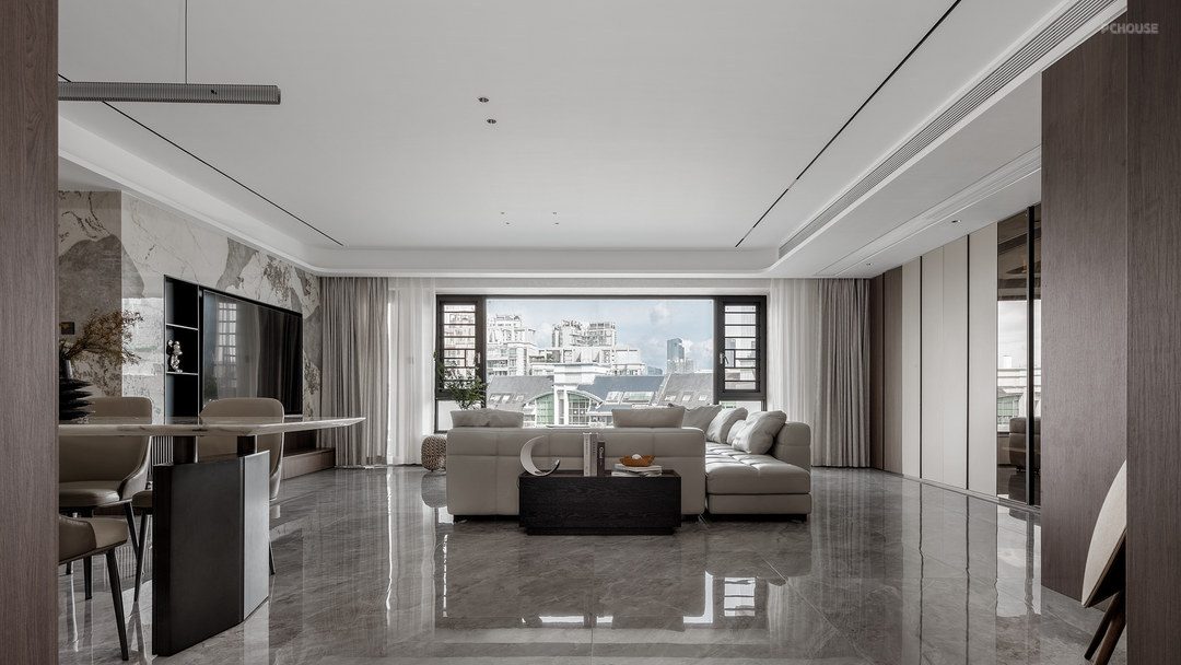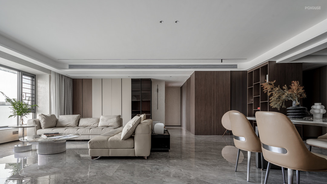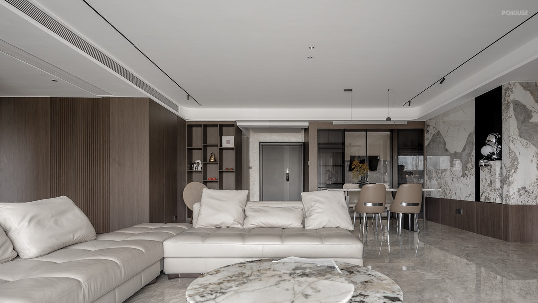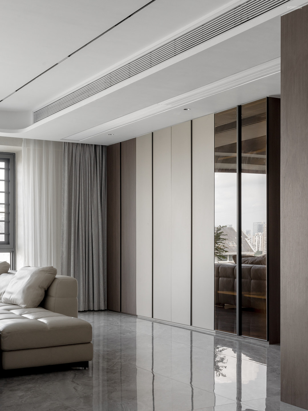 横向大开间的客餐空间,被中间的过道隔开,通过不同的材质进行比例分割使得背景统一规整,整体视觉延伸感强。感官上低调奢华,更符合业主现代都市生活格调。