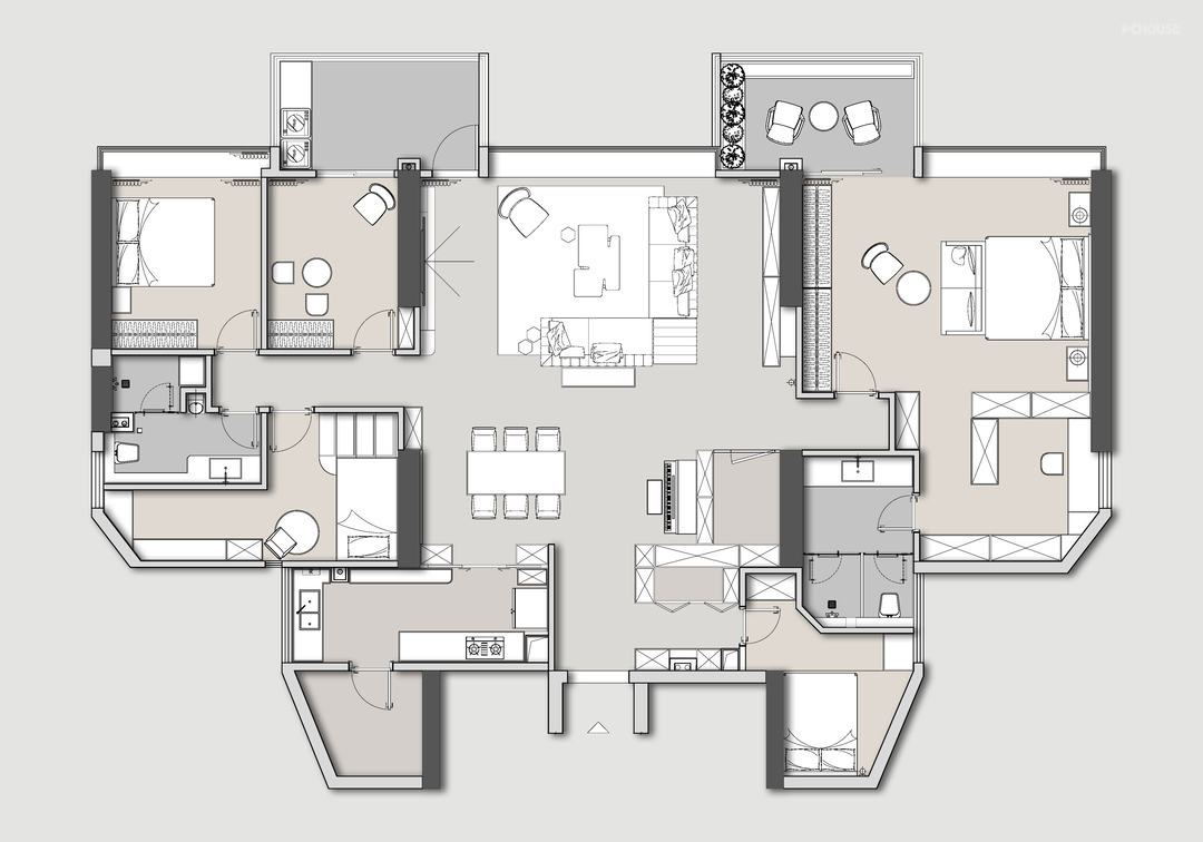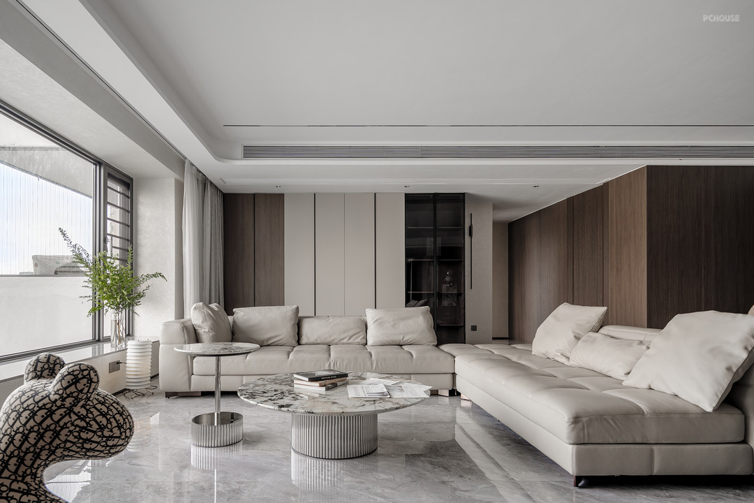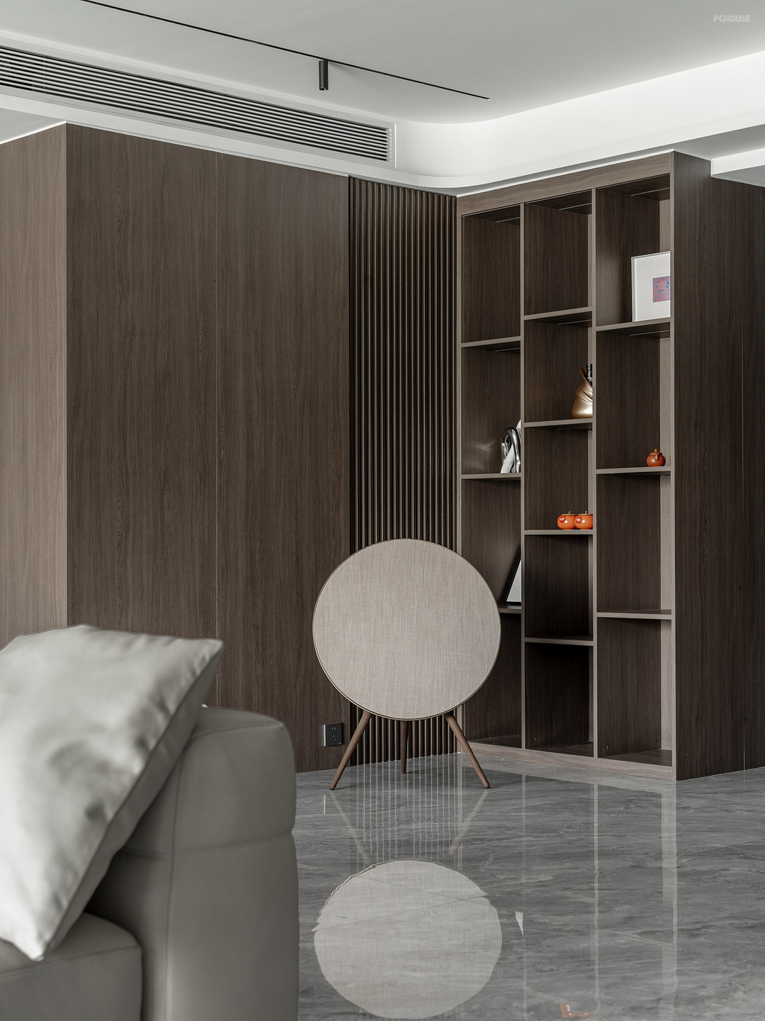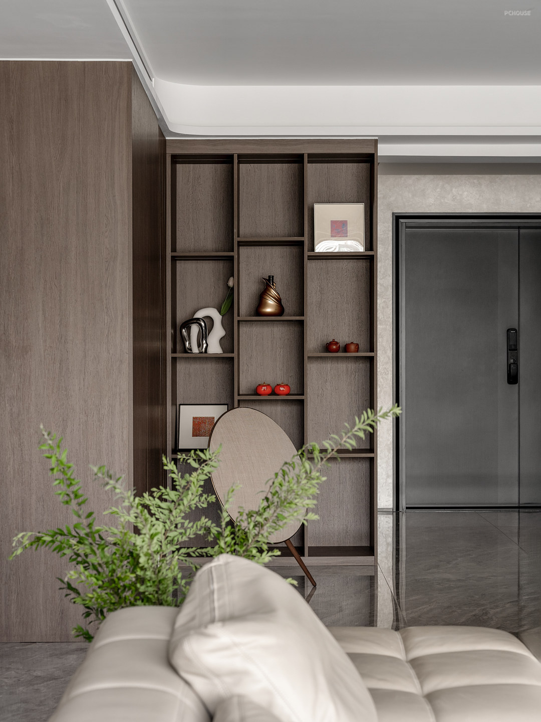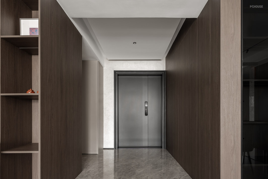 横向大开间的客餐空间,被中间的过道隔开,通过不同的材质进行比例分割使得背景统一规整,整体视觉延伸感强。感官上低调奢华,更符合业主现代都市生活格调。
