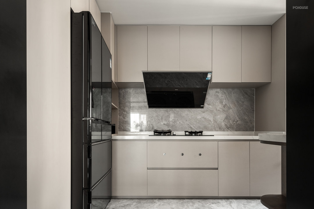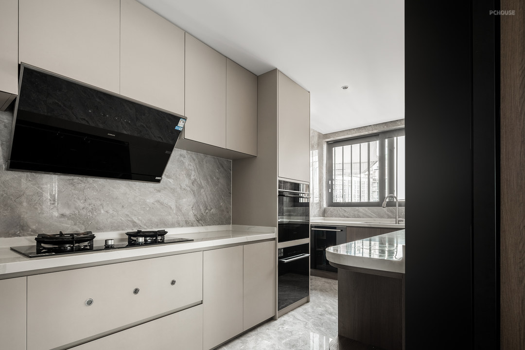 独立的中厨,对比外面的深色沉稳的木饰面,厨房材质选择更为素雅干净的浅咖色。面朝阳光,于人间烟火感受三餐四季,叹人生冷暖。