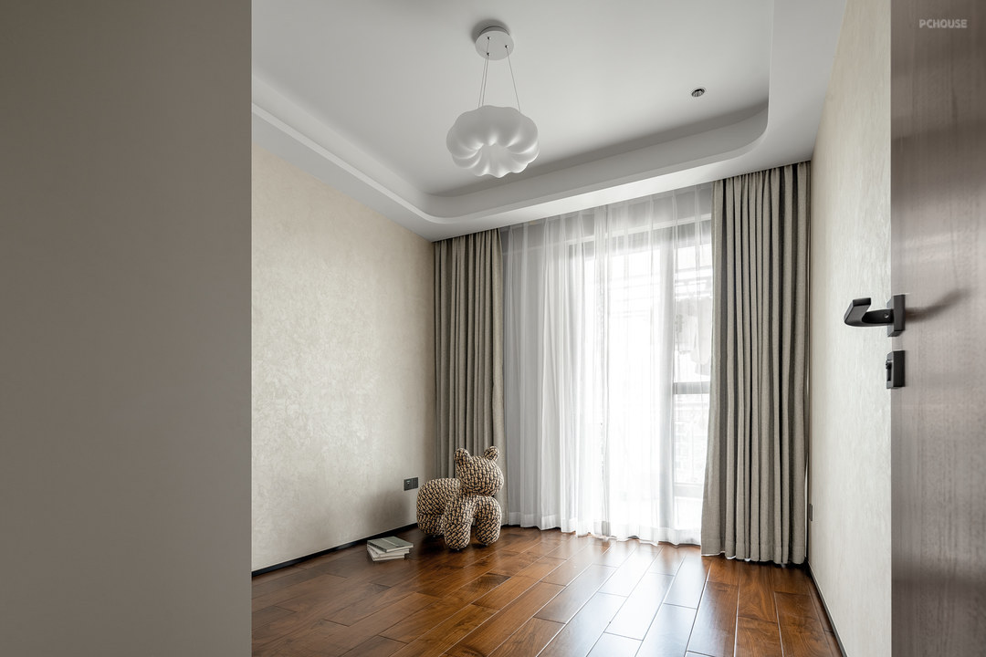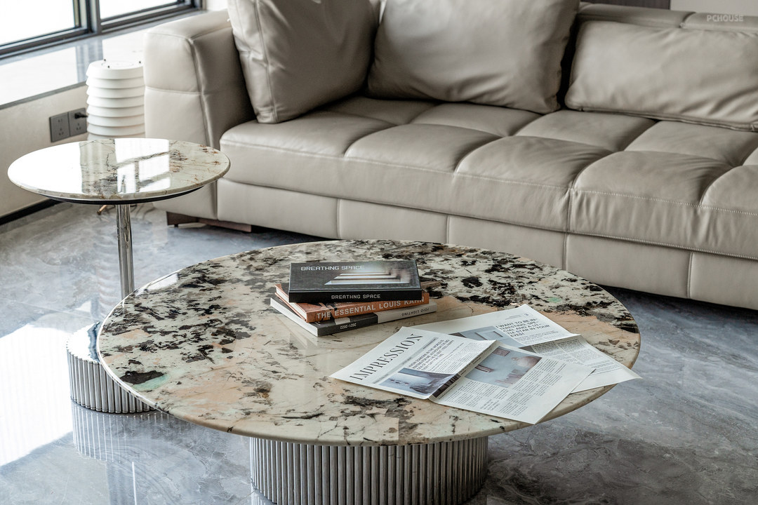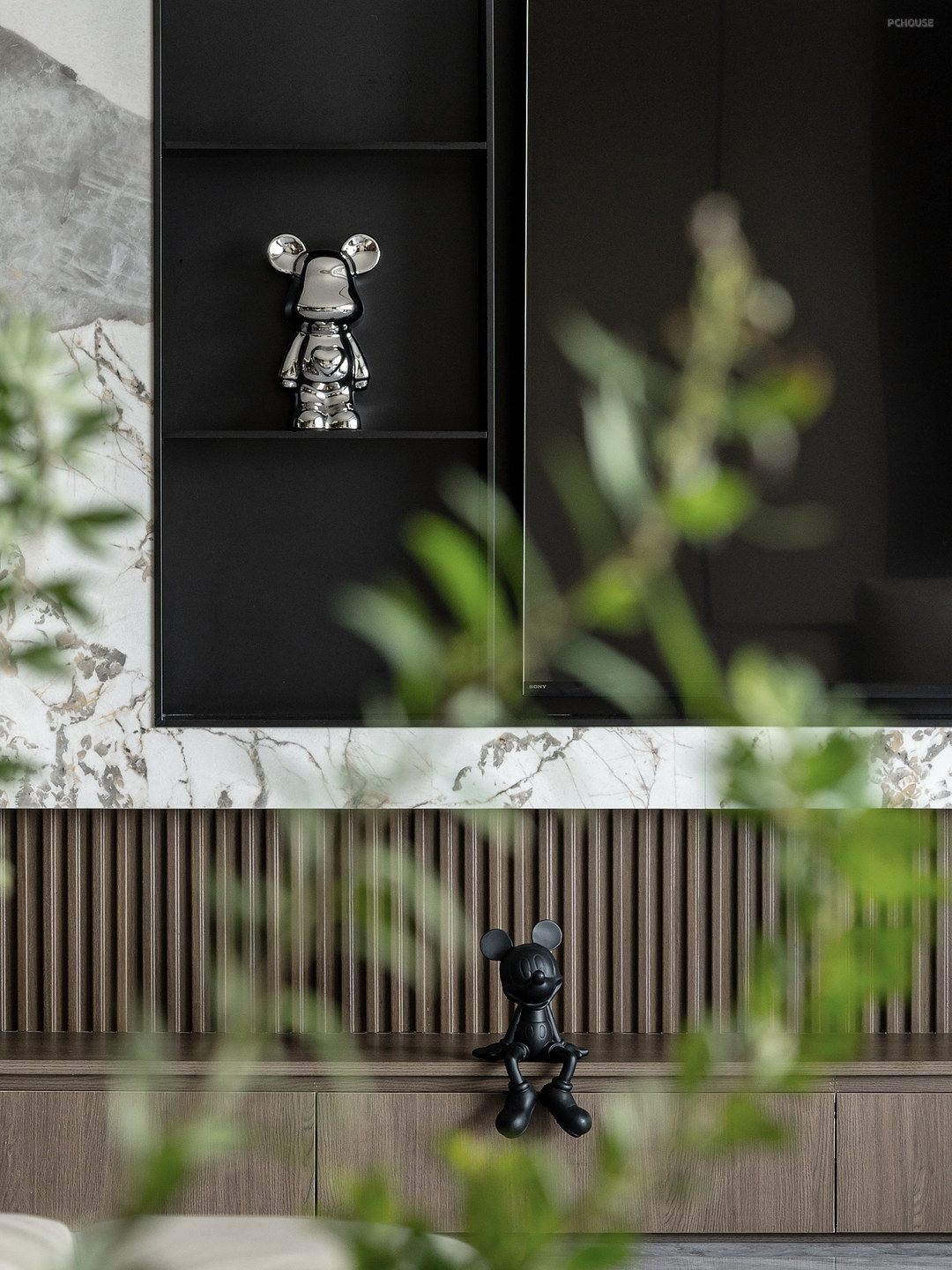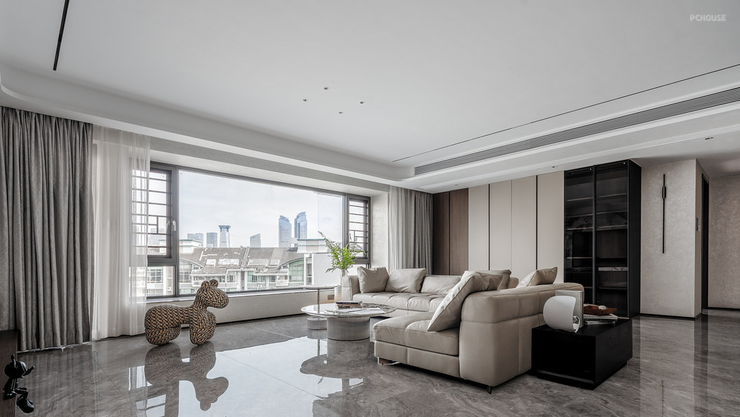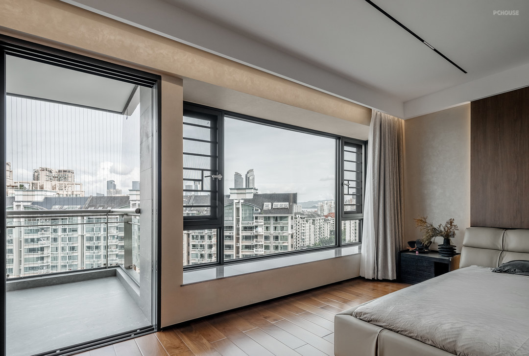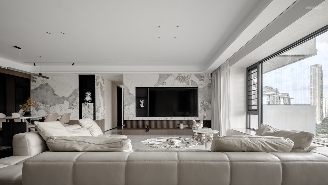 在原本冰冷的钢筋水泥里,为了让空间内的优点得到一个最大的展示。不断在空间内来回感受,最终与业主的达成一致的方向,打开客厅景观面,踏入房子的那一瞬间大面采光玻璃将外景收入眼帘。