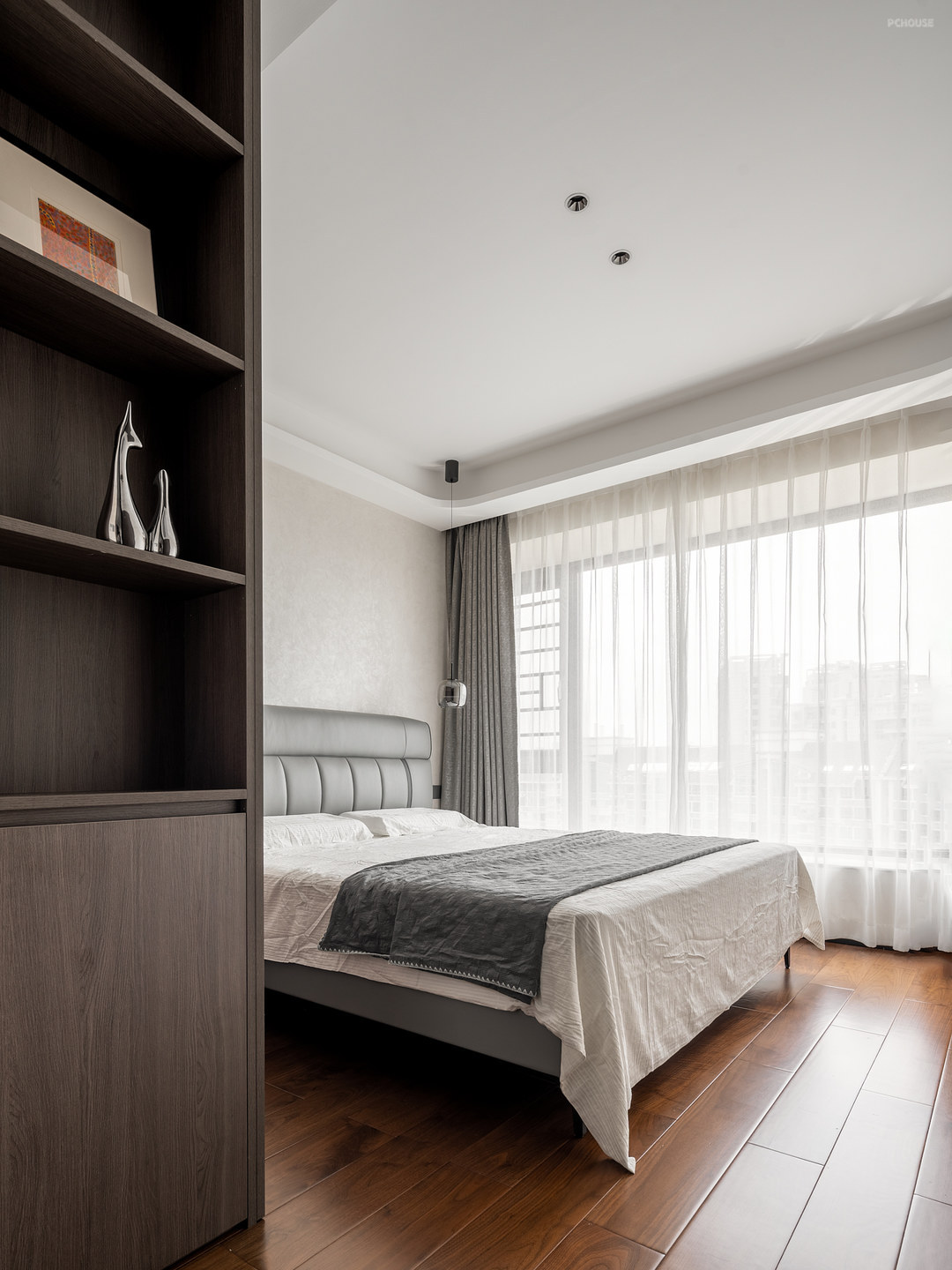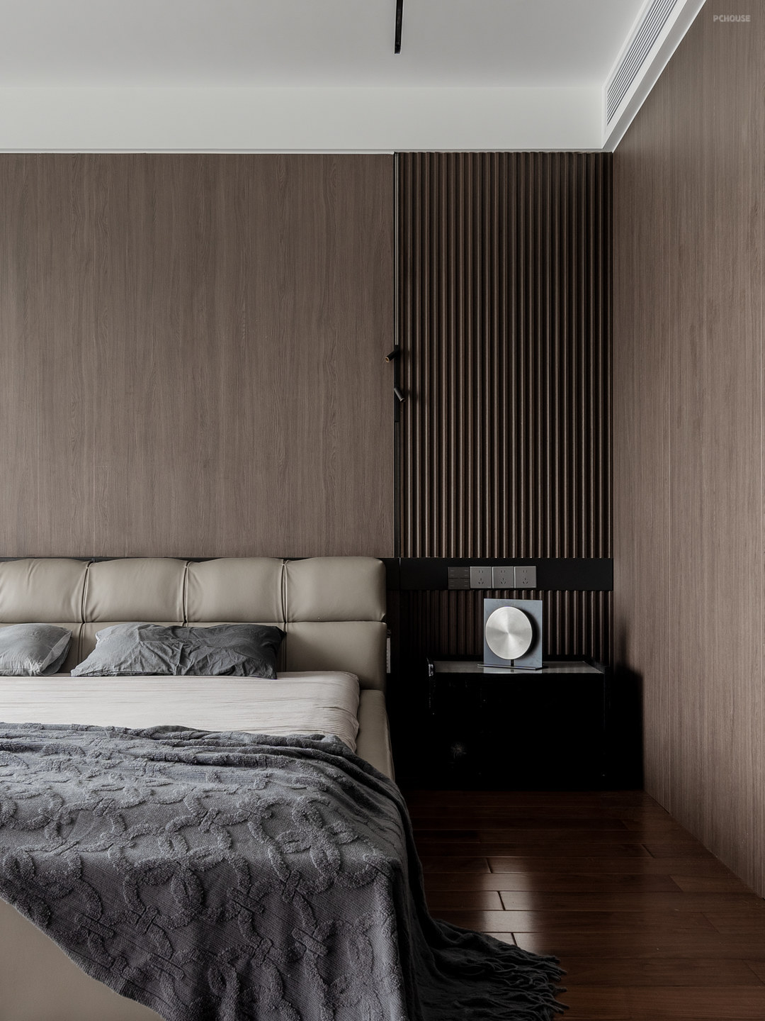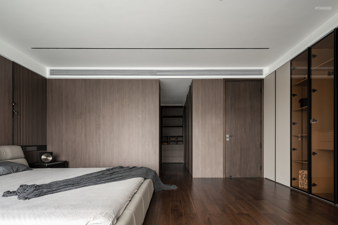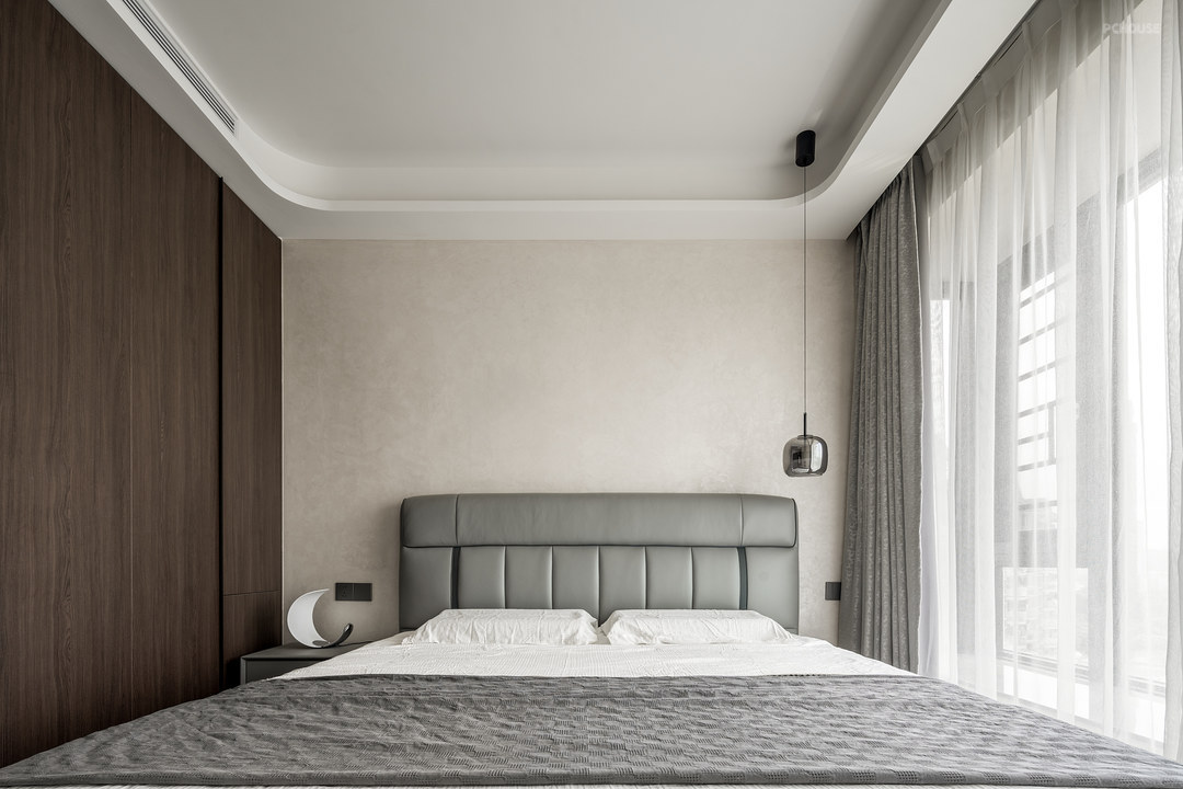 延续空间色调,以极简几何体块划分功能空间,形成有序的视觉效果。利用空间不太规整的暗区空间作为主卧独立衣帽间,保证卧室高质量睡眠区域。安静舒适的睡眠区让紧绷的都市生活松弛下来。