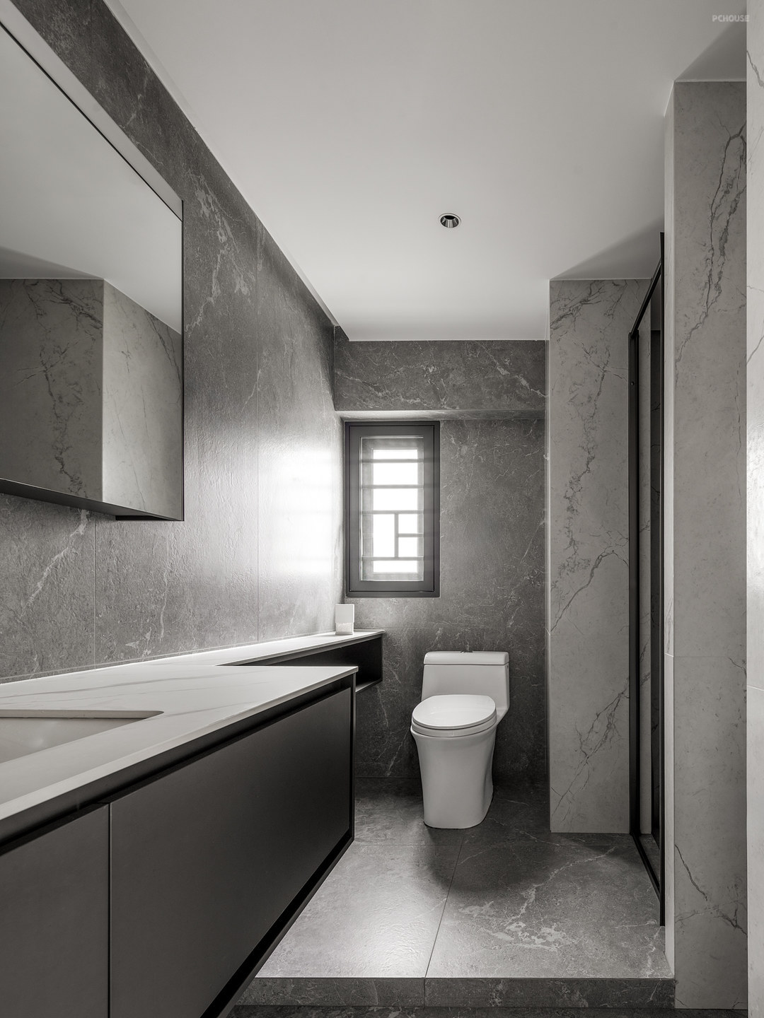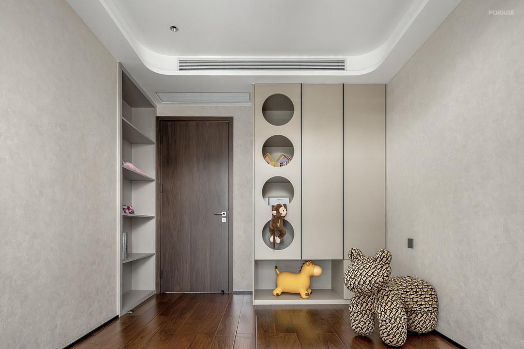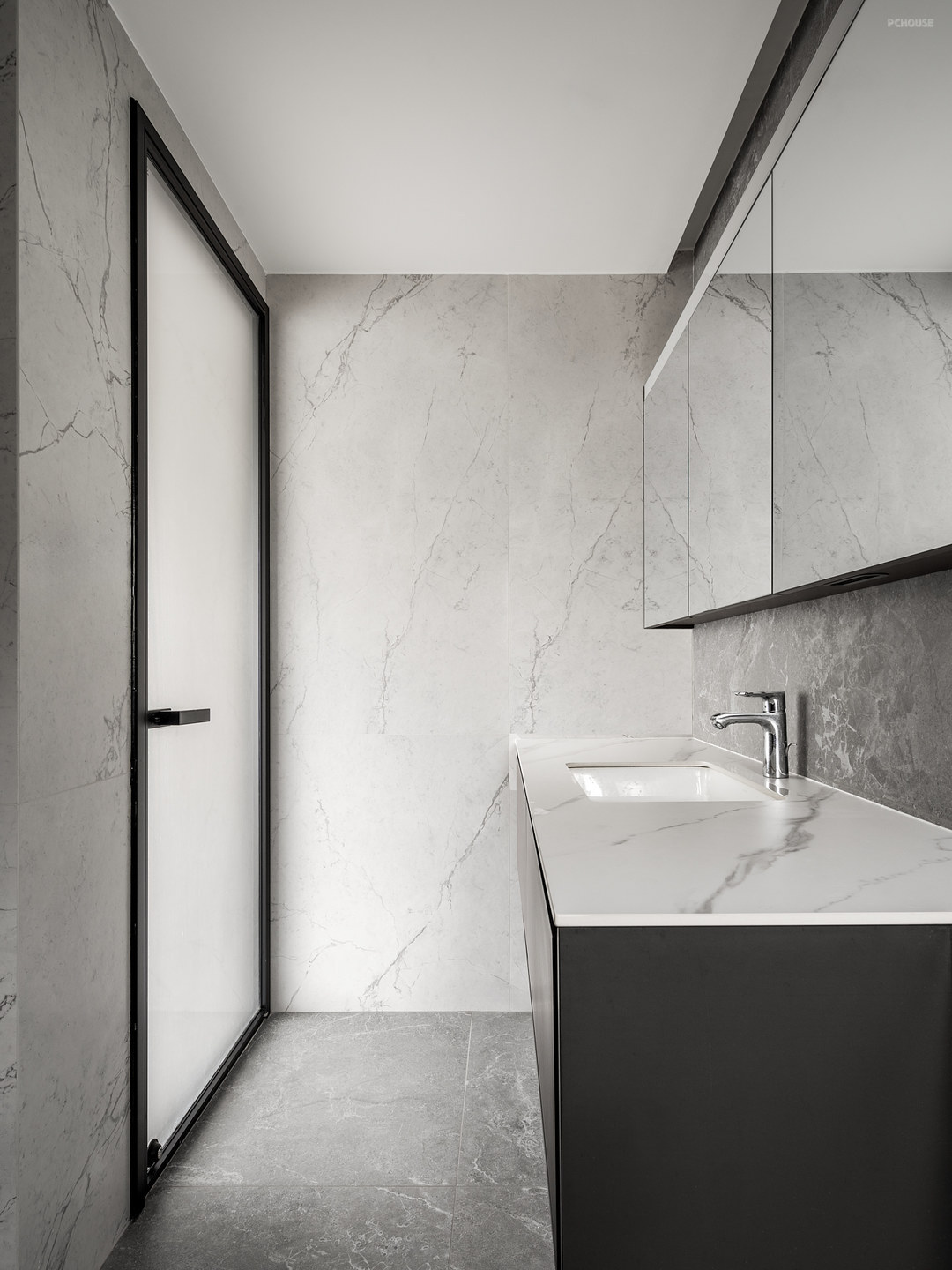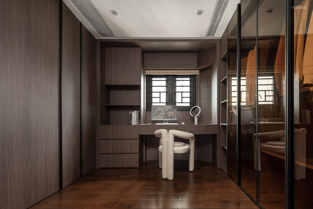 延续空间色调,以极简几何体块划分功能空间,形成有序的视觉效果。利用空间不太规整的暗区空间作为主卧独立衣帽间,保证卧室高质量睡眠区域。安静舒适的睡眠区让紧绷的都市生活松弛下来。