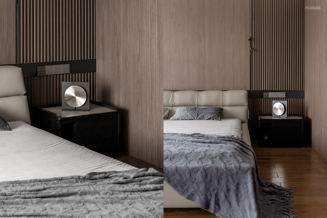 背景置入有序格栅,打破原本呆板得平板护墙。像是有韵律的起伏,为空间增添一丝跳跃的符号。不锈钢装饰的穿插,细长轨道阅读灯作为分隔。